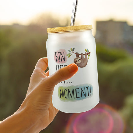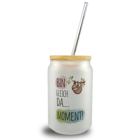 Fröhliches Faultier Bin gleich da Trinkglas mit Bambusdeckel