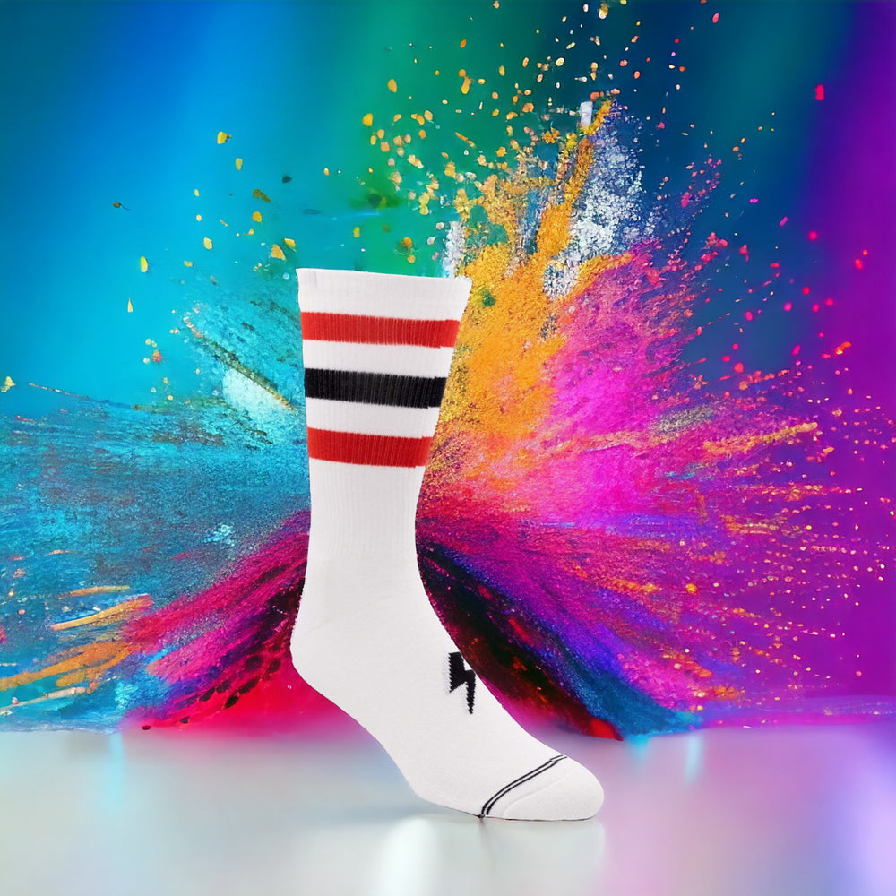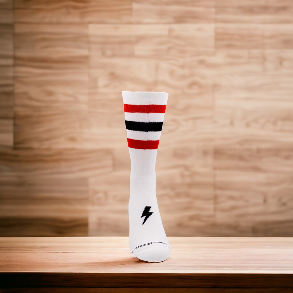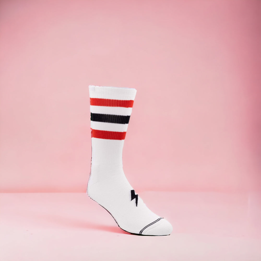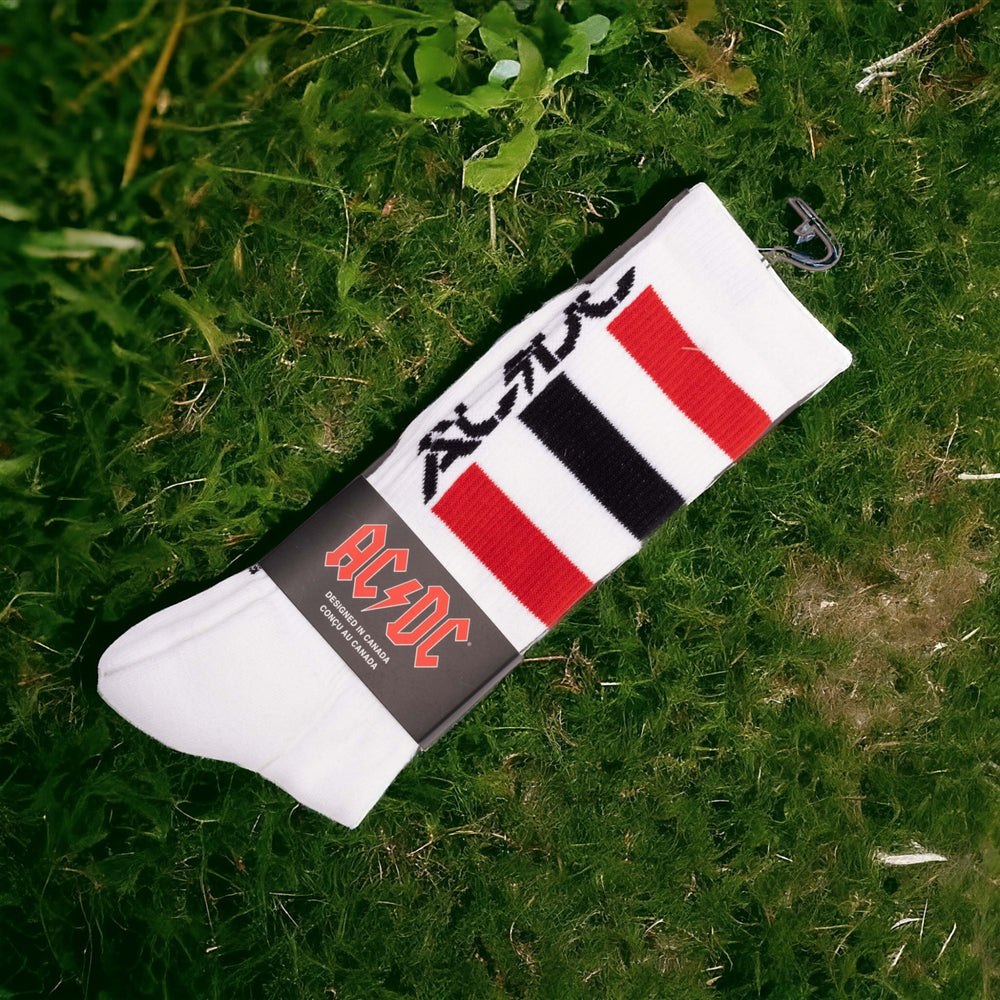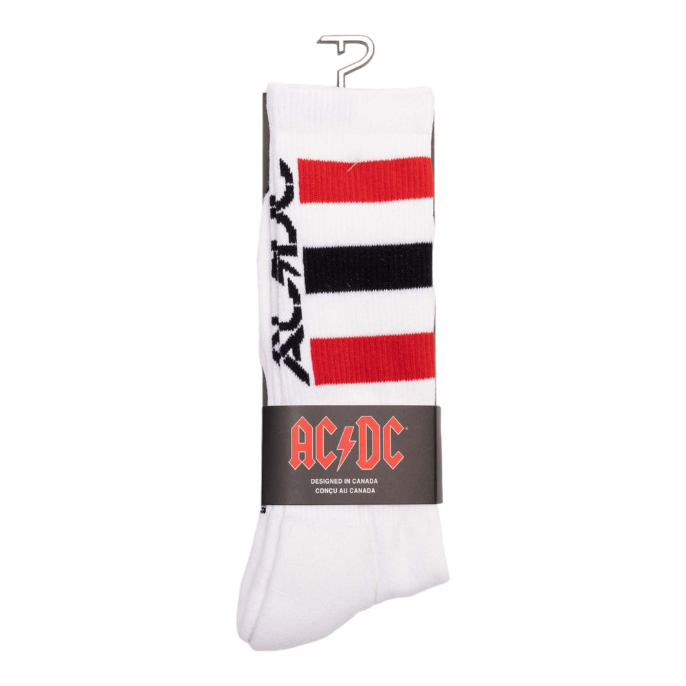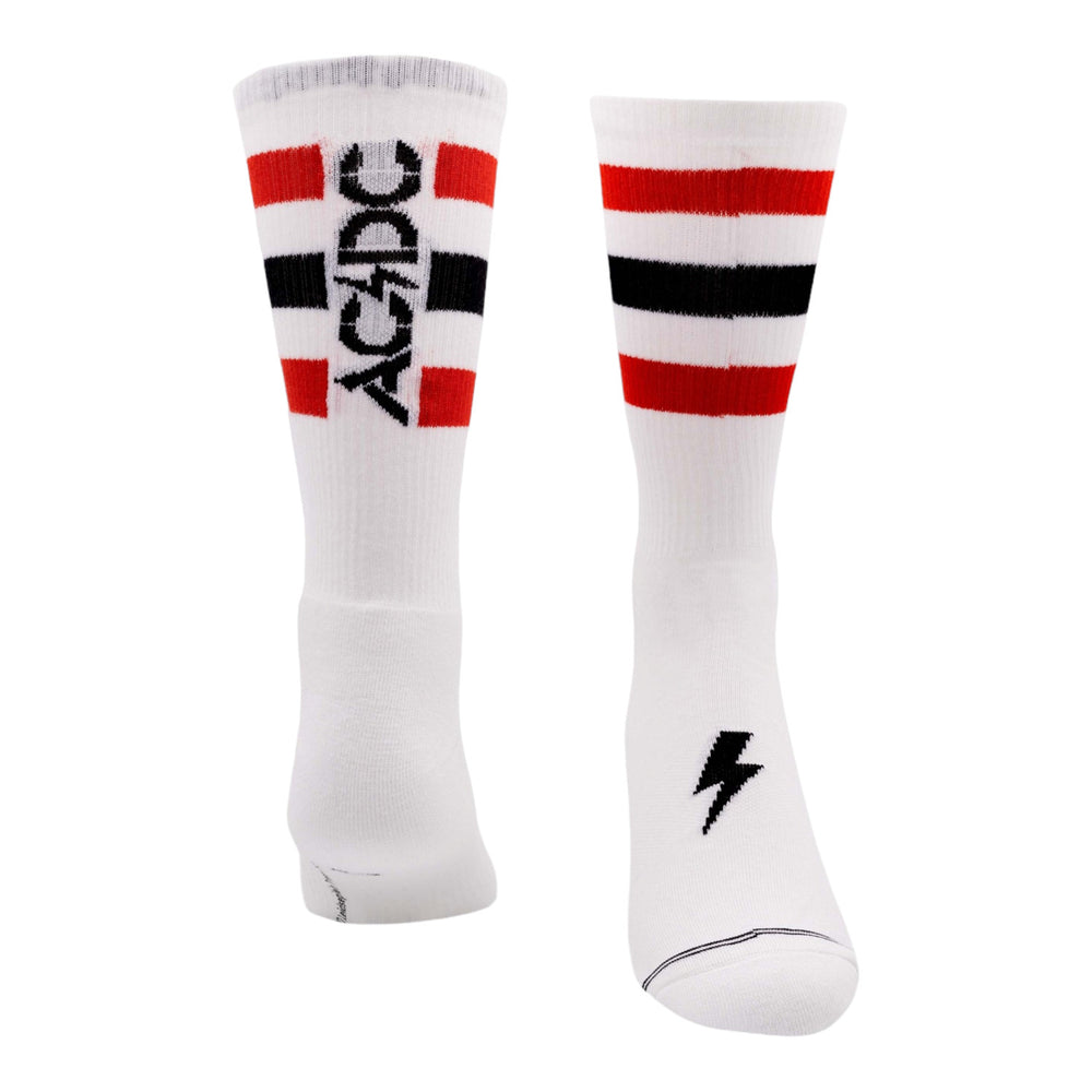 - Diese Socken schreien "Rock n Roll" mit jedem Schritt! Weißer Stoff wird zum Bühnenoutfit mit roten und schwarzen Streifen, während der legendäre AC/DC-Schriftzug deine Achillessehne ziert. Der schwarze Blitz? Ein elektrisierendes Detail, das dich in den Mode-Olymp katapultiert!