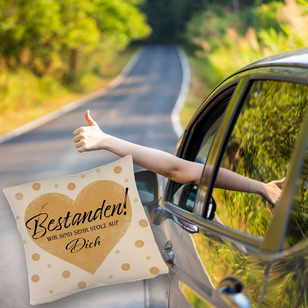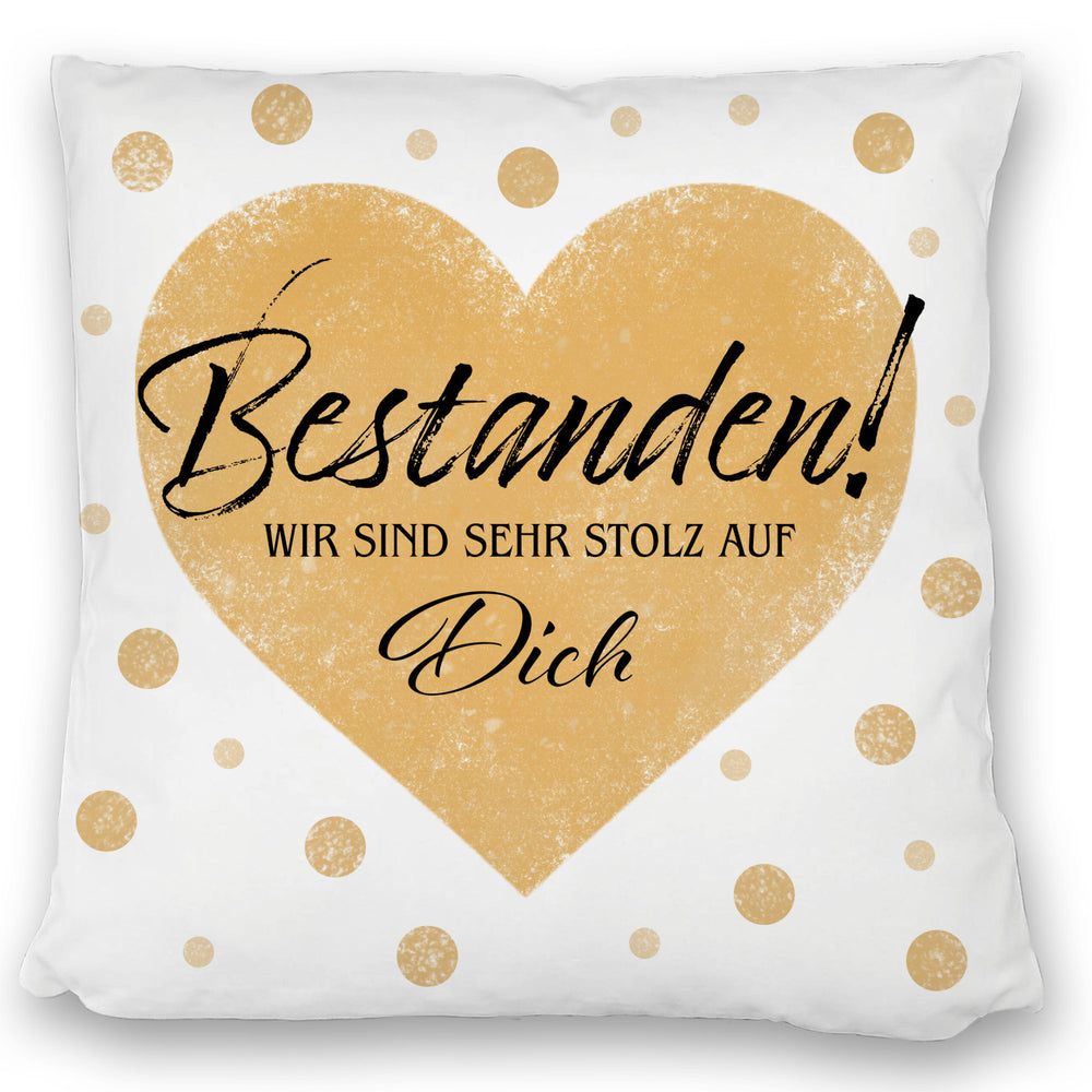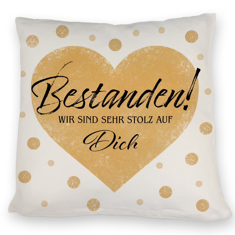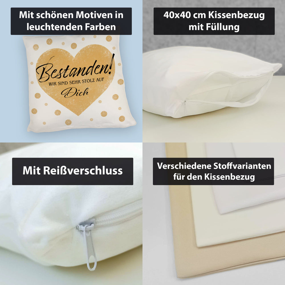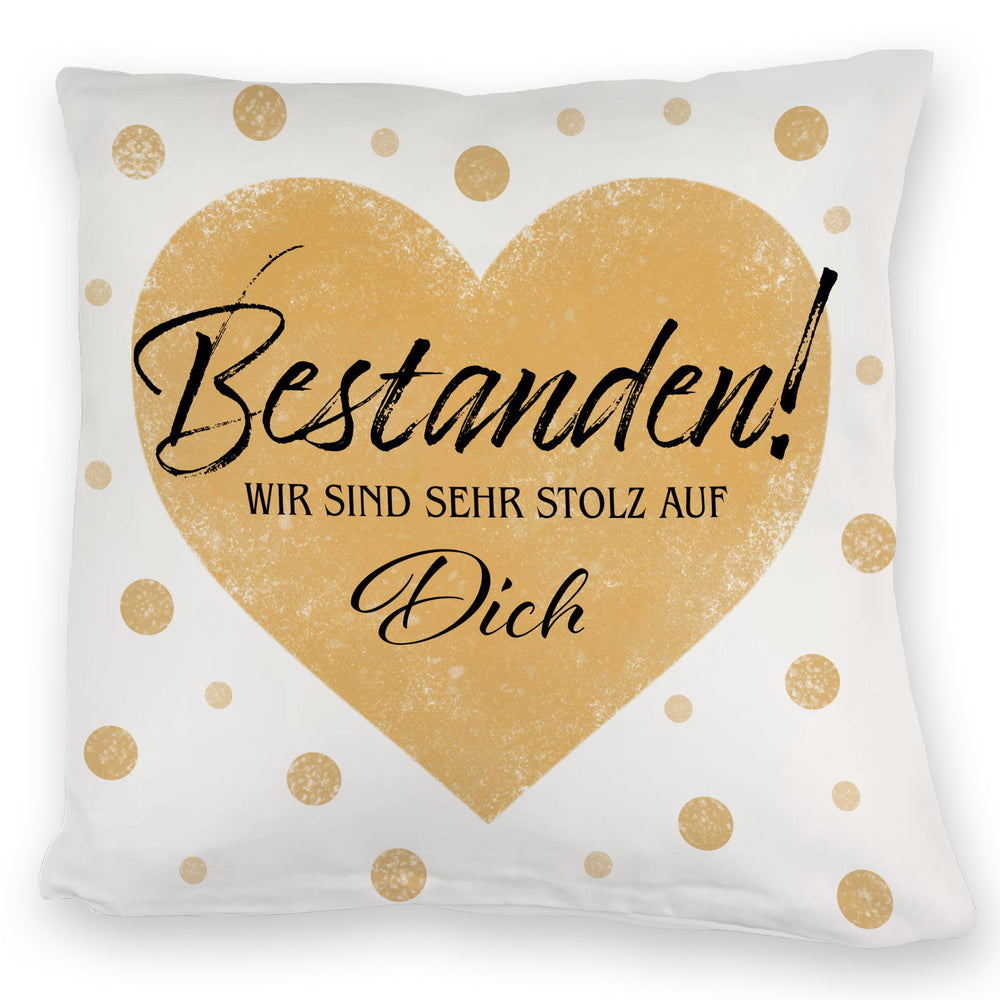 - ??? Ob Abiturientin oder Überfliegerin im Leben – unser "Bestanden Kissen" ist der weiche High-Five für Deinen Triumph! Mit seinem goldenen Herzen und frechen Punkten bringt es jede Prüfungsstress-Falte zum Glätten. Zeige Liebe und Anerkennung, ohne ein Wort zu sagen.