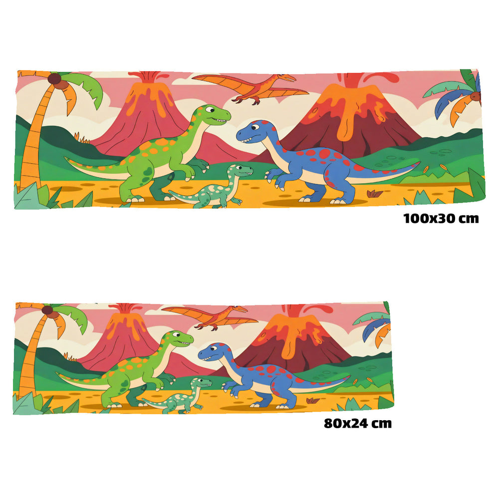 - Dieses Eishandtuch entführt Sie in die lebendige Welt der Dinosaurier! Mit einem grünen und blauen Dinosaurier im Vordergrund, die spielerisch posieren und einem Vulkan, der Lava speit, bietet es ein aufregendes Motiv. Umrahmt von üppigen Pflanzen und Palmen ist es ein echtes Highlight für Dino-Fans!