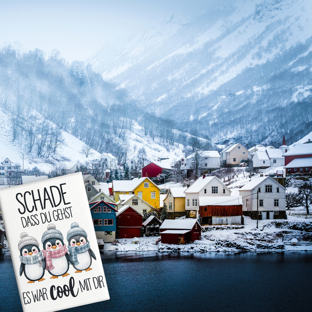 - Der Magnet trägt die witzige Aufschrift "SCHADE DASS DU GEHST ES WAR COOL MIT DIR", die jedem ein Lächeln ins Gesicht zaubert. Der weiße Hintergrund lässt die Pinguine und den Text fröhlich hervorstechen und sorgt dafür, dass diese tierischen Freunde überall die Show stehlen. Ein tolles Abschiedsgeschenk für Freunde und Kollegen.