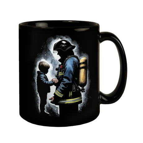 Feuerwehrmann hält die Hand seines Kindes Tasse in Schwarz