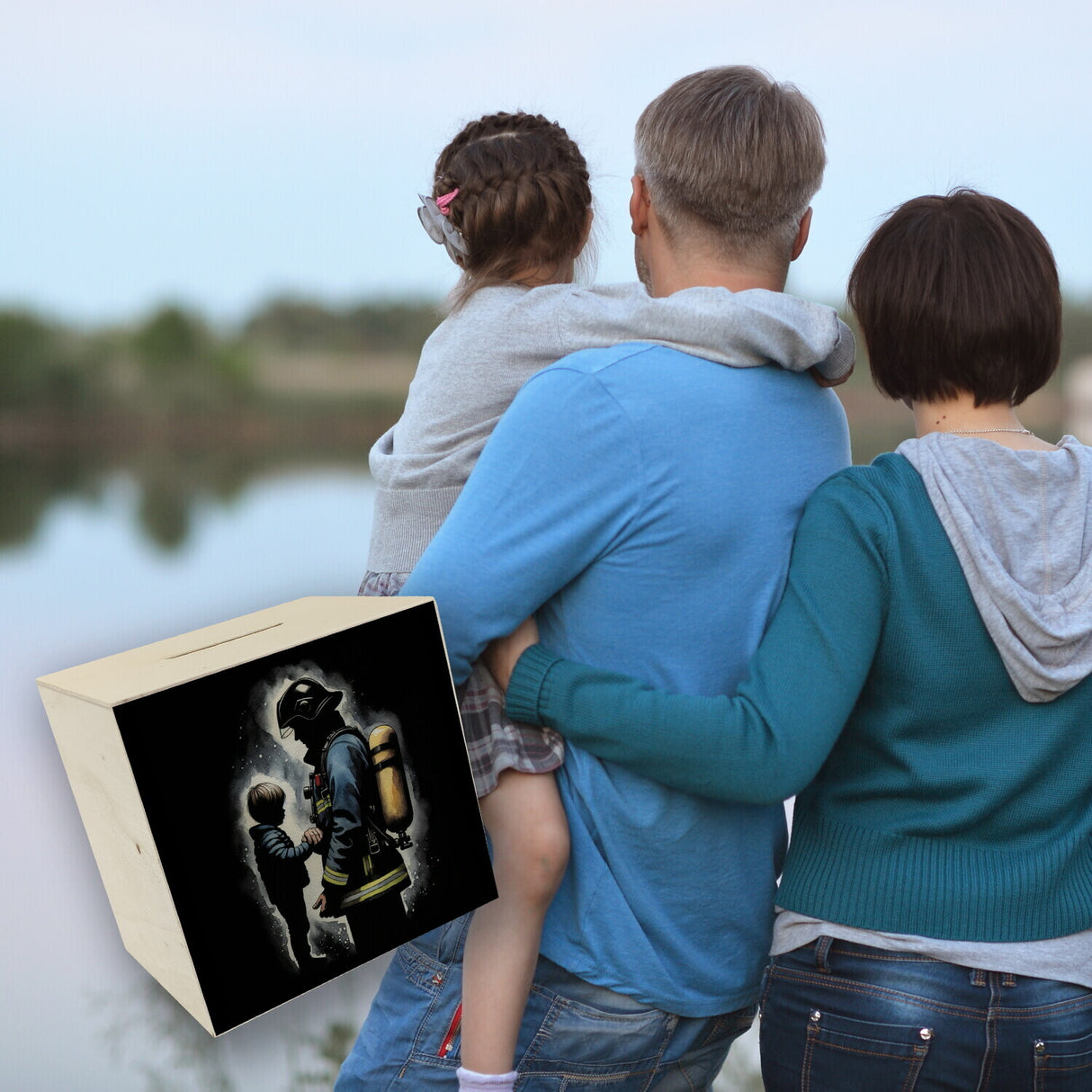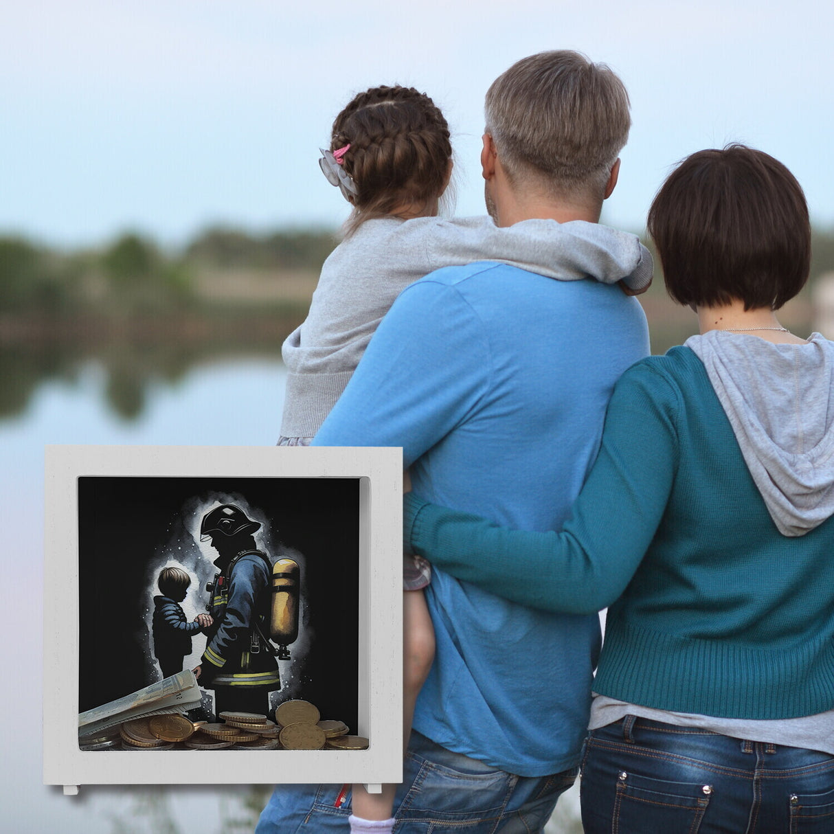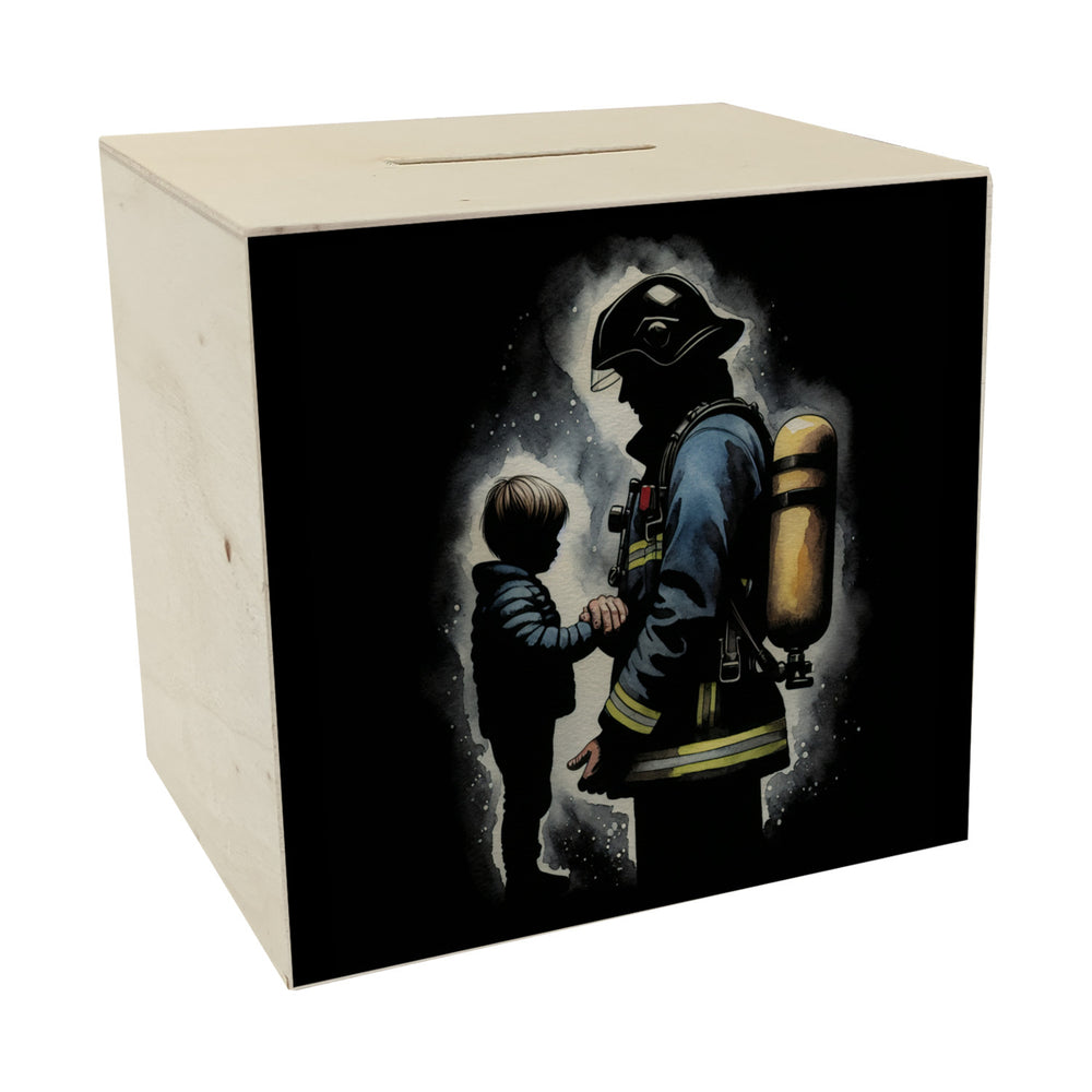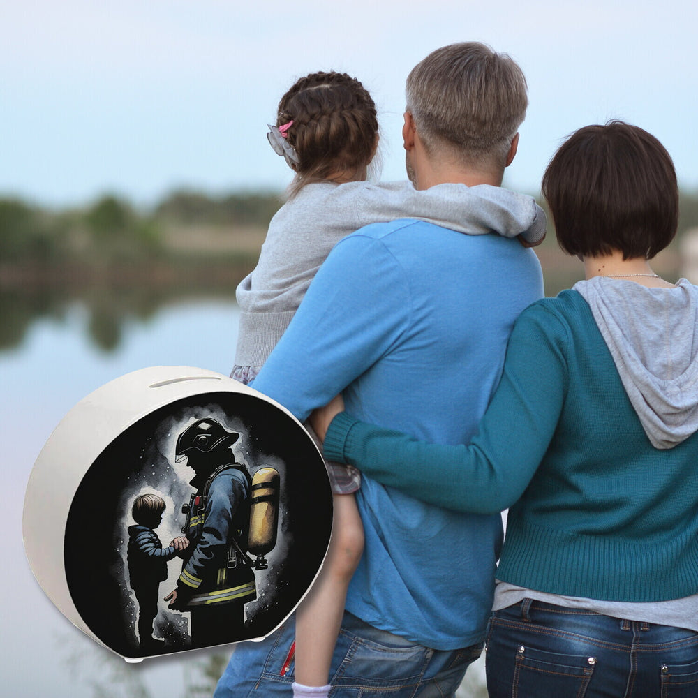 - 1x Feuerwehrmann hält die Hand seines Kindes Spardose in der gewählten Ausführung