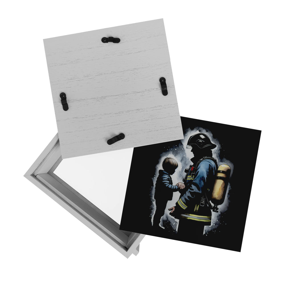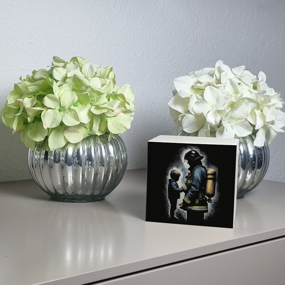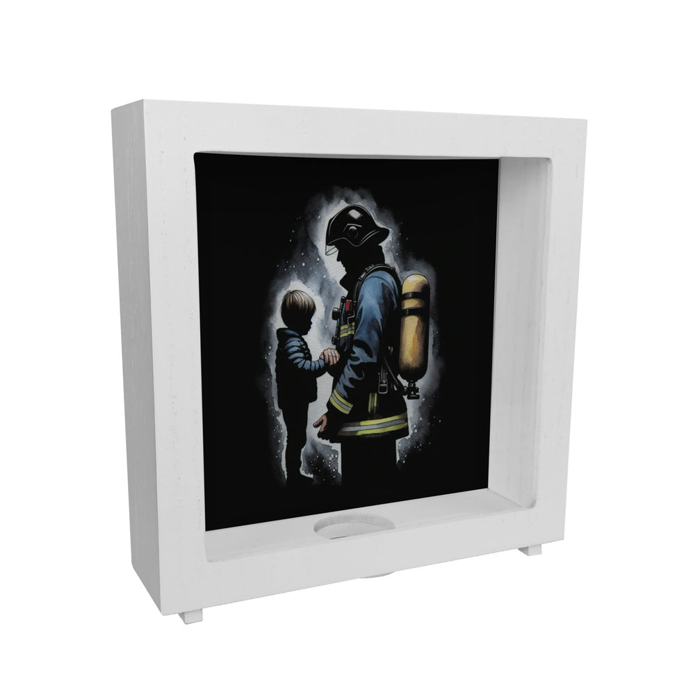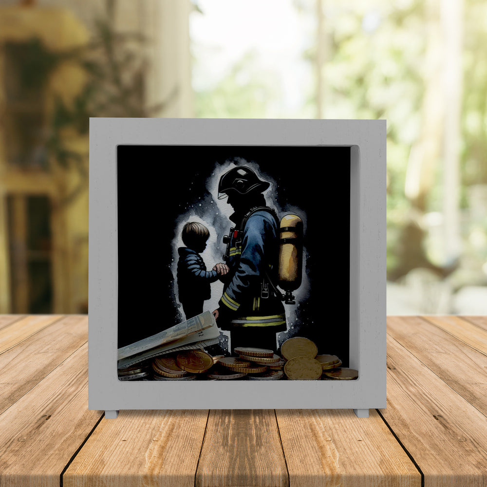 - 1x Feuerwehrmann hält die Hand seines Kindes Spardose in der gewählten Ausführung