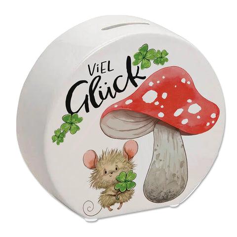 Maus mit Fliegenpilz Spardose mit Spruch Viel Glück
