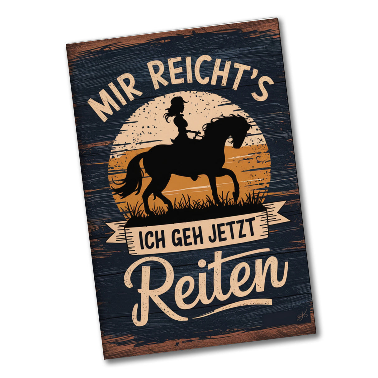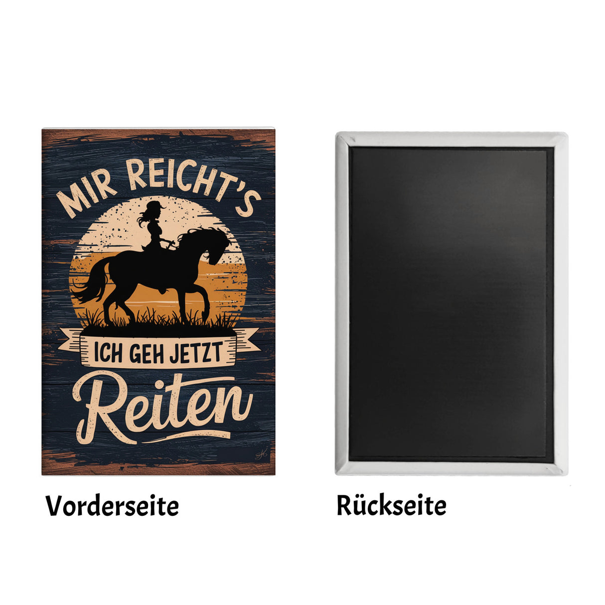 Satteln Sie Ihre Magnete auf! Unser „Frau auf Pferd - Ich geh jetzt reiten“-Magnet im rustikalen Holzdesign ist der perfekte Begleiter für Ihre metallischen Oberflächen. Das Vintage-Design bringt den Charme von Retro-Flair und Reitaktivitäten direkt in Ihre Küche. Dieser rechteckige Magnet zeigt die starke Silhouette einer Frau auf einem tapferen Pferd vor einem hinreißenden Farbverlaufshintergrund. Der witzige Spruch „MIR REICHT'S, ICH GEH JETZT REITEN“ rundet das Design perfekt ab und sorgt für gute Laune.Perfekt als Geschenk für alle, die Pferde, Reiten und ein bisschen Retro-Charme lieben. Mit diesem Magneten landen Sie bestimmt einen Volltreffer bei jedem Pferdefan. Also zügeln Sie Ihr Zögern und holen Sie sich dieses tolle Stück! Hochwertiger Souvenir-Magnet mit schönem Motiv. Größe ca. 8 x 5,5 cm. Gewicht ca. 24g.Für alle, die Pferde lieben und es kaum erwarten können, sich wieder in den Sattel zu schwingen, ist dieser Magnet ein Must-Have! Ob am Kühlschrank, an der Magnetwand im Büro oder als Dekoration im Stall, der Magnet ist vielseitig einsetzbar und ein echter Hingucker. Also, worauf wartest du noch? Hol dir diesen charmanten Magneten und zeige der Welt deine Leidenschaft für Pferde und Reitaktivitäten! Ein tolles Geschenk für jeden Anlass, das Freude und ein Lächeln ins Gesicht des Beschenkten zaubert.