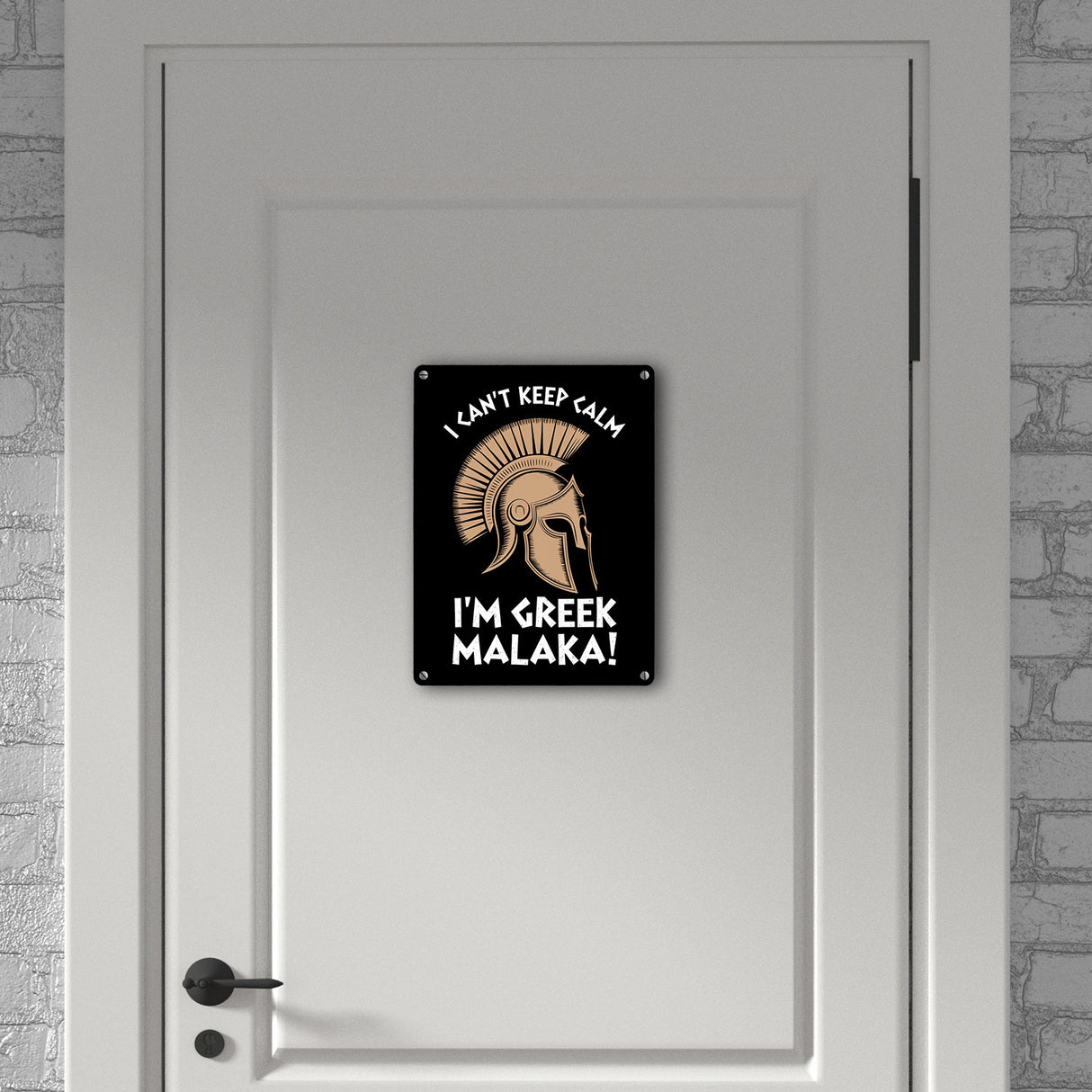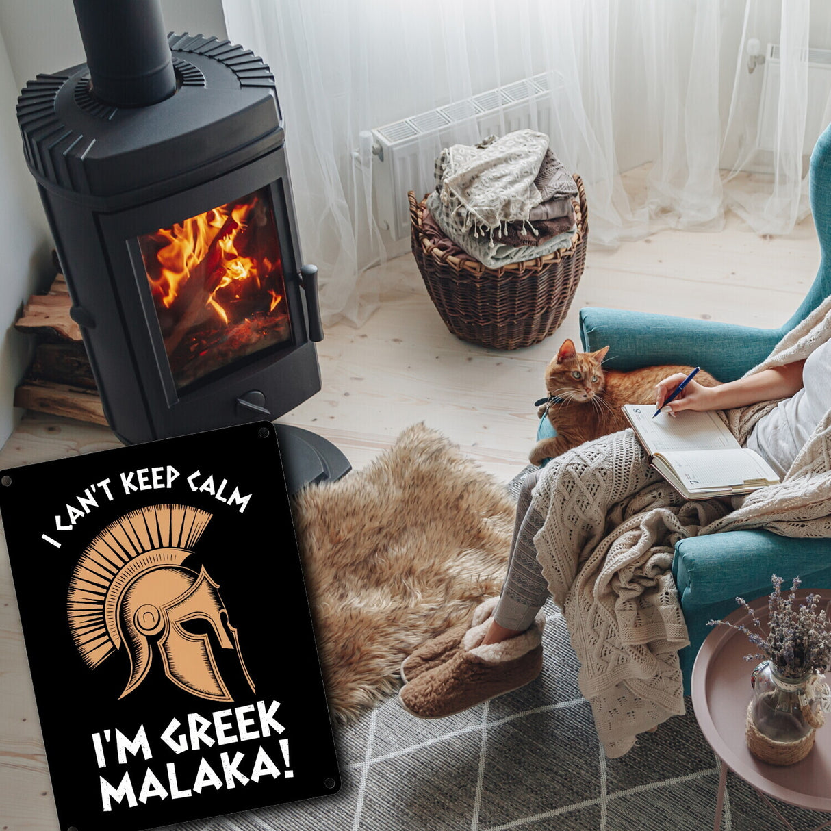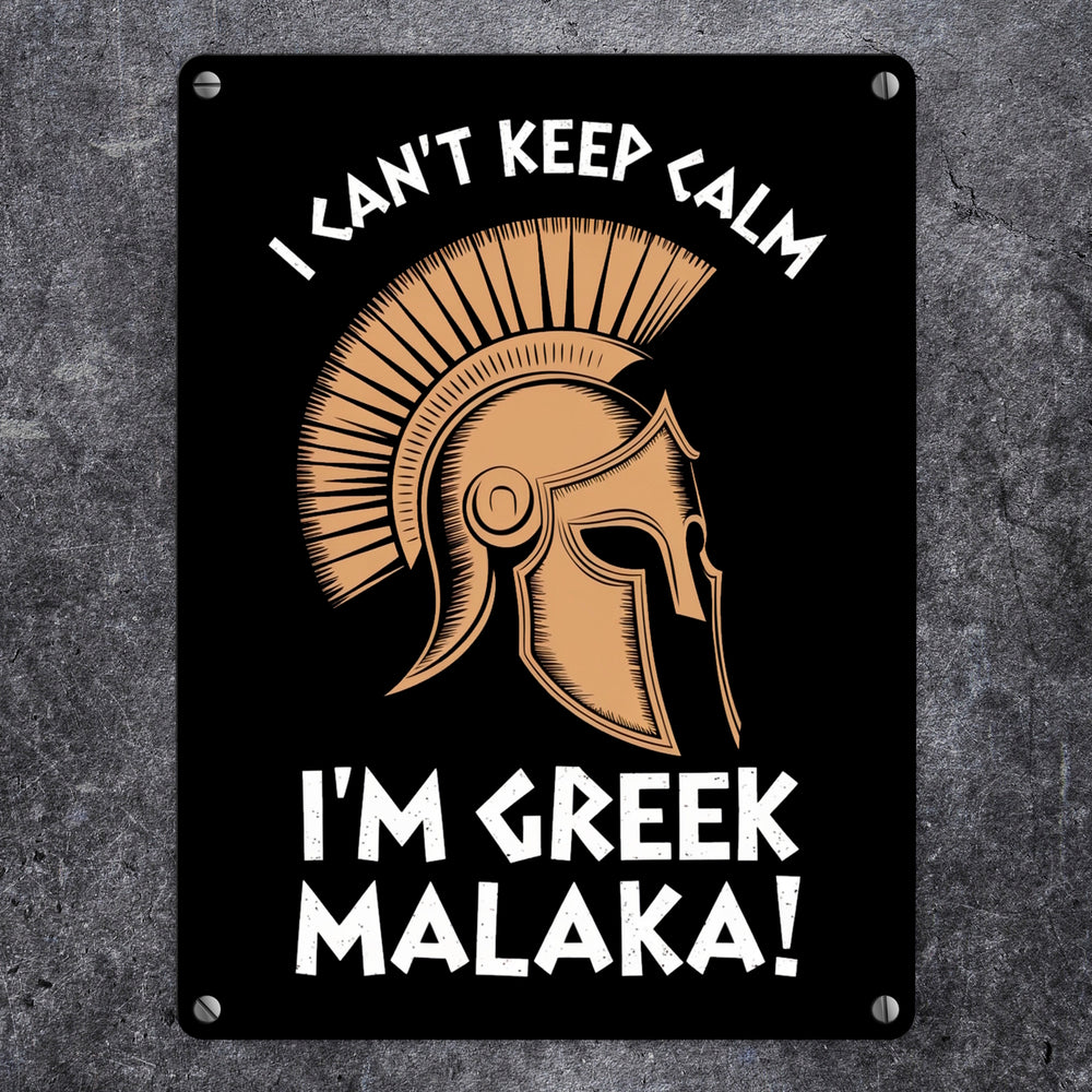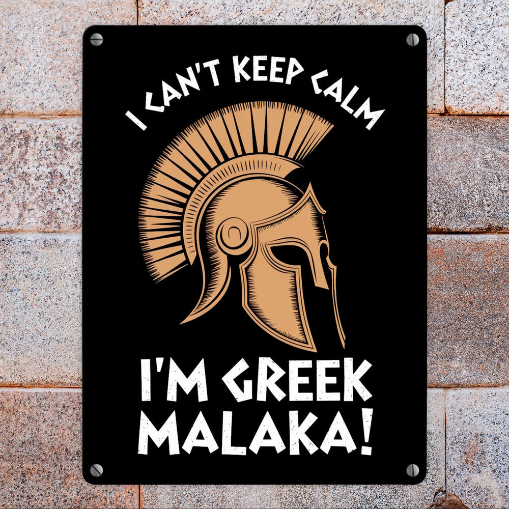 - Dieses Metallschild vereint Humor und griechischen Stolz! Das Design zeigt einen beeindruckenden antiken Helm, begleitet von dem kühnen Spruch "I CAN'T KEEP CALM I'M GREEK MALAKA!". Der abgenutzte, rustikale Look auf schwarzem Hintergrund verleiht jedem Raum eine kraftvolle Note.