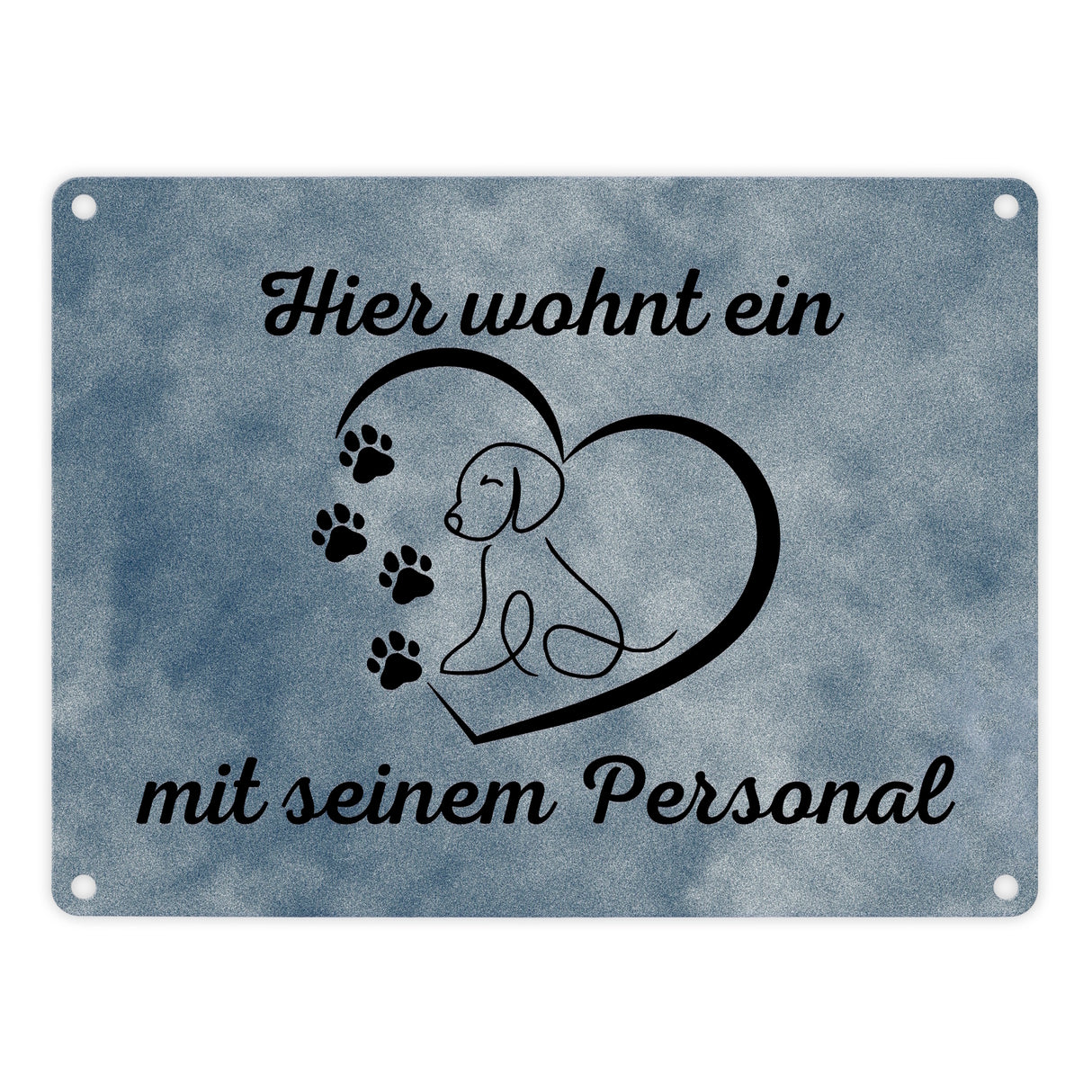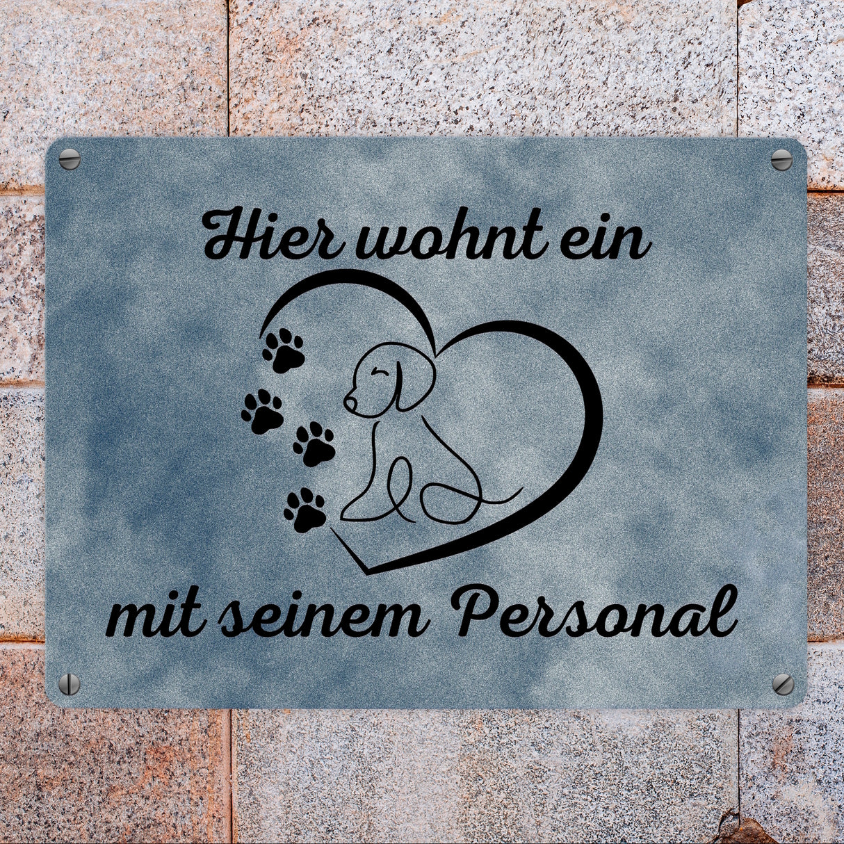 - Kaufe jetzt dein Metallschild mit dem Spruch: Hier wohnt ein Hund mit seinem Personal und verleihe deiner Wohnung einen ganz besonderen Charme. Dank der vorgestanzten Löcher, lässt sich das Dekoschild kinderleicht montieren.