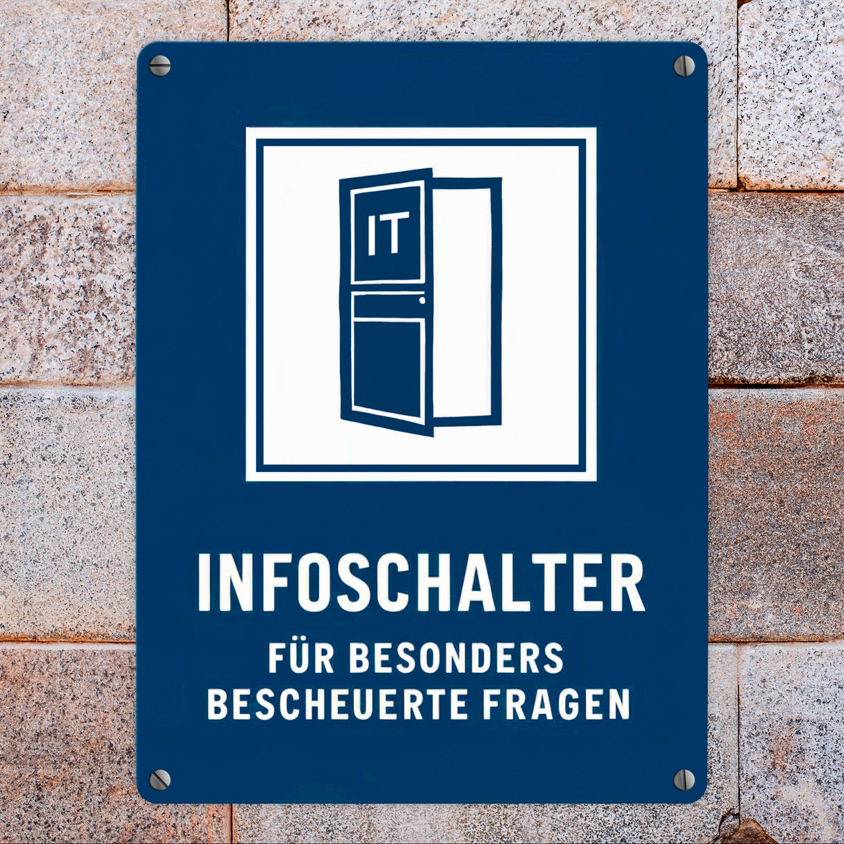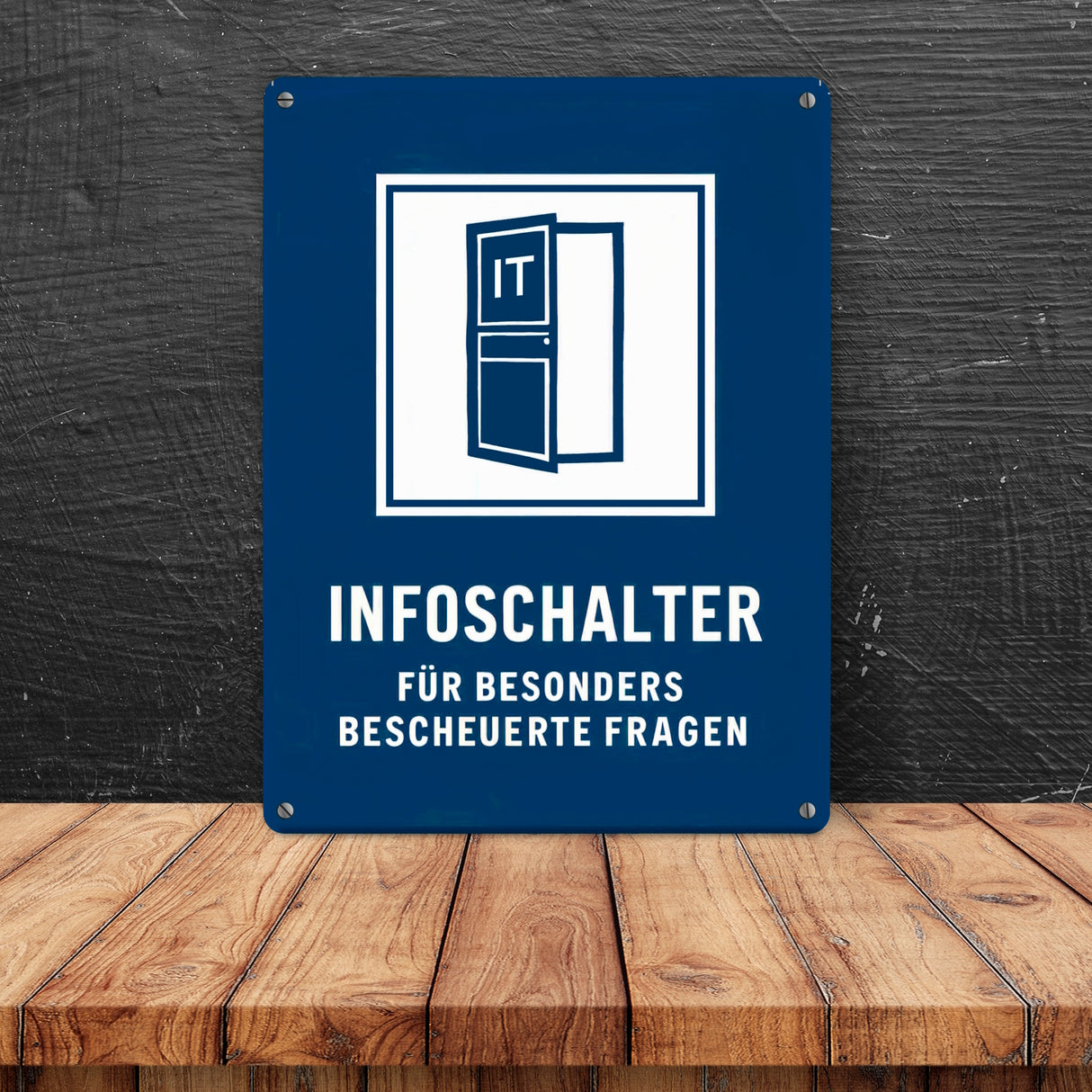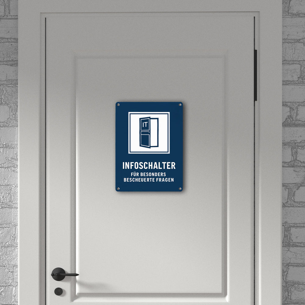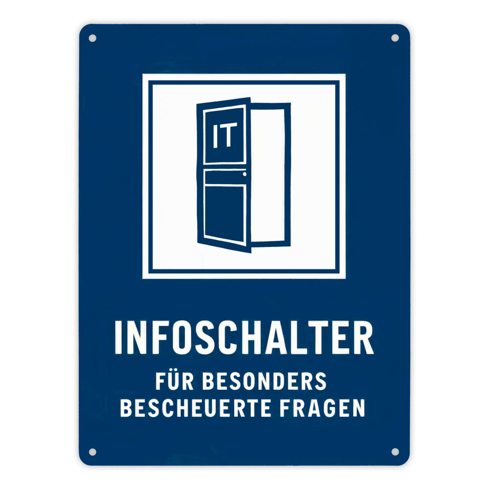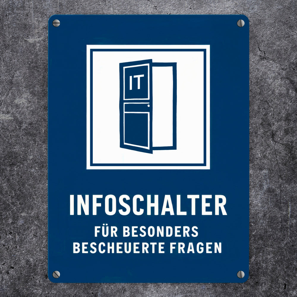 • Das Metallschild "IT-Infoschalter für bescheuerte Fragen" zeigt eine offene Tür mit dem Wort 'IT'. Der blaue Hintergrund und das weiße Quadrat sorgen für visuelle Klarheit. Perfekt, um deinem Büro oder IT-Raum einen humorvollen Touch zu verleihen!