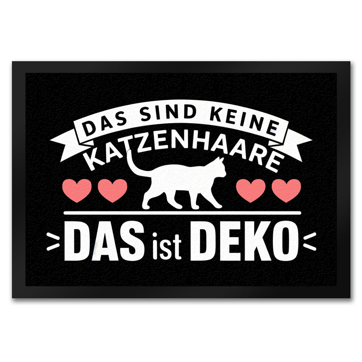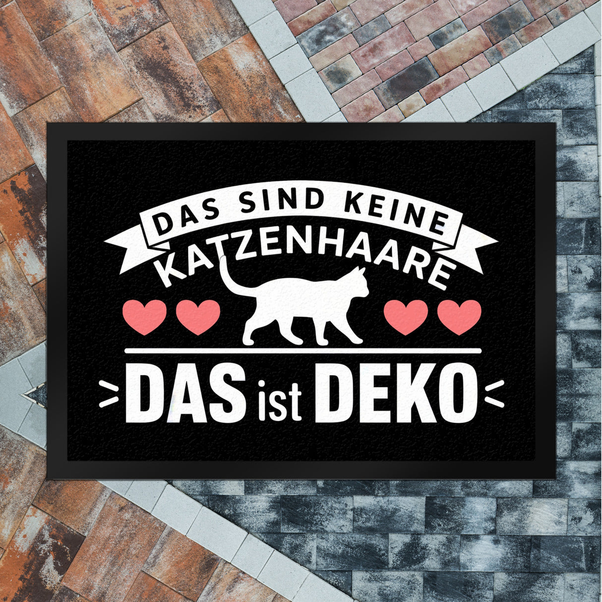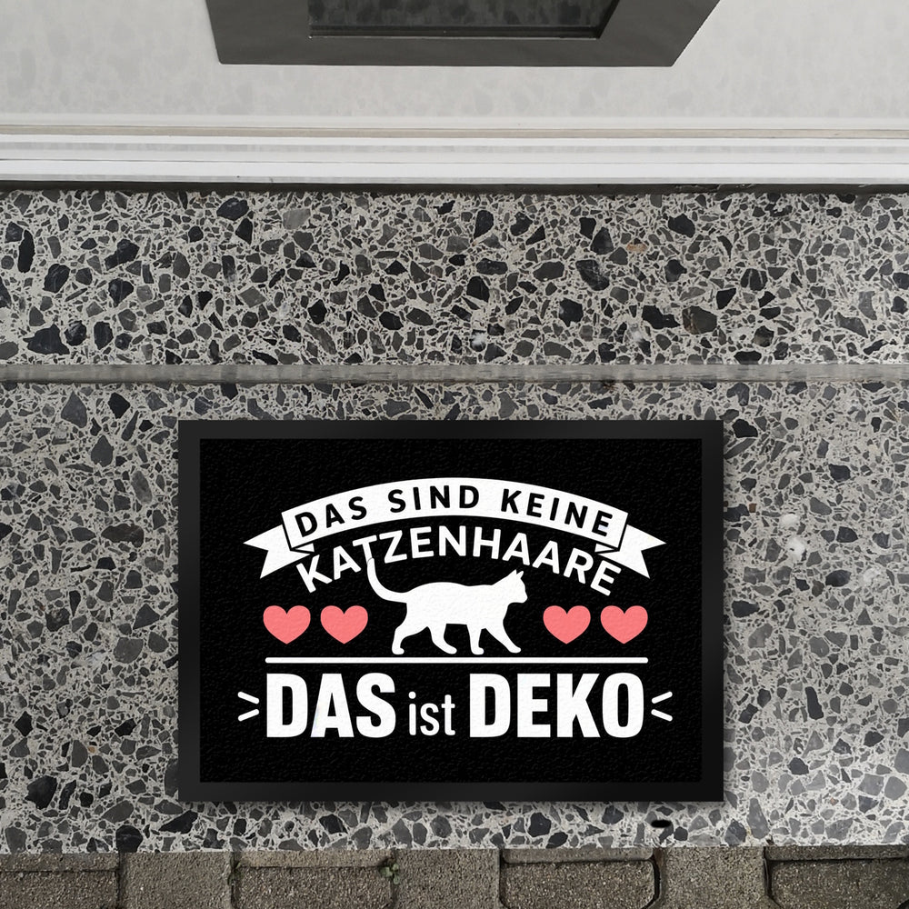 - Diese humorvolle Fußmatte zaubert ein Lächeln auf jedes Gesicht! Auf schwarzem Hintergrund prangt eine stilvolle Katzensilhouette, umgeben von pinken Herzsymbolen. Der freche Spruch "DAS SIND KEINE KATZENHAARE, DAS IST DEKO" sorgt garantiert für Aufmerksamkeit vor jeder Tür. Perfekt für Katzenliebhaber mit Sinn für Humor!