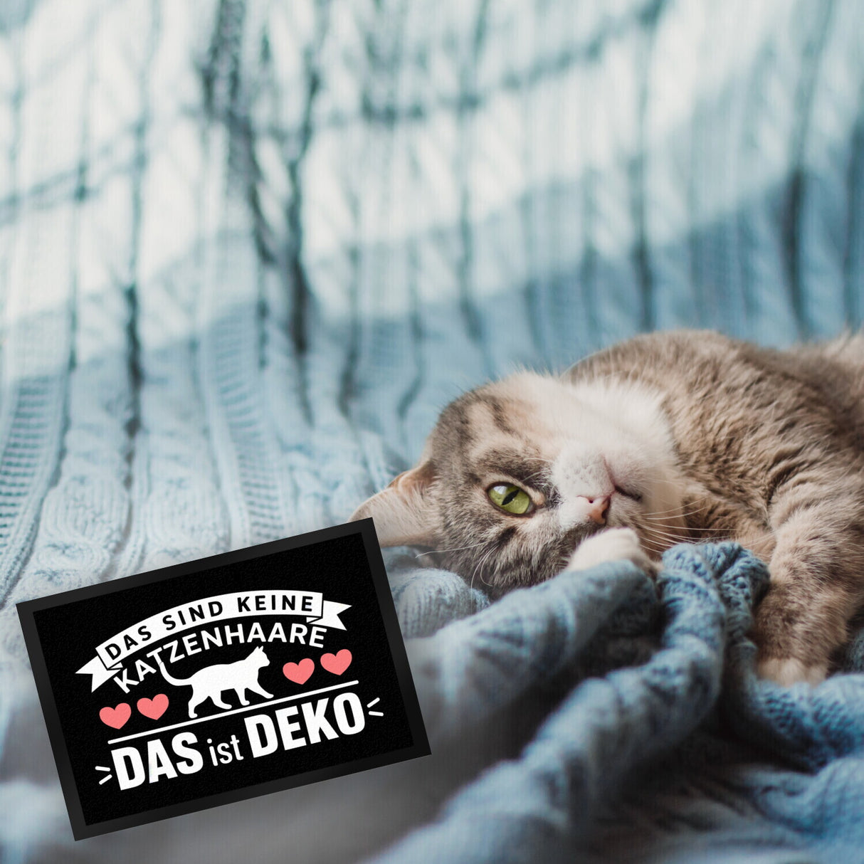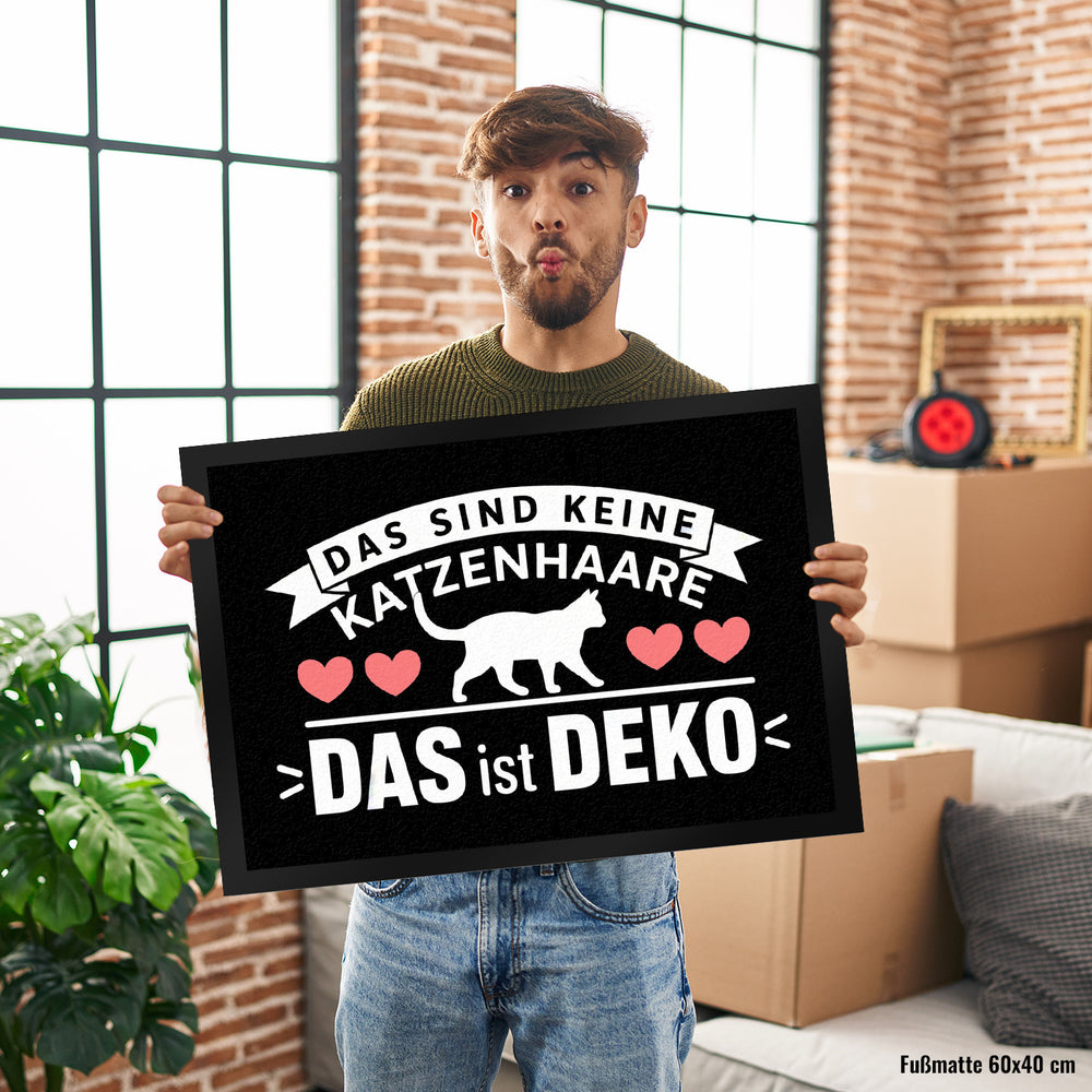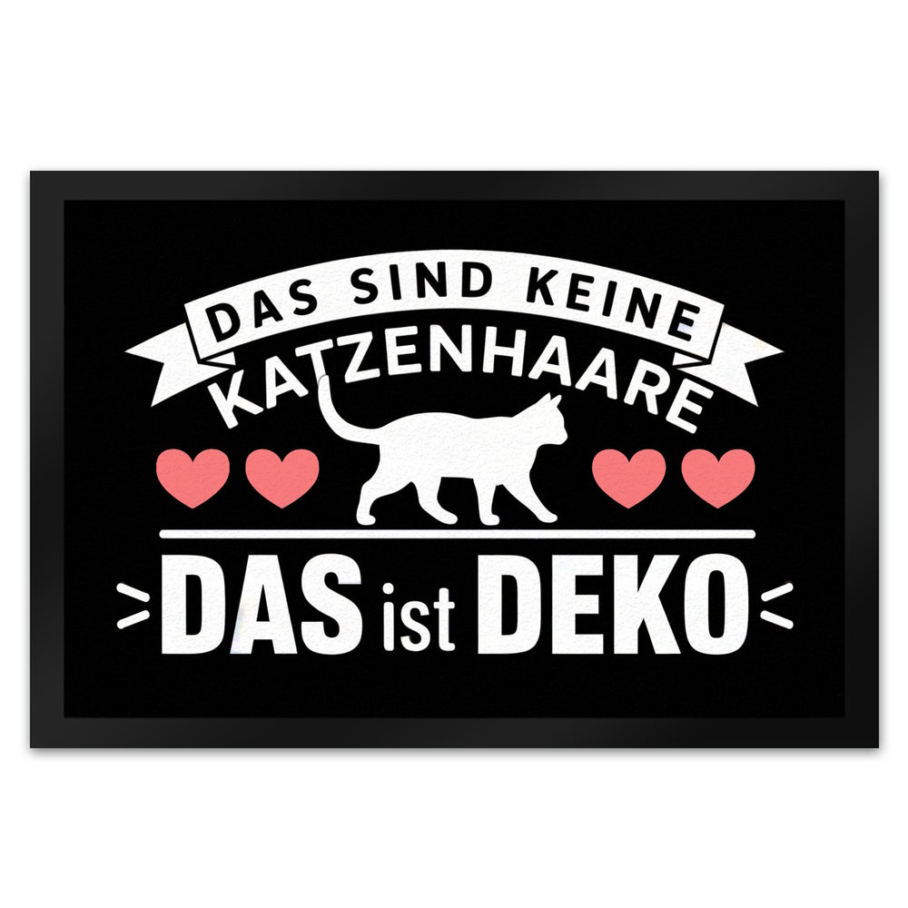 - Diese humorvolle Fußmatte zaubert ein Lächeln auf jedes Gesicht! Auf schwarzem Hintergrund prangt eine stilvolle Katzensilhouette, umgeben von pinken Herzsymbolen. Der freche Spruch "DAS SIND KEINE KATZENHAARE, DAS IST DEKO" sorgt garantiert für Aufmerksamkeit vor jeder Tür. Perfekt für Katzenliebhaber mit Sinn für Humor!