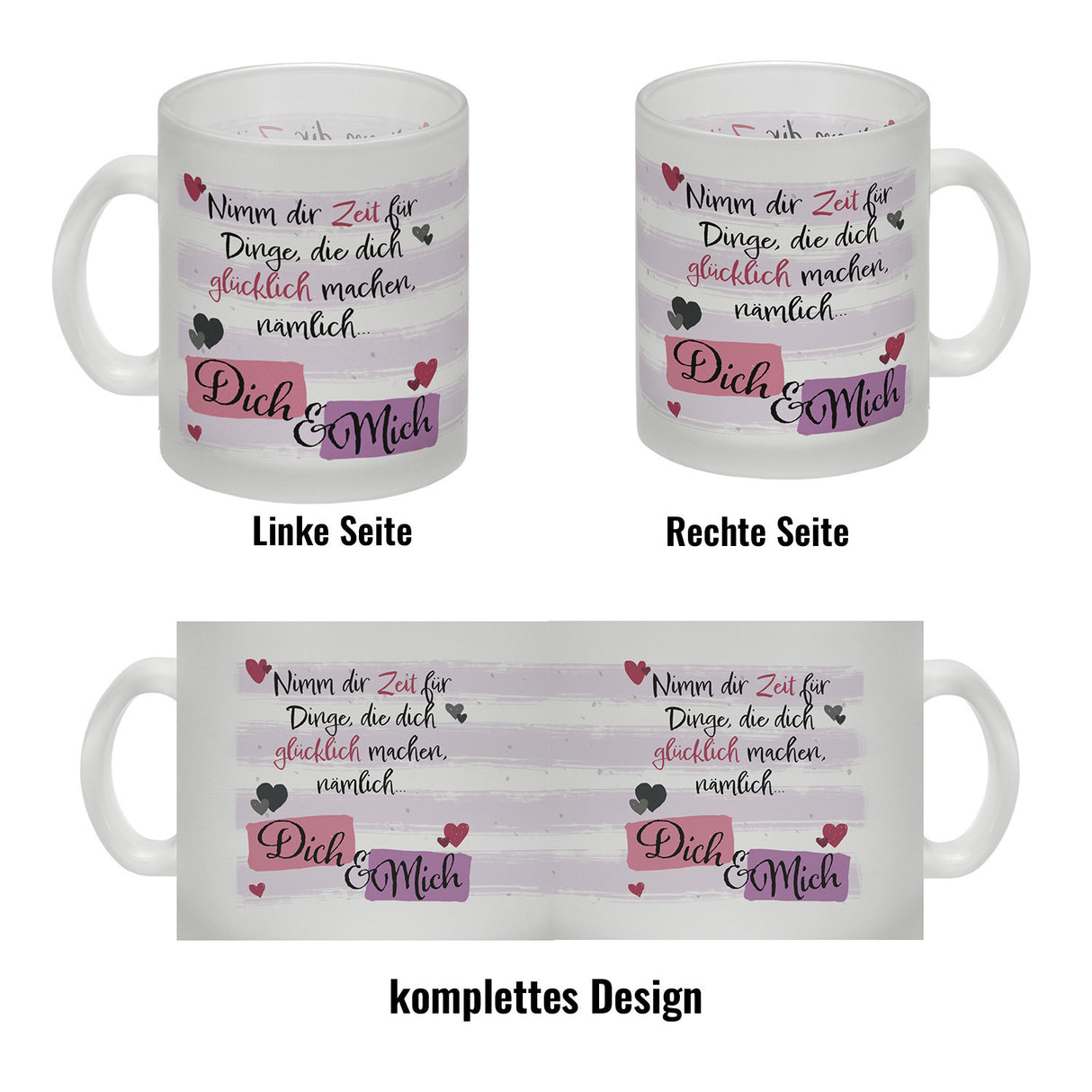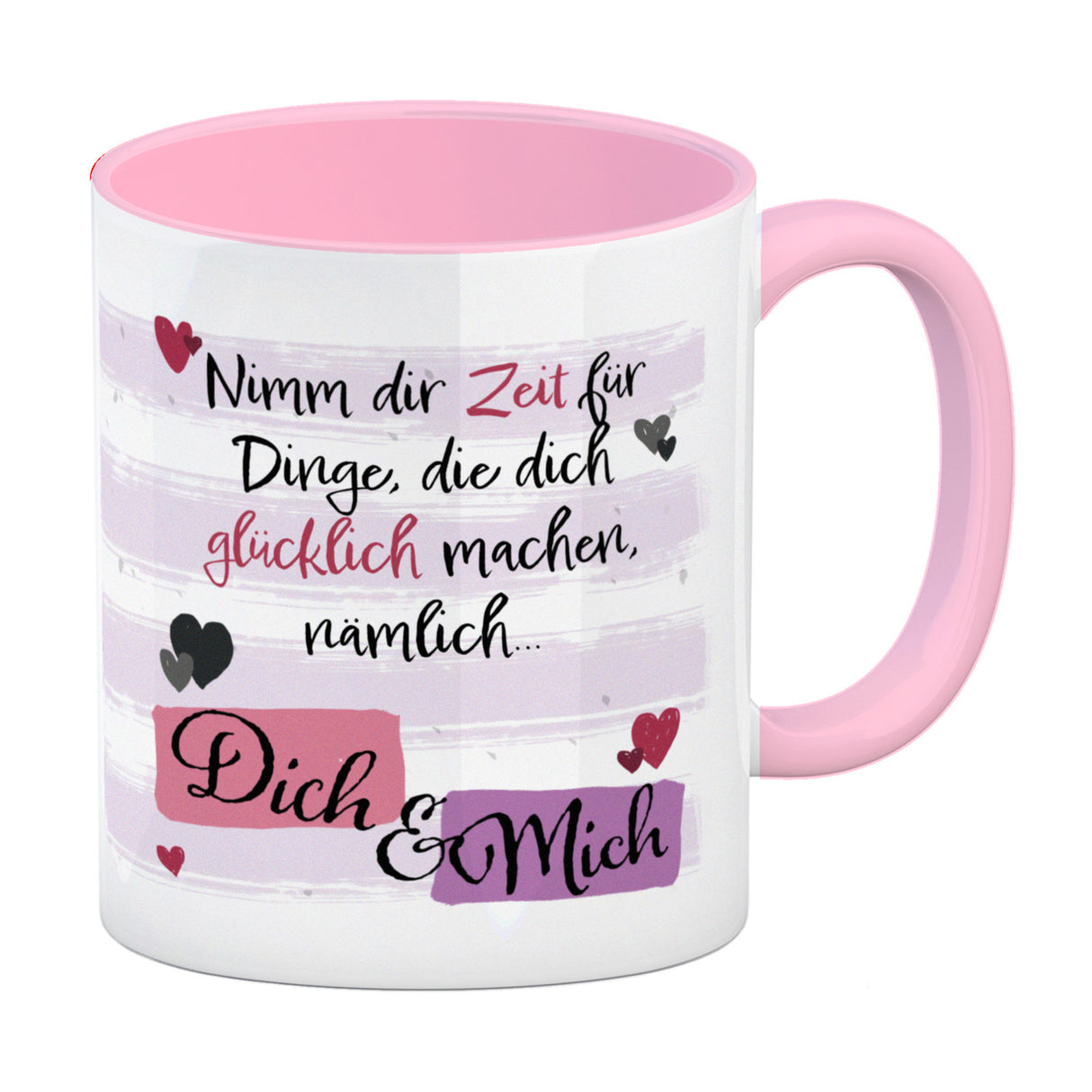 Erlebe einzigartige Momente und verschenke diesen herzlichen Kaffeebecher Nimm dir Zeit für Dich und Mich . Egal ob als Geschenk oder für dich selbst – der schöne Spruch auf dem Becher wird jeden Tag ein Lächeln ins Gesicht zaubern. Erhältlich in weißer Standardtasse, mit farbigem Henkel und Innenseite sowie als edle Glastasse oder exklusive Silberedition mit Glitzereffekt. Mit Sorgfalt in Handarbeit hergestellt in unserer Tassen-Manufaktur Deutschland. Unser Nimm dir Zeit für Dich und Mich Kaffeebecher ist das perfekte Geschenk, um einer geliebten Person zu zeigen, wie sehr man sie mag. Schenke Freude und Liebe zum Valentinstag, zum Jahrestag, zur Hochzeit oder zum Geburtstag!