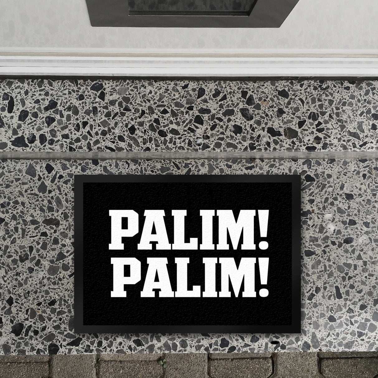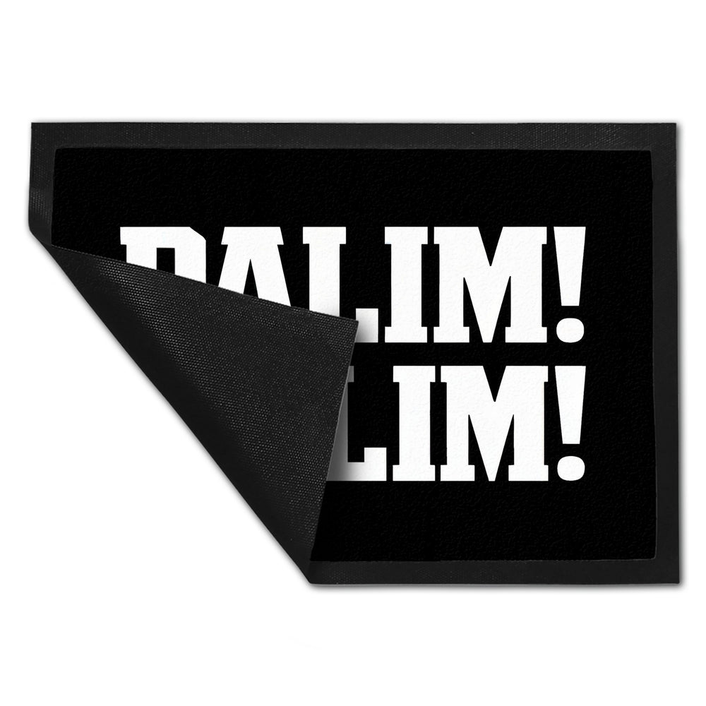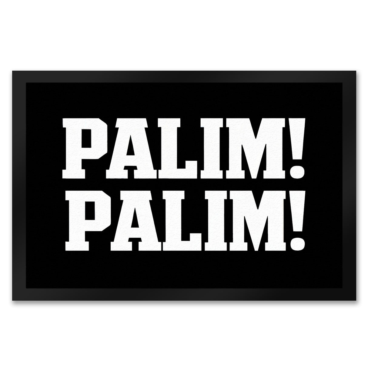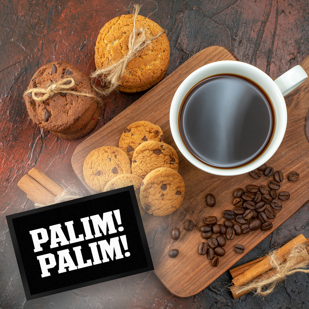 - Die lustige schwarze Fußmatte "PALIM! PALIM!" ist ein echter Hingucker. Mit ihrer kräftigen, weißen Blockschrift auf schwarzem Hintergrund sorgt sie für einen humorvollen und einladenden ersten Eindruck. Der zentrale, rechteckige Rahmen hebt den Text hervor und verleiht der Matte ein modernes, minimalistisches Design.