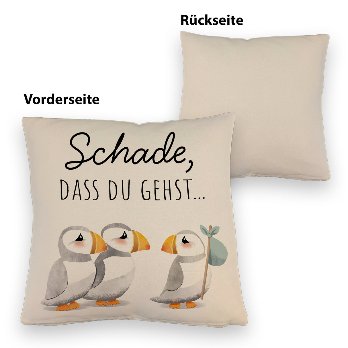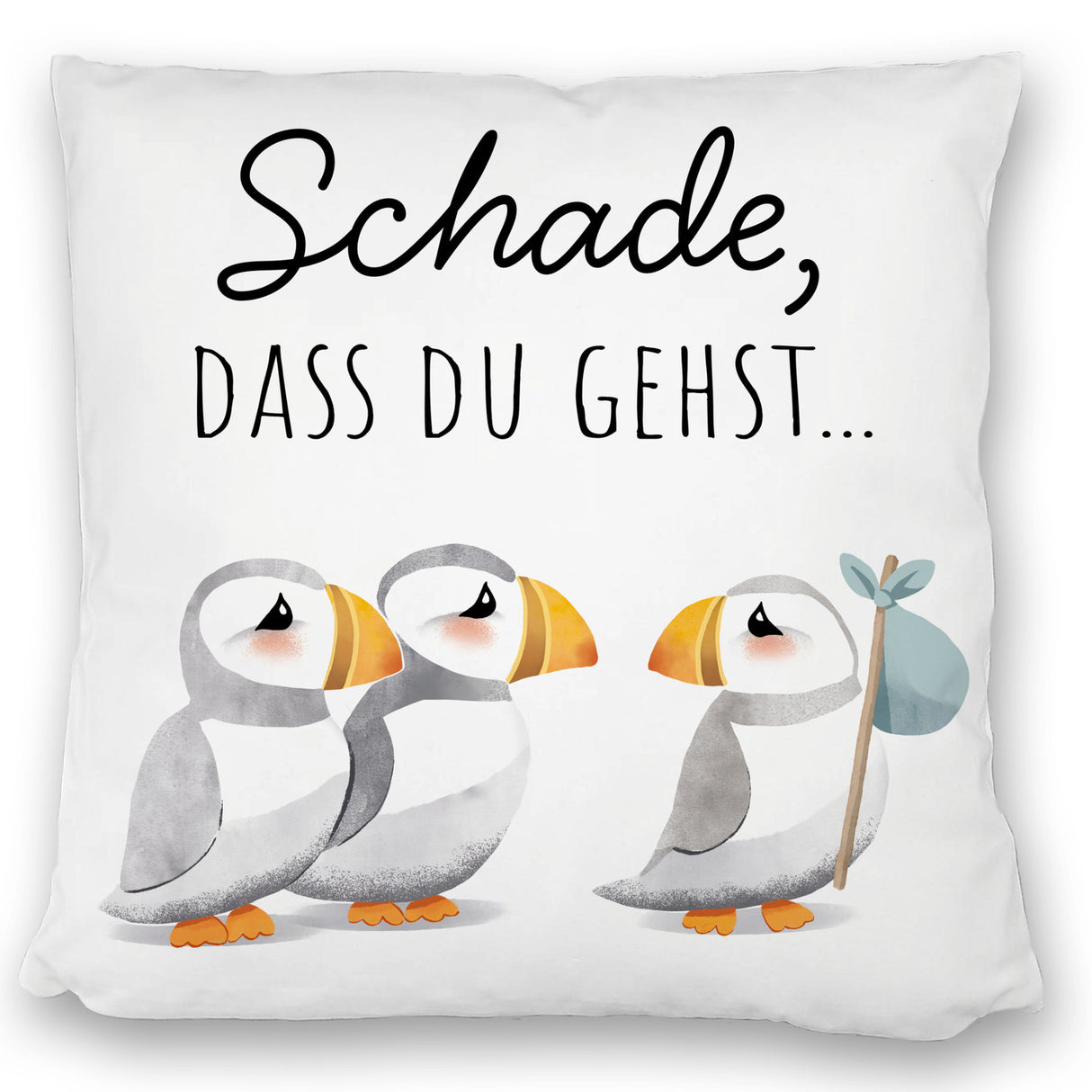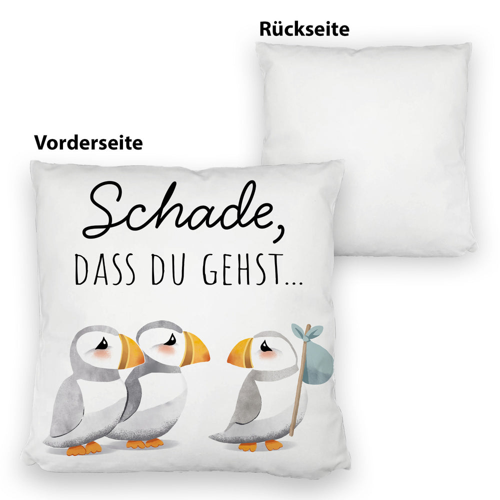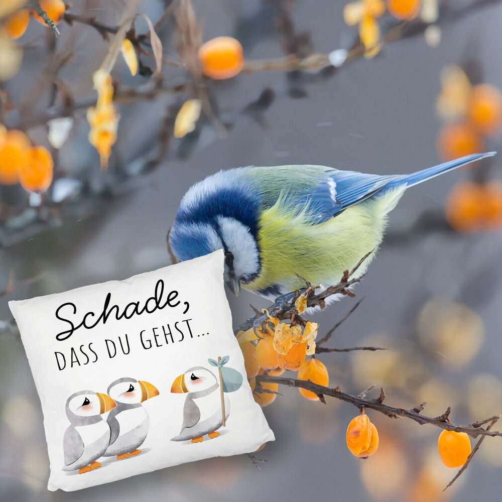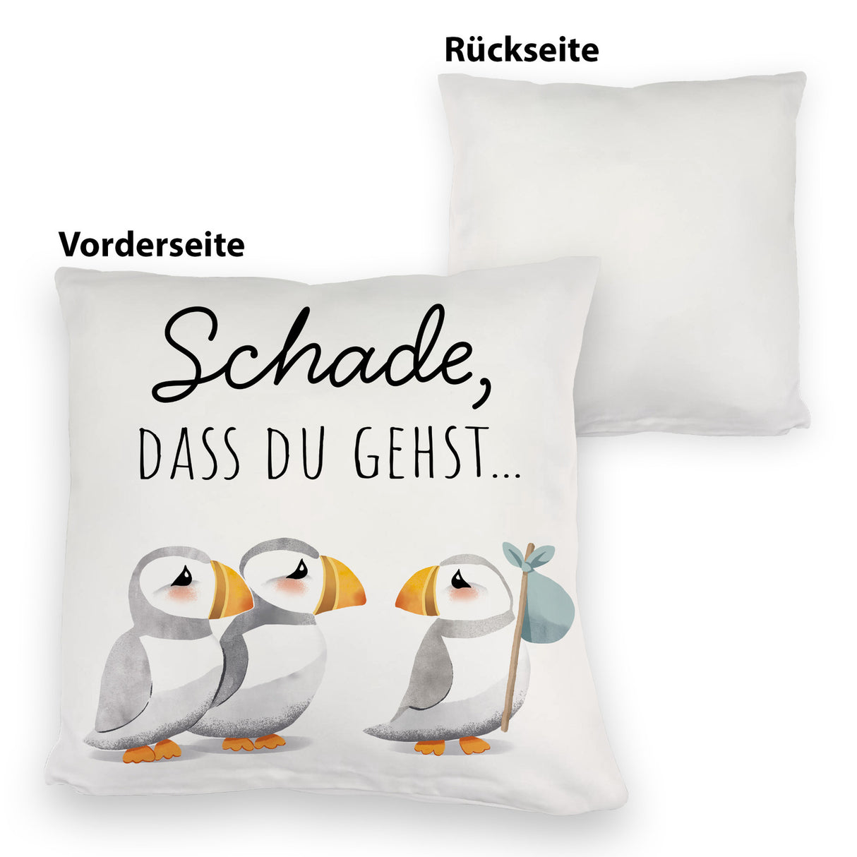- 1x Schade, dass du gehst Papageitaucher Kissen Abschied Kollege in der gewählten Ausführung