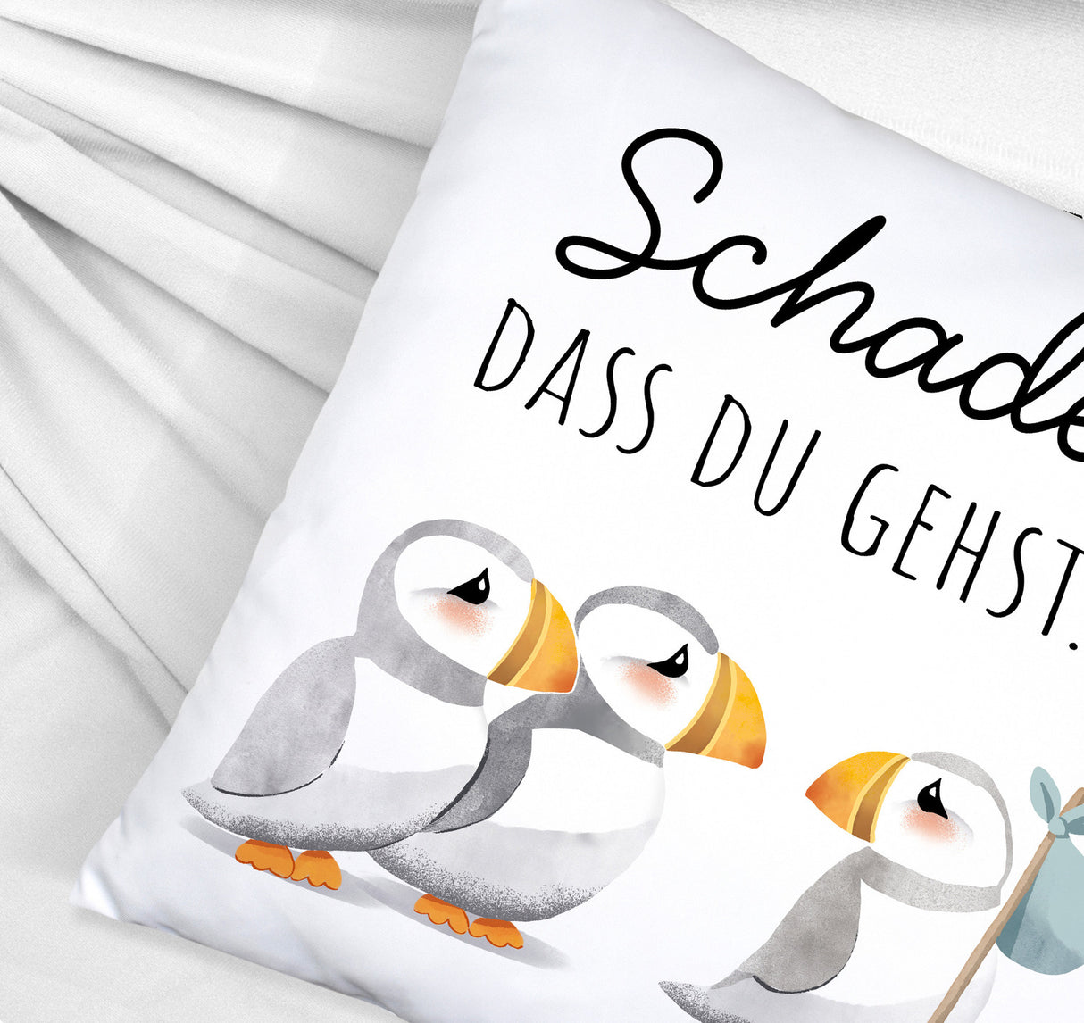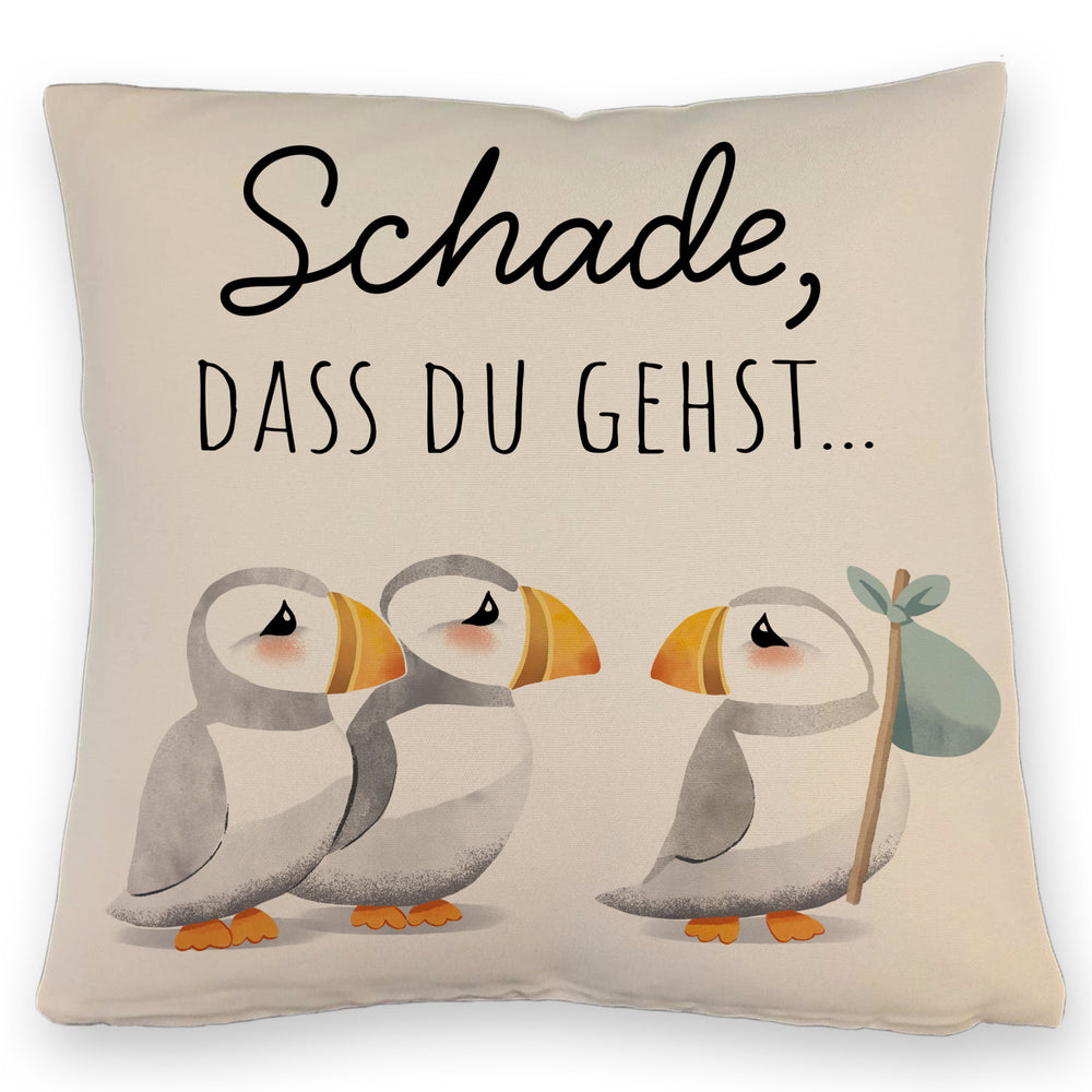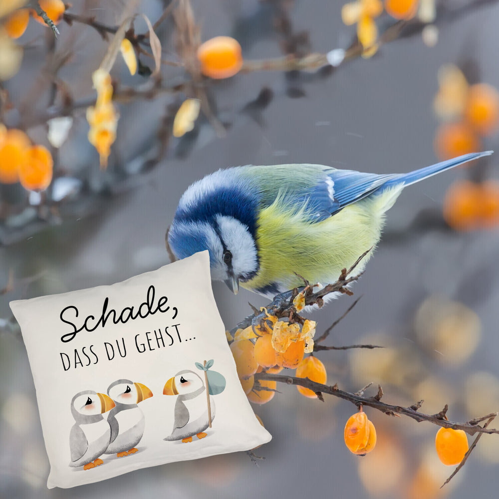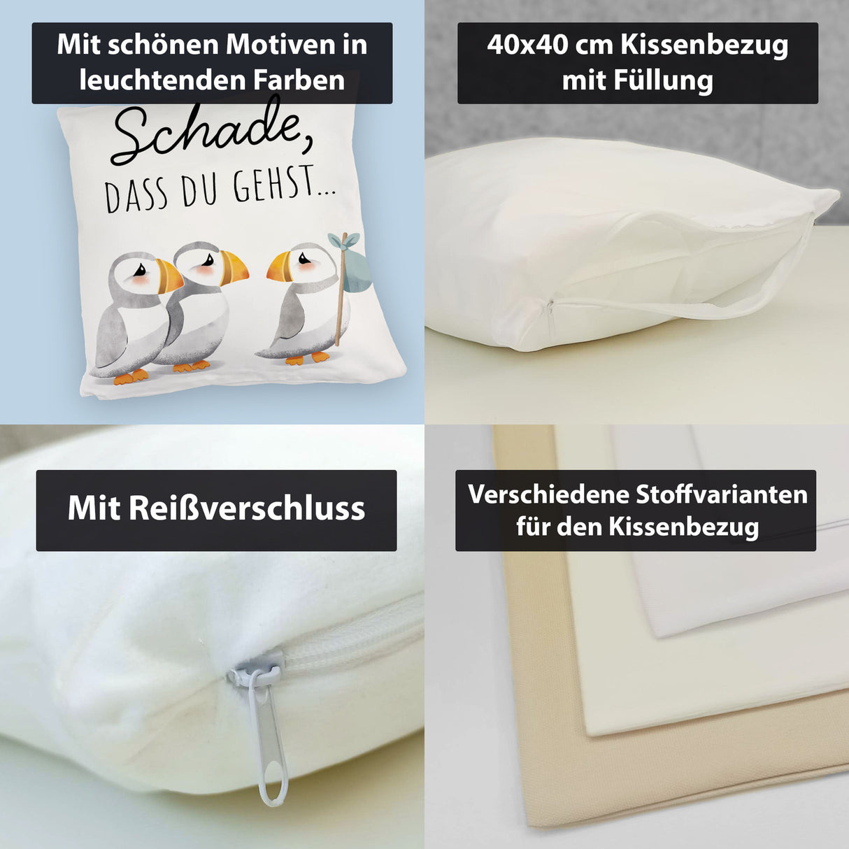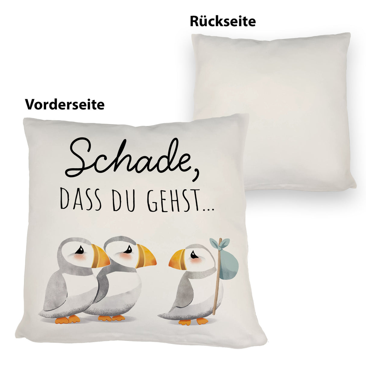 - 1x Schade, dass du gehst Papageitaucher Kissen Abschied Kollege in der gewählten Ausführung