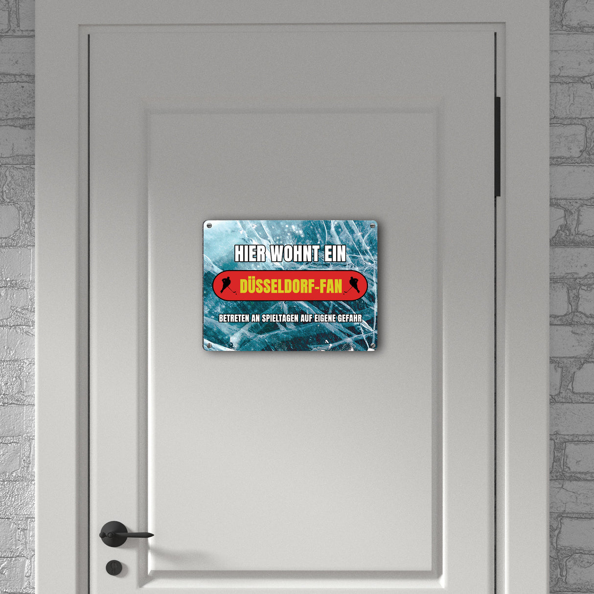 - 1x Hier wohnt ein Düsseldorf-Fan Metallschild in 15x20 cm mit Eishallen Boden-Motiv in der gewählten Größe