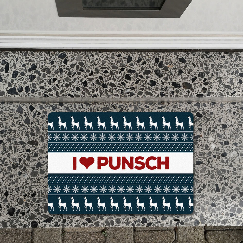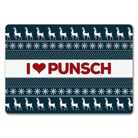 • Lieferumfang: 1x I love Punsch Fußmatte ohne Rand in blau mit Weihnachtsmuster Motiv