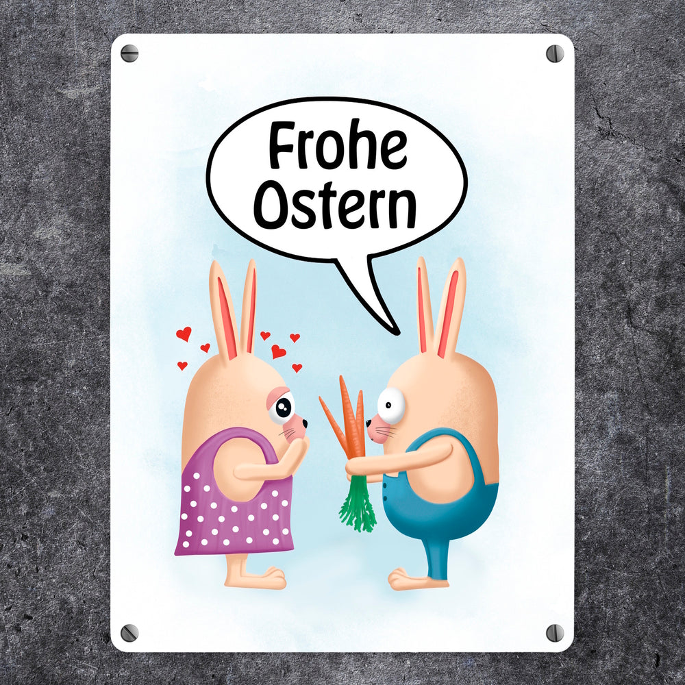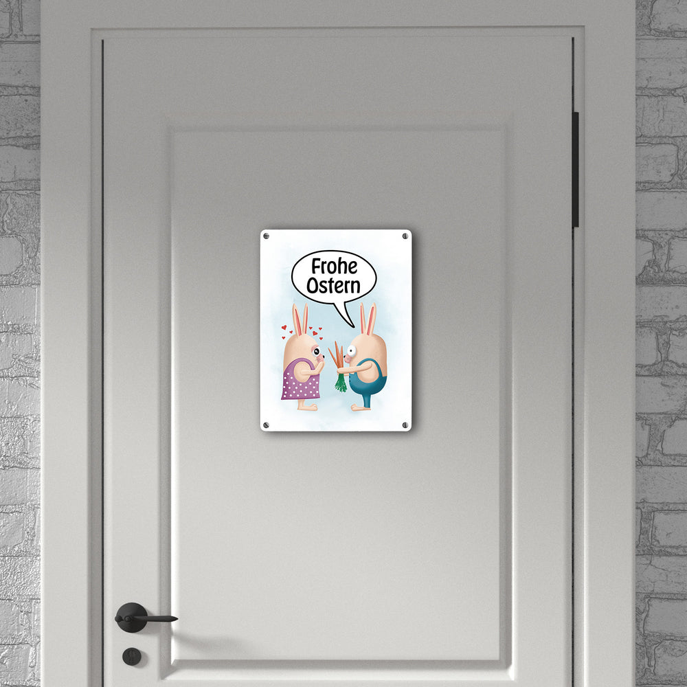 Frohe Ostern Metallschild mit lustigen Hasen