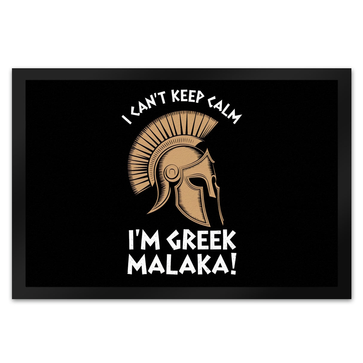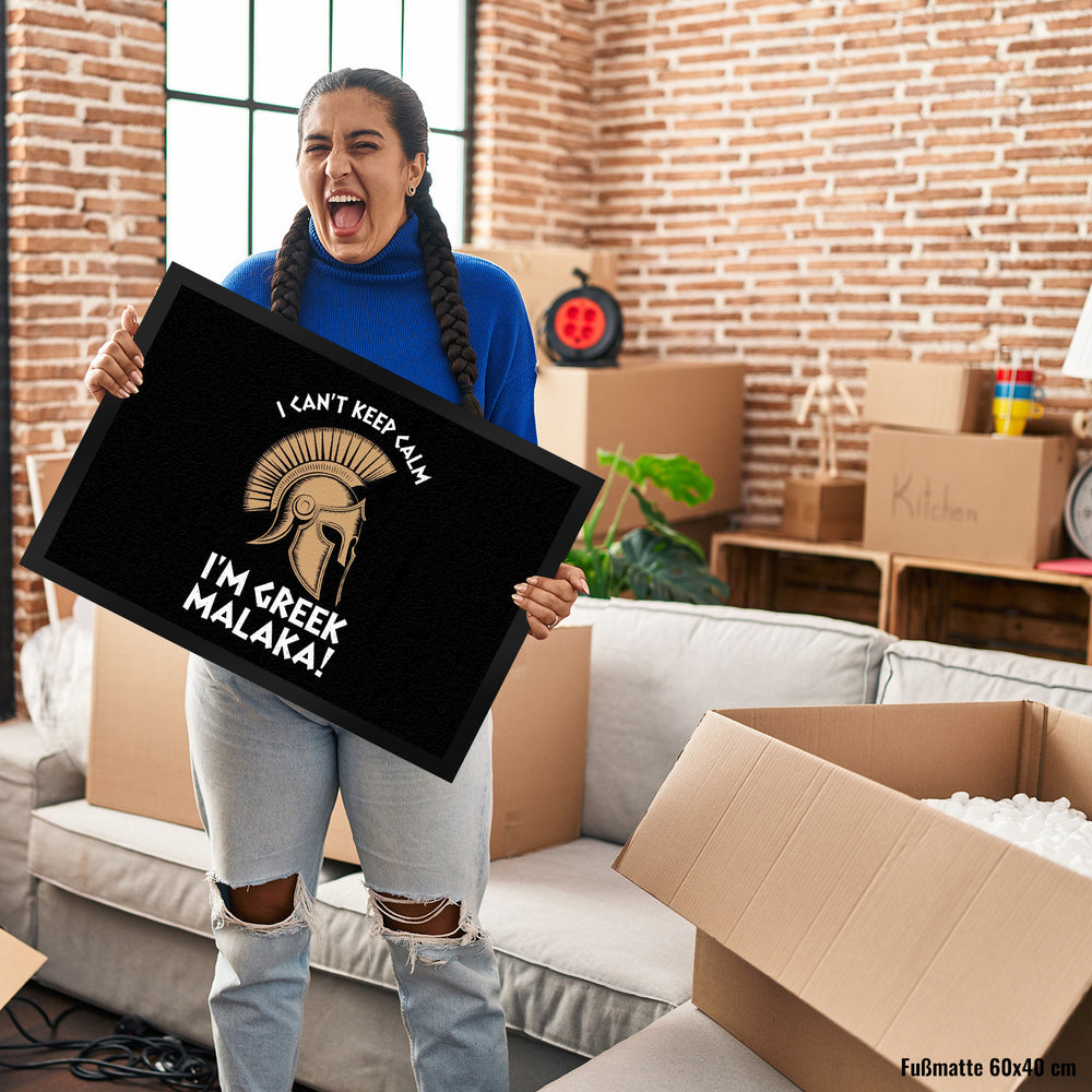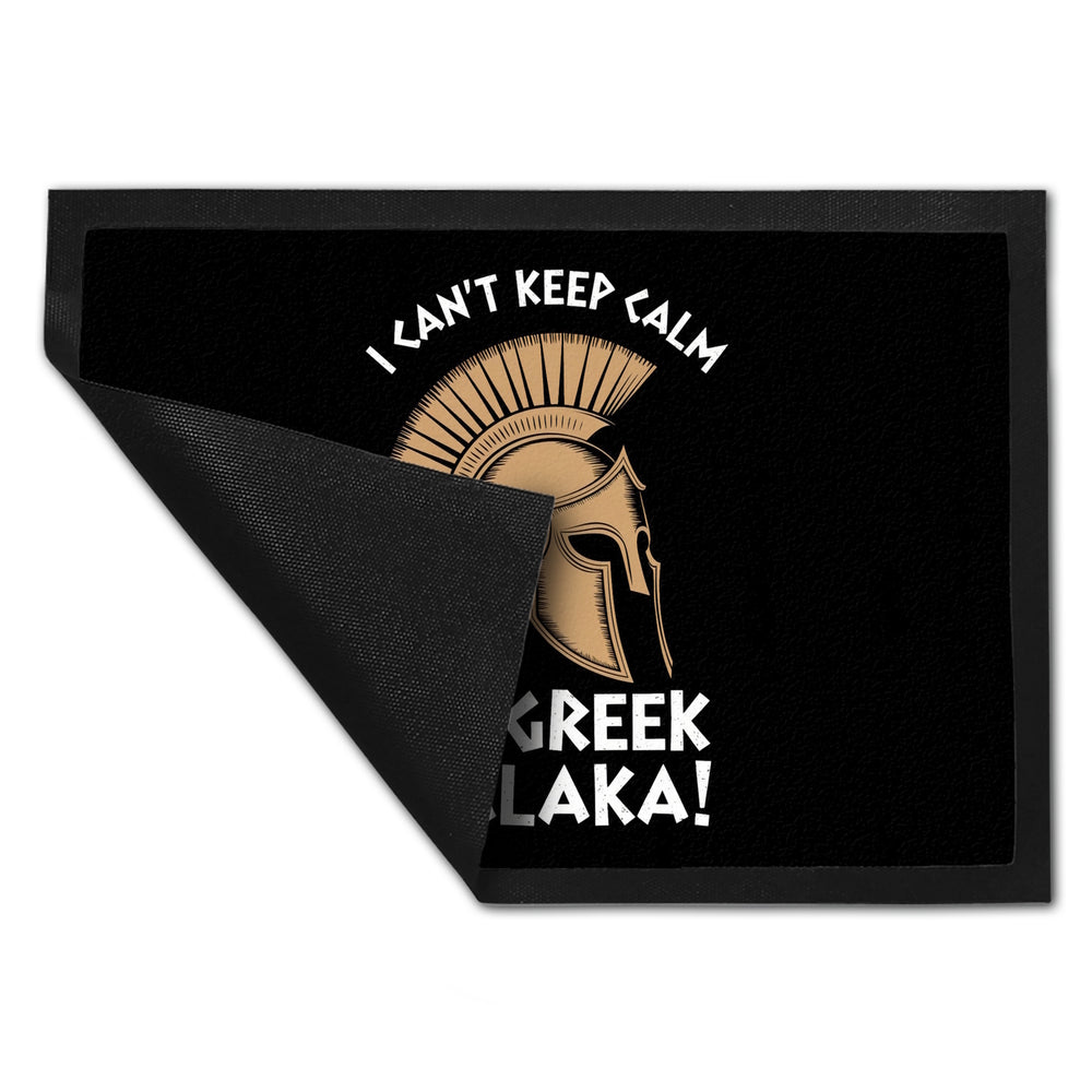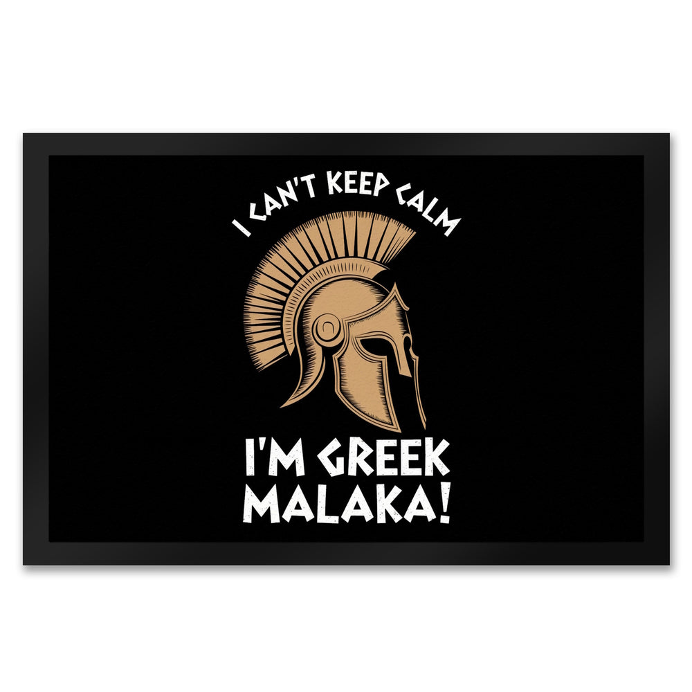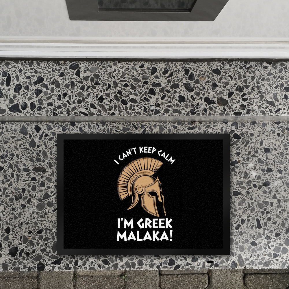 - Diese Fußmatte präsentiert ein kraftvolles griechisches Helm-Design mit einem gewagten Schriftzug: "I CAN'T KEEP CALM I'M GREEK MALAKA!" auf schwarzem Hintergrund. Perfekt für diejenigen, die gerne ein Stück griechischer Kultur vor ihrer Haustür haben möchten!