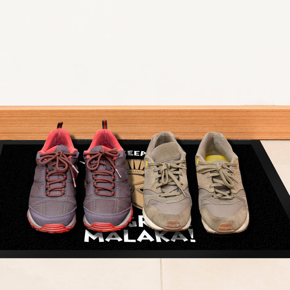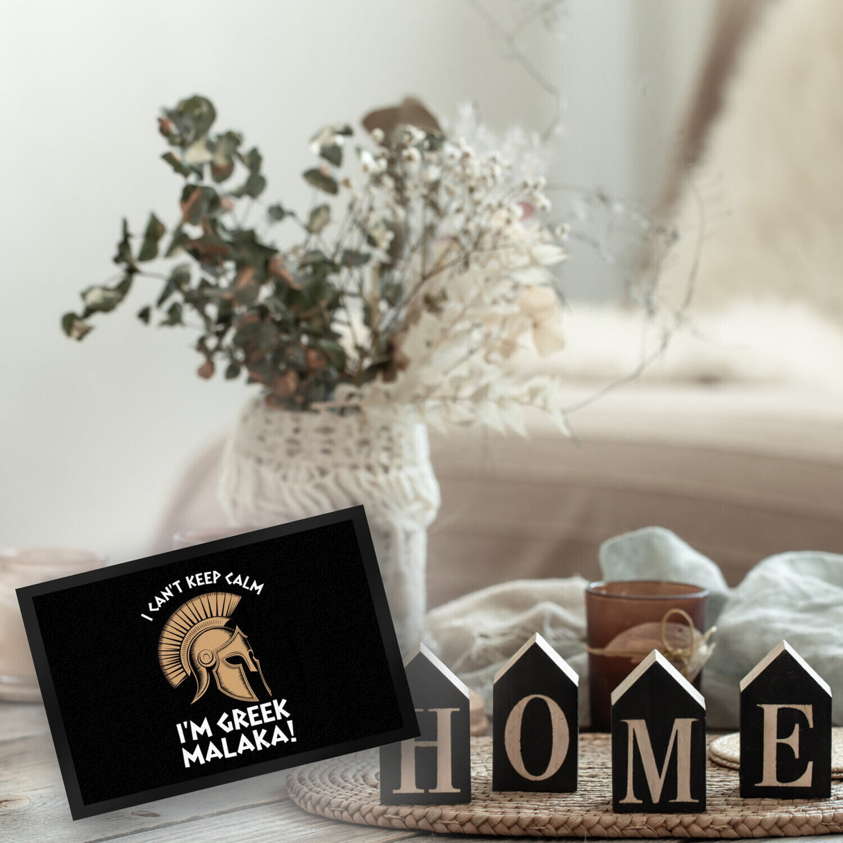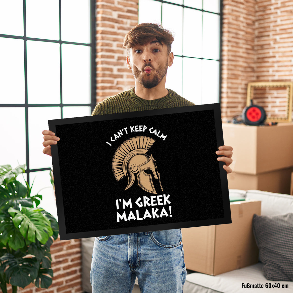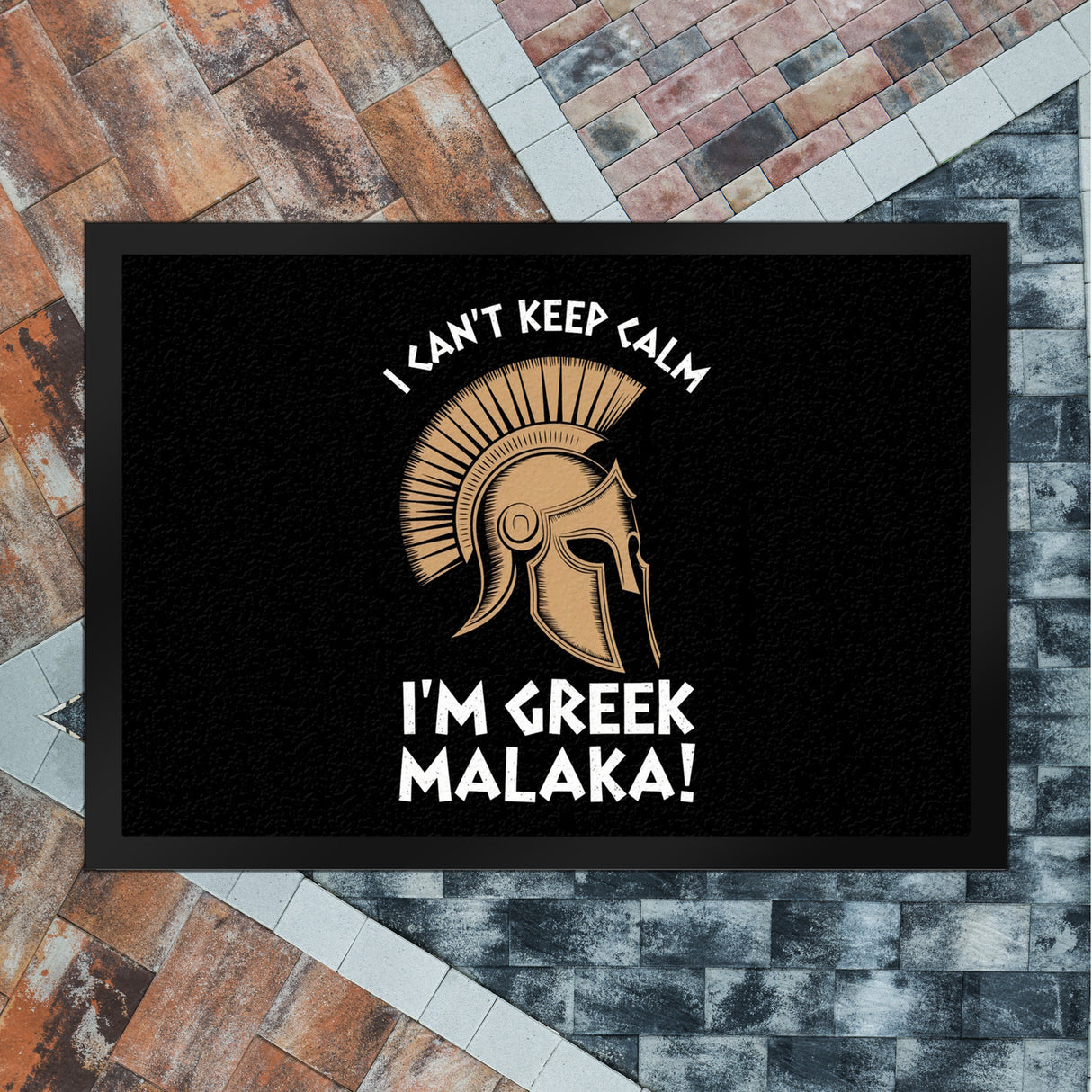 - Diese Fußmatte präsentiert ein kraftvolles griechisches Helm-Design mit einem gewagten Schriftzug: "I CAN'T KEEP CALM I'M GREEK MALAKA!" auf schwarzem Hintergrund. Perfekt für diejenigen, die gerne ein Stück griechischer Kultur vor ihrer Haustür haben möchten!