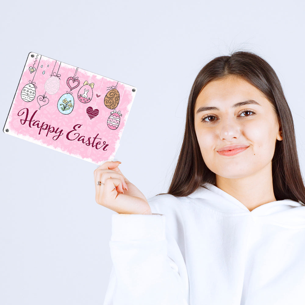• 1x Happy Easter Ostern Metallschild mit Ostereier-Motiv in rosa in der gewählten Größe