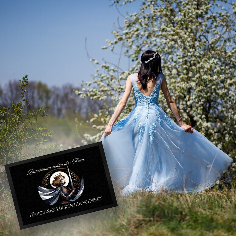 - Willkommen in deinem Schloss! Diese Fußmatte vereint das Bild einer majestätischen Königin, die selbstbewusst ihr Schwert zückt. Sie trägt eine strahlende Krone und einen königlichen, blau-weiß gestreiften Umhang.