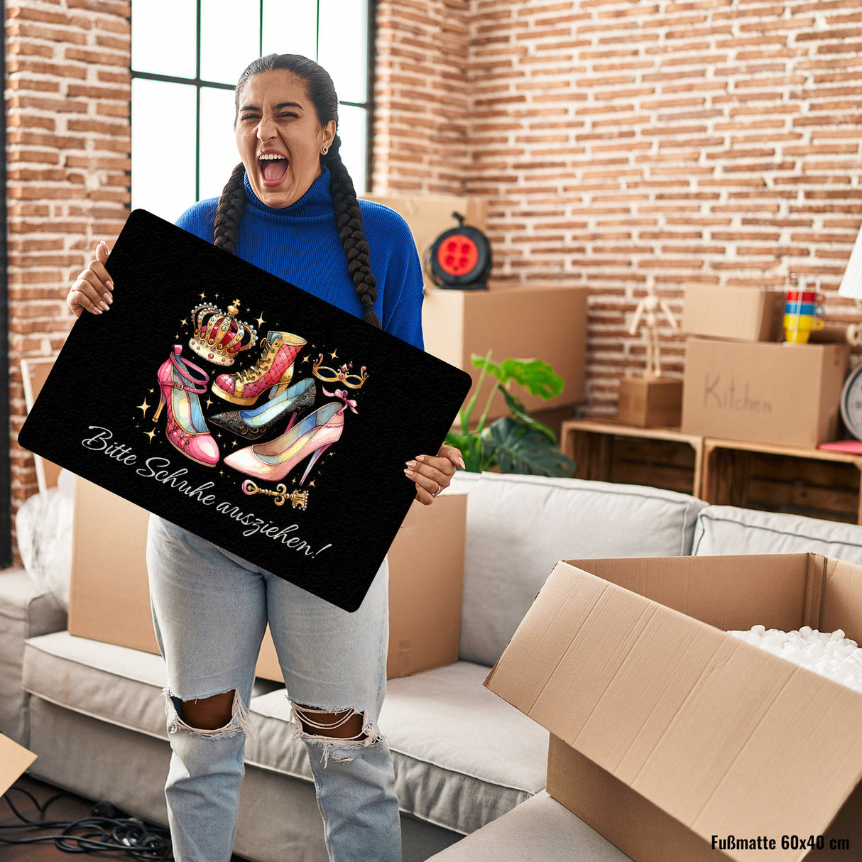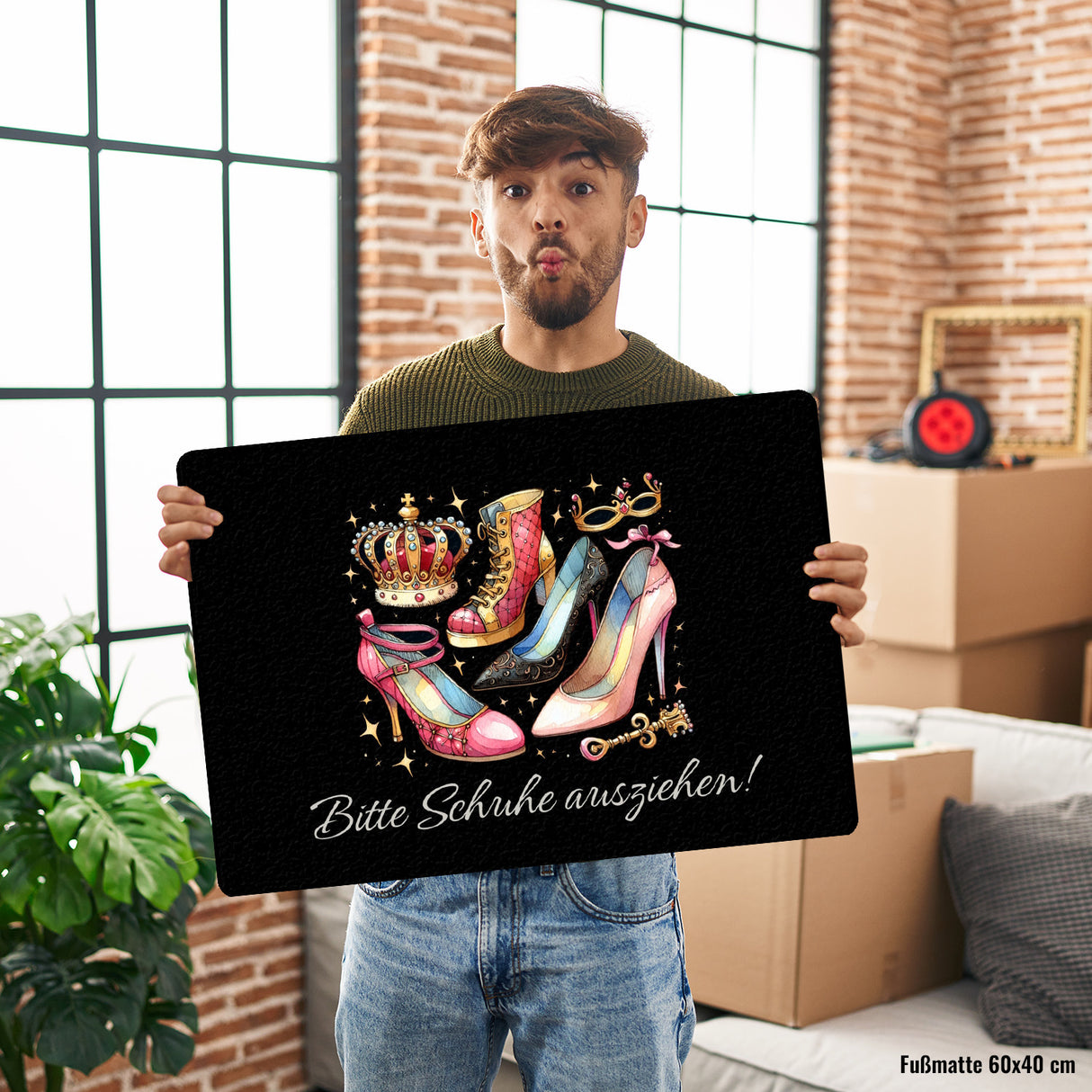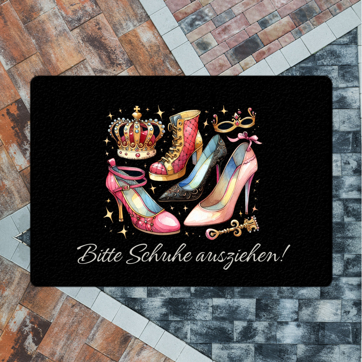- Stolper' nicht über langweilige Fußmatten! Mit unserer "Bitte Schuhe ausziehen" Eingangsmatte rollst du den verrückten Highheels-Teppich aus. Krön' deinen Eingangsbereich mit einer Farbexplosion für die Lachmuskeln!