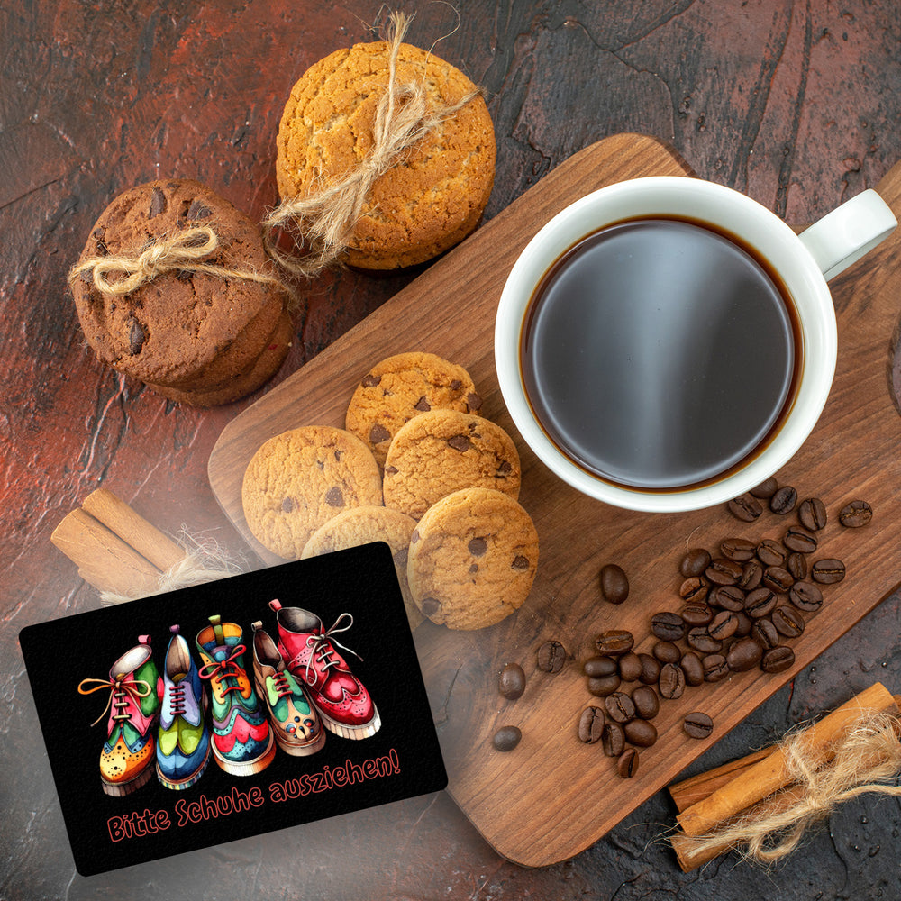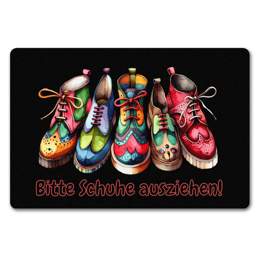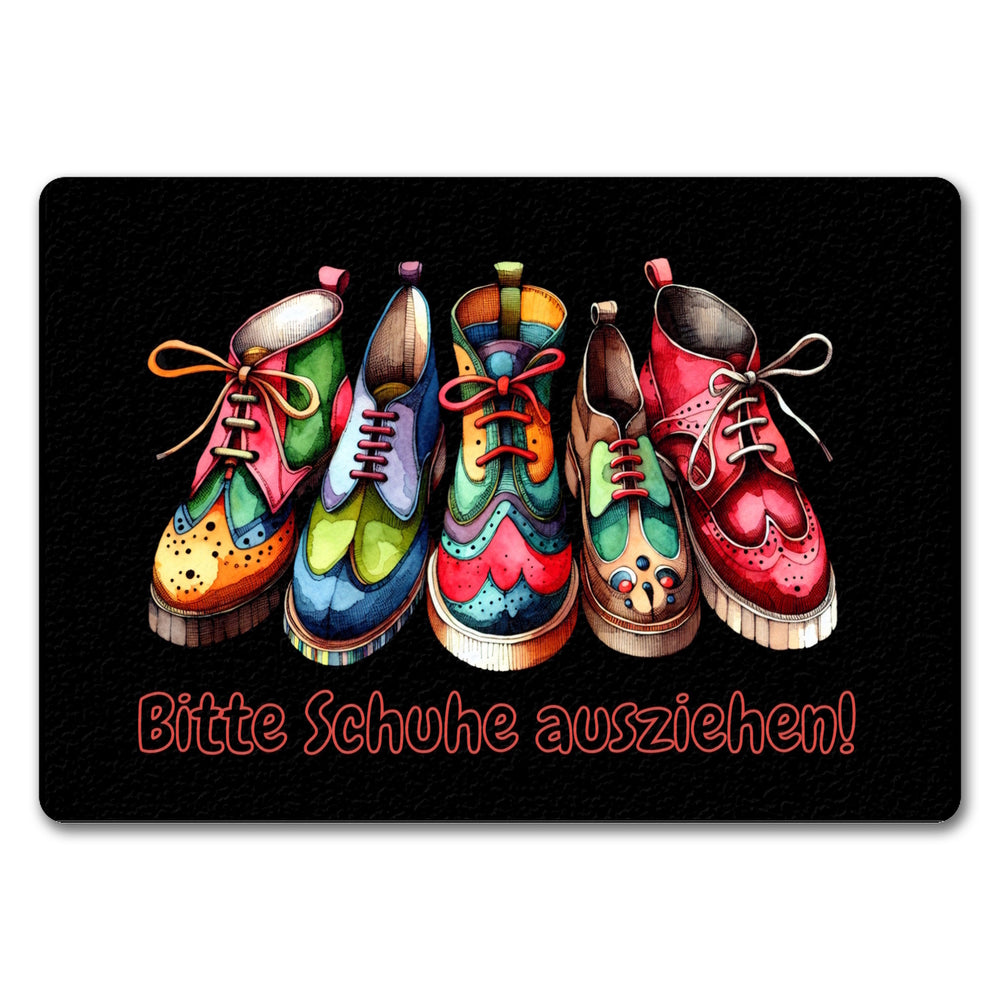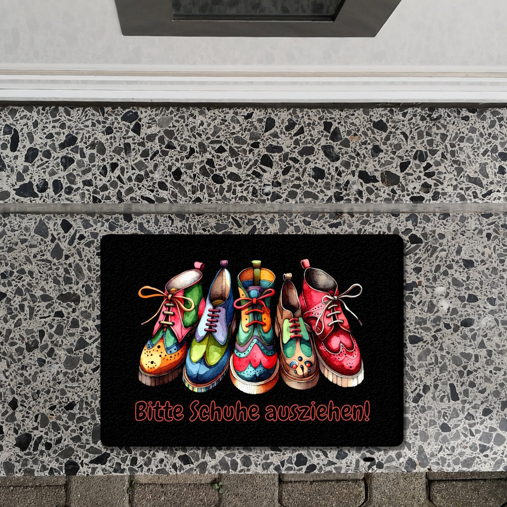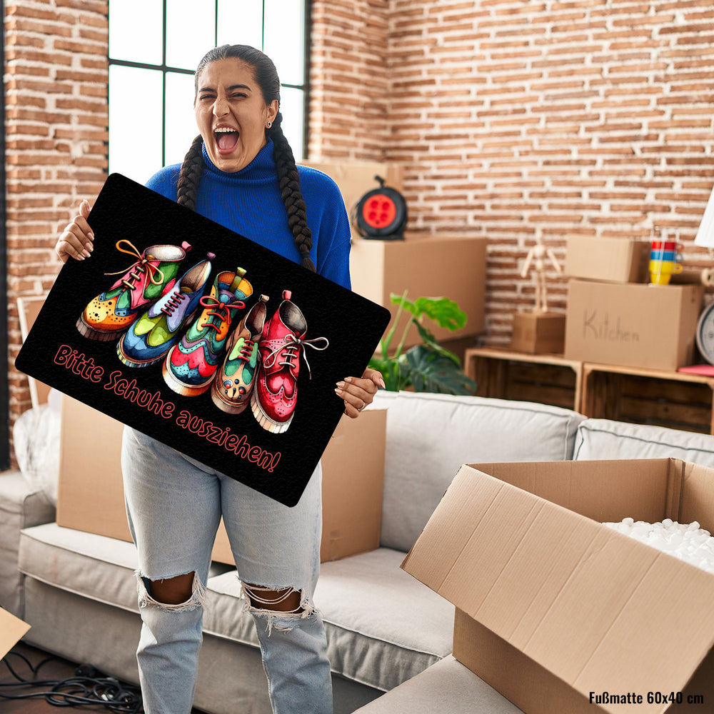 - Willkommen im Humor-Hotel, wo die "Schuhe ausziehen Fußmatte" mit ihrem frechen Spruch "Bitte Schuhe ausziehen!" euch schon an der Haustür kitzelt! Knallig, kess und mit verrückten Mustern - diese Matte macht Bescheidenheit an der Sohle fest und lädt zum herzhaften Lachen ein!