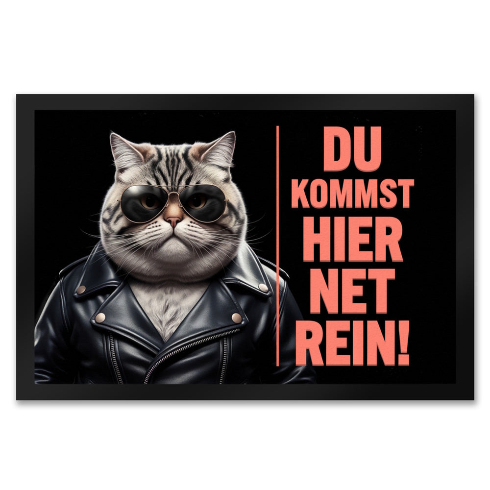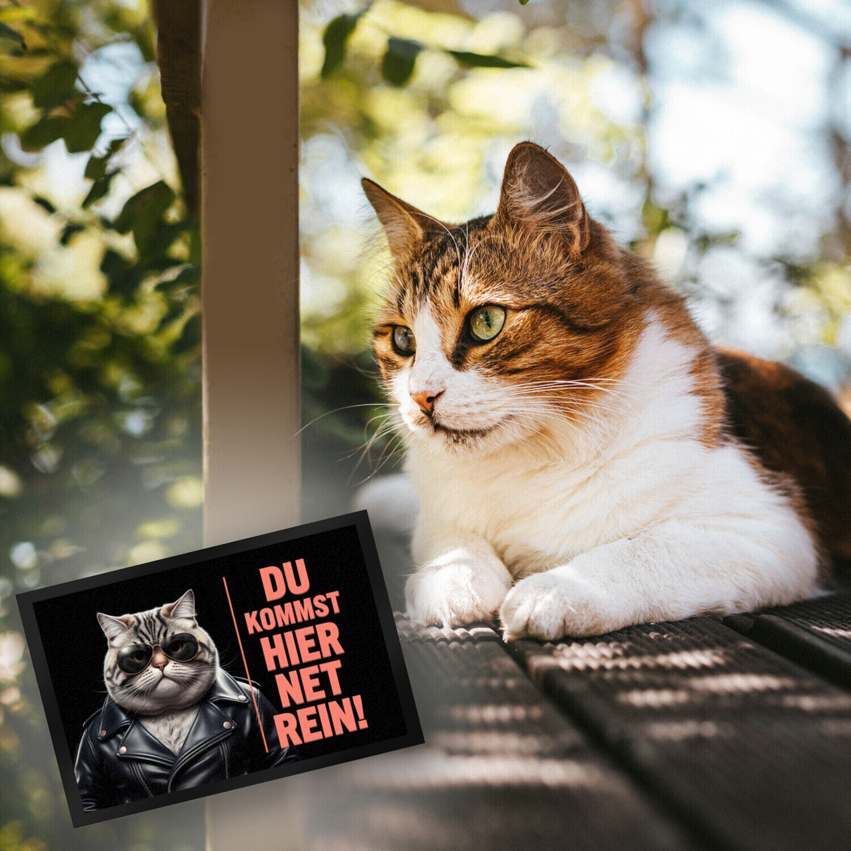 - Die "Türsteher Kater Fußmatte" besticht durch ihr auffälliges Design. Ein dicker Kater in schwarzer Lederjacke, Sonnenbrille und ernster Miene ziert den schwarzen Hintergrund. Rote Blockbuchstaben verkünden humorvoll: "Du kommst hier net rein!". Perfekt für einen lustig-stylischen Eingangsbereich!