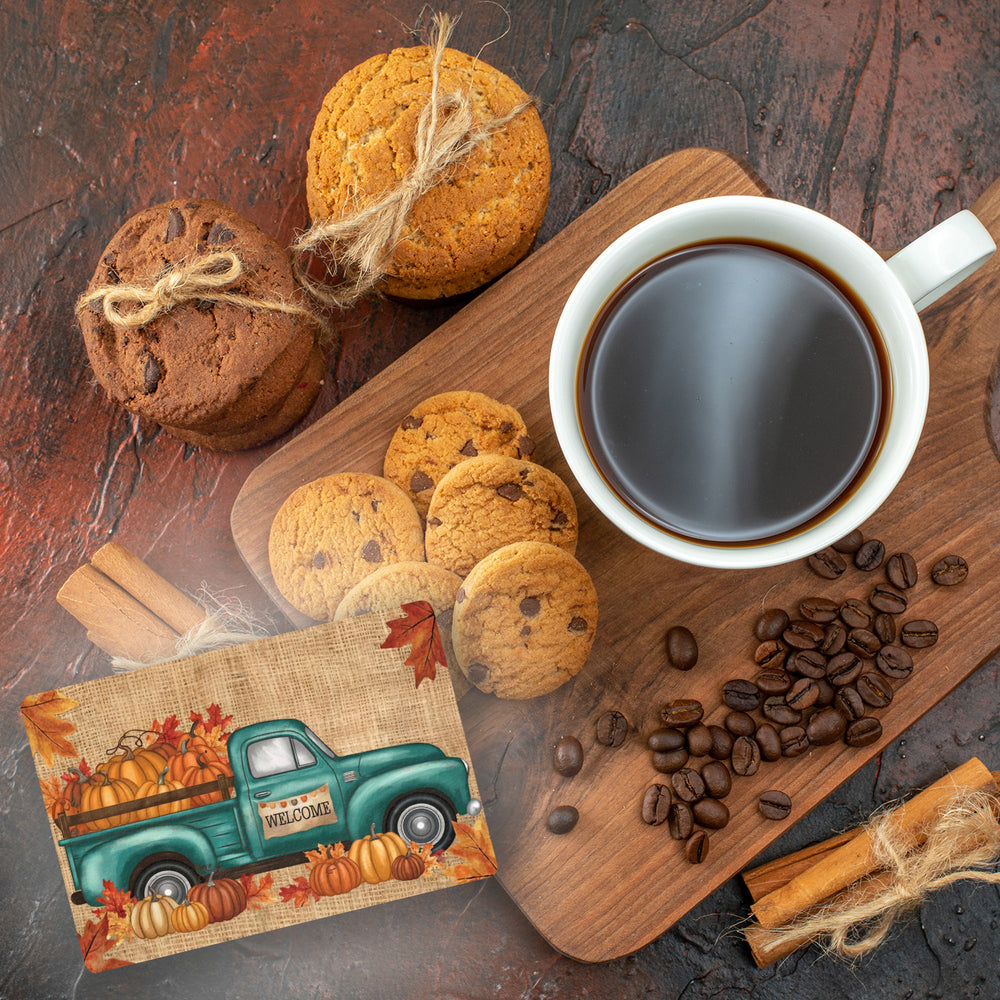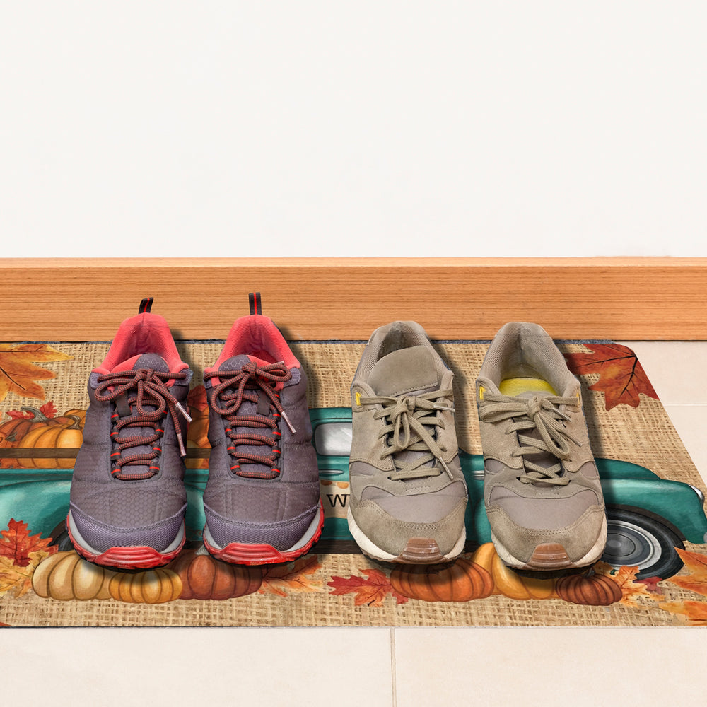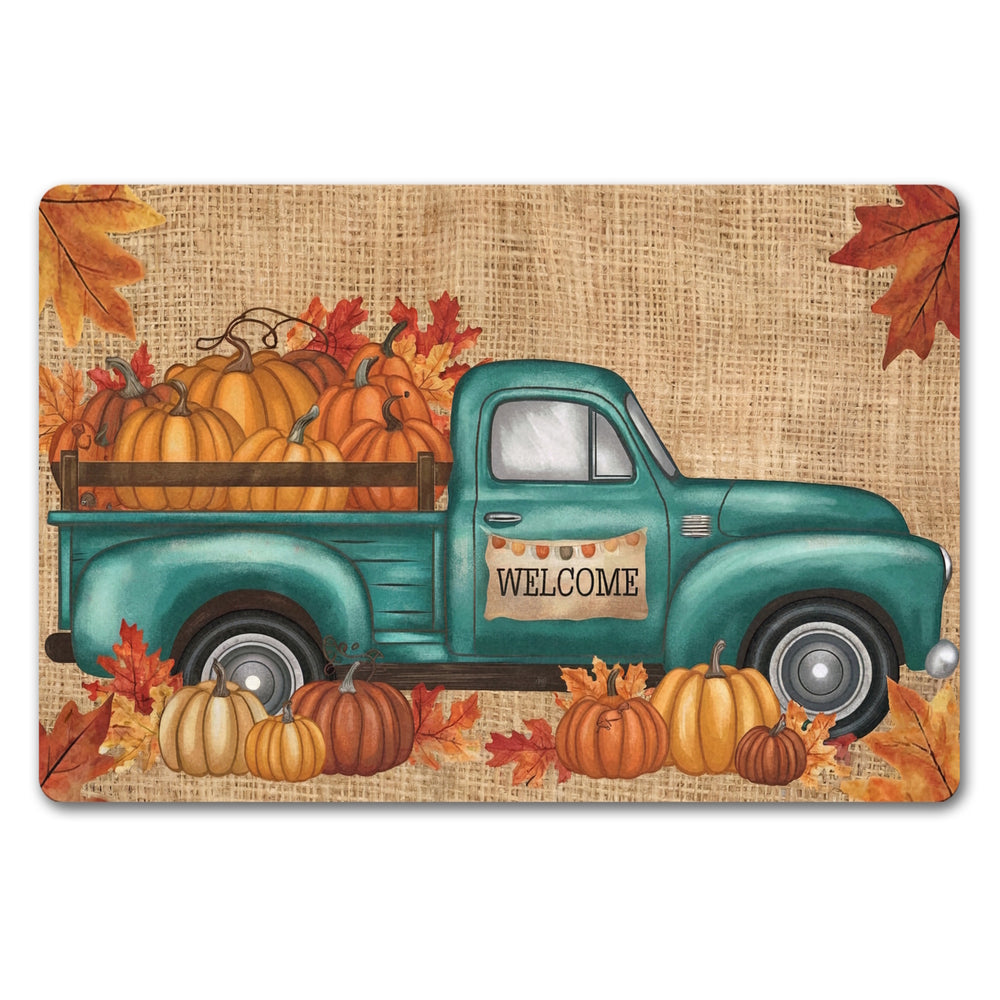 - Betritt den Herbst mit Stil! Unsere Fußmatte zeigt einen nostalgischen türkisfarbenen Lastwagen, beladen mit Kürbissen. Die herbstlichen Blätter in Orange und Rot und das große 'WELCOME' heißen deine Gäste herzlich willkommen.