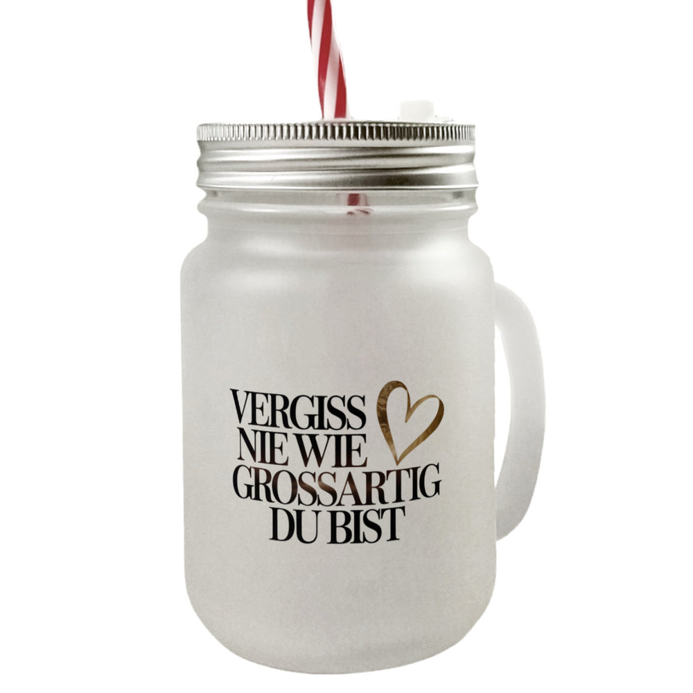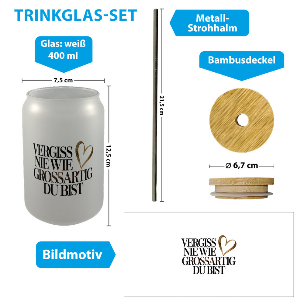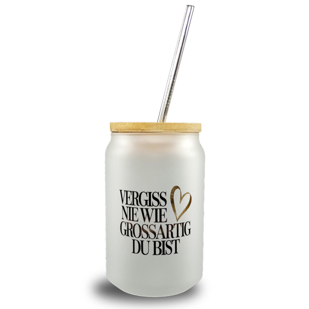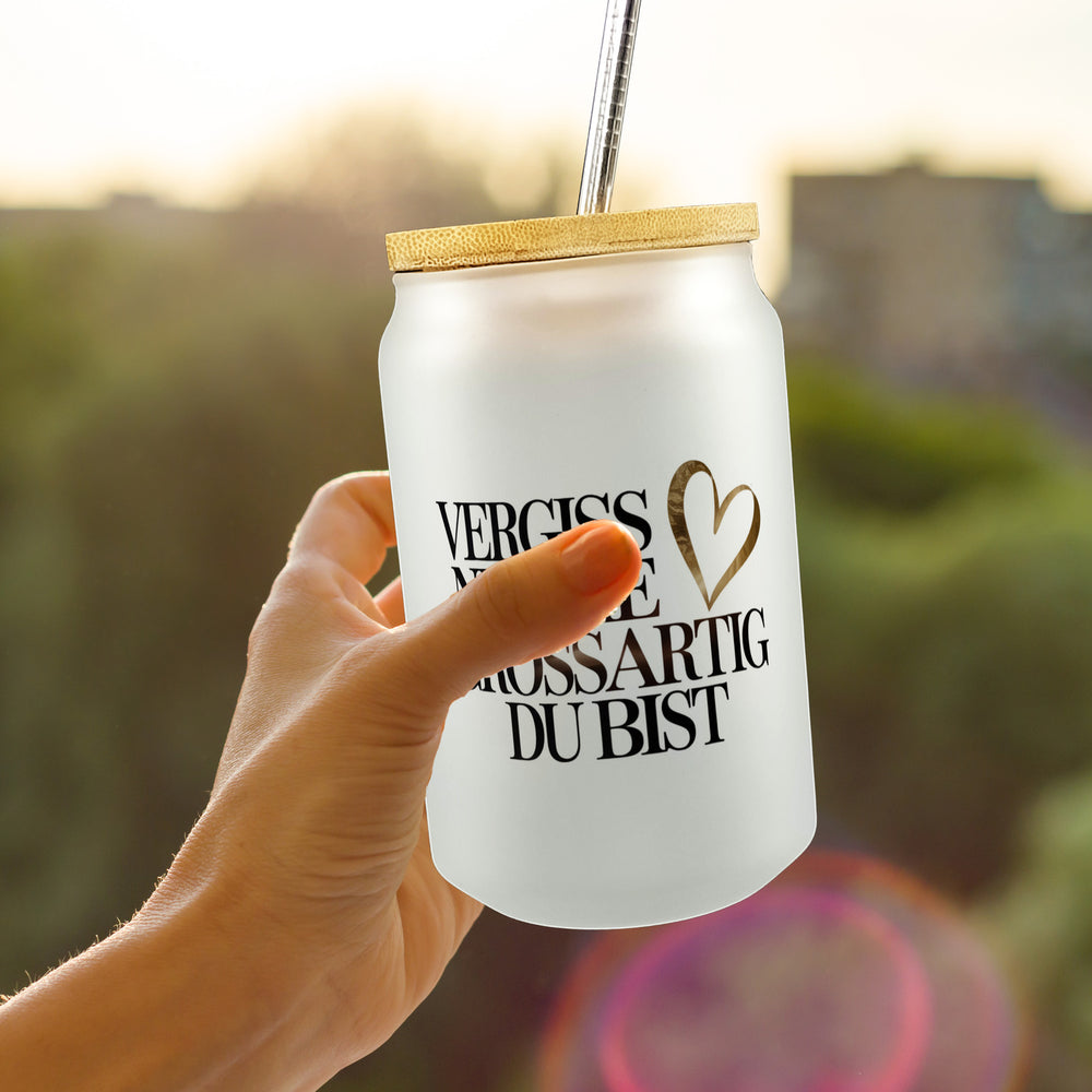 - Dieses Trinkglas besticht durch sein inspirierendes Design. In der Mitte prangt die motivierende Botschaft "VERGISS NIE WIE GROSSARTIG DU BIST", in kräftiger Serifenschrift, umgeben von einem subtilen Glanz. Ein goldfoliertes Herz schwebt elegant oberhalb. Ein weißer Hintergrund hebt die strahlende Botschaft hervor und verbreitet Hoffnung und Stärke.