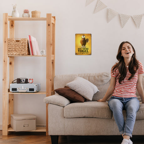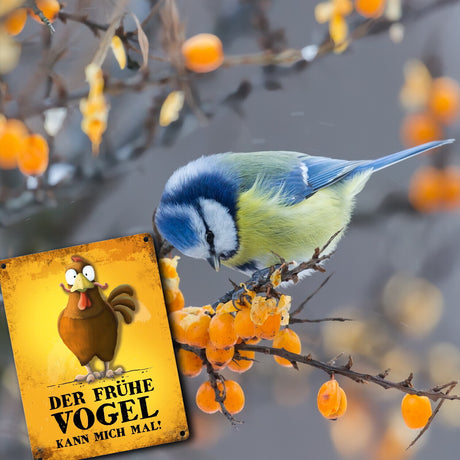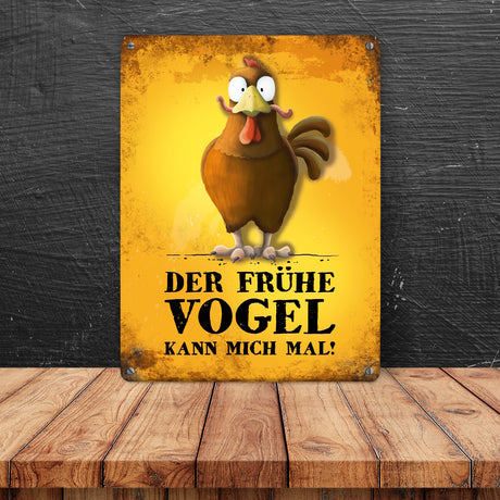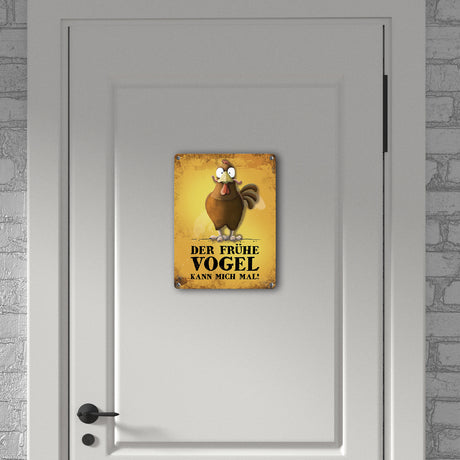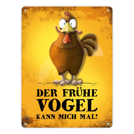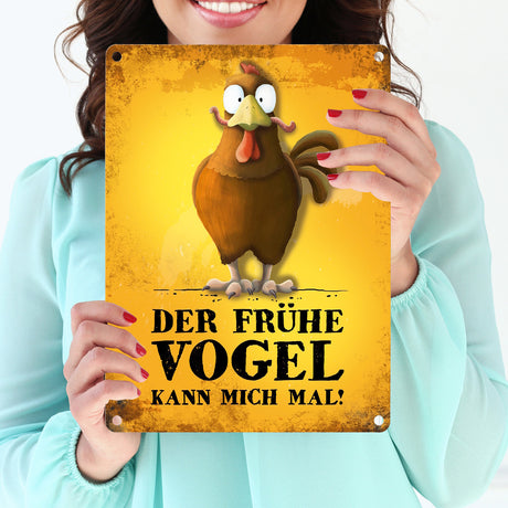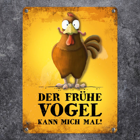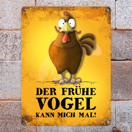 Metallschild mit Huhn Motiv und Spruch: Der frühe Vogel kann mich mal