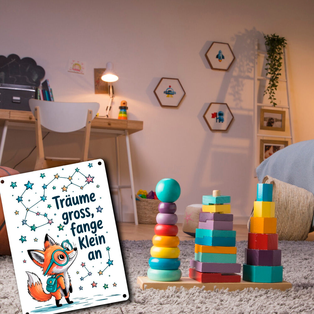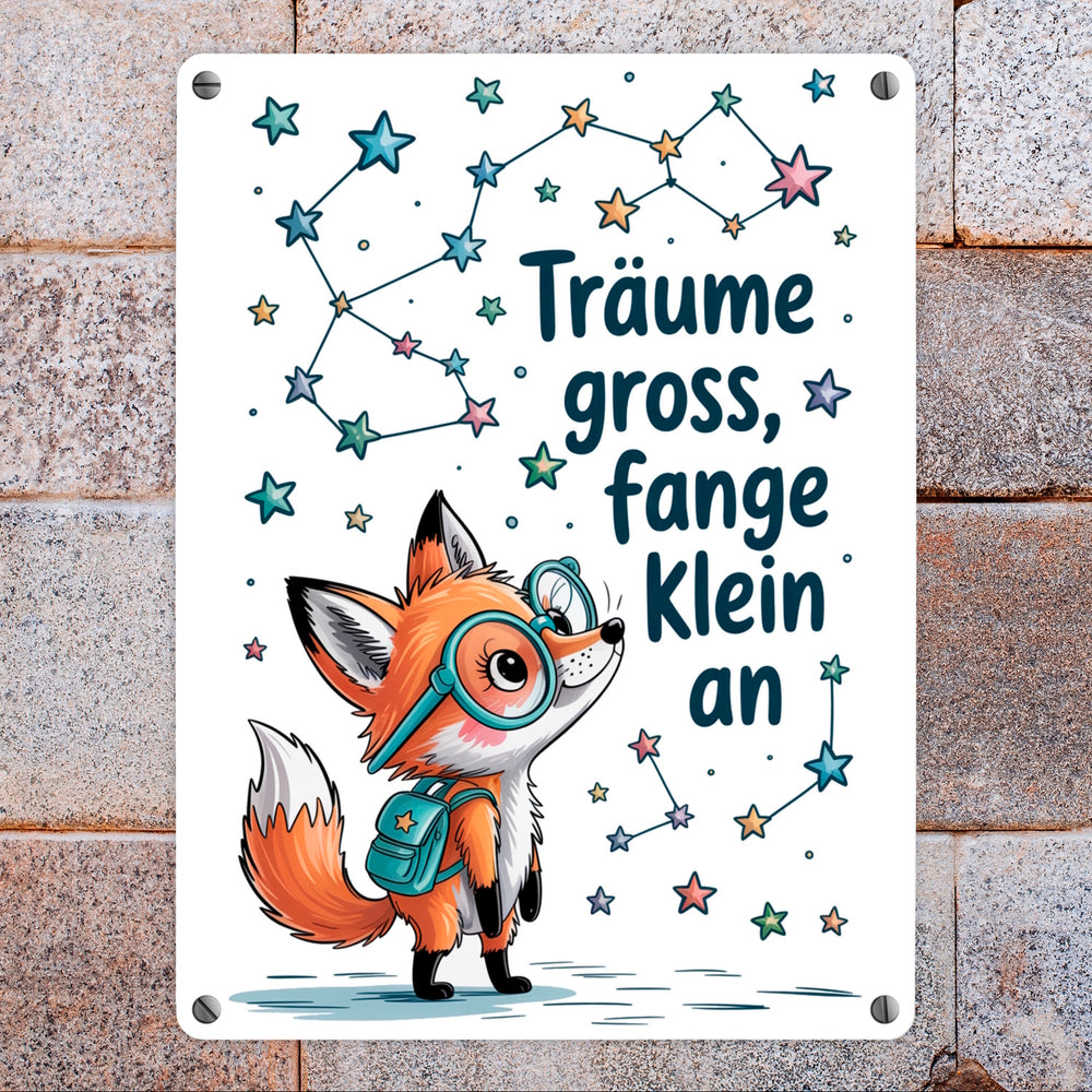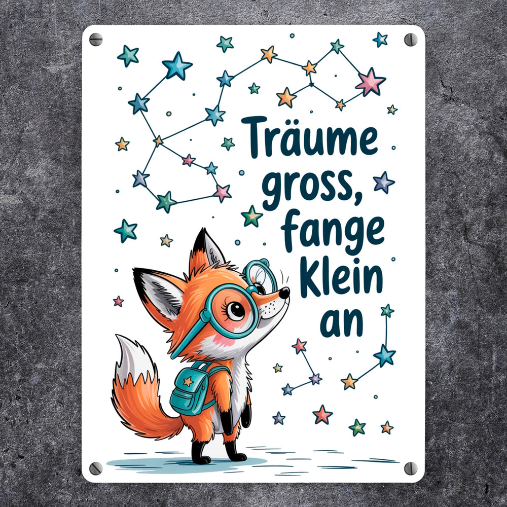 - Entdecke das bezaubernde Metallschild "Fuchs mit Rucksack - Träume groß". Im Zentrum steht ein niedlicher Fuchs mit runder Brille und leuchtend orangefarbenem Rucksack. Verspielte blaue und gelbe Sterne umgeben ihn, während er auf einer magischen Oberfläche voller verstreuter Sterne Abenteuerlust versprüht. Perfekt für deinen Raum mit einem Hauch von Freude.
