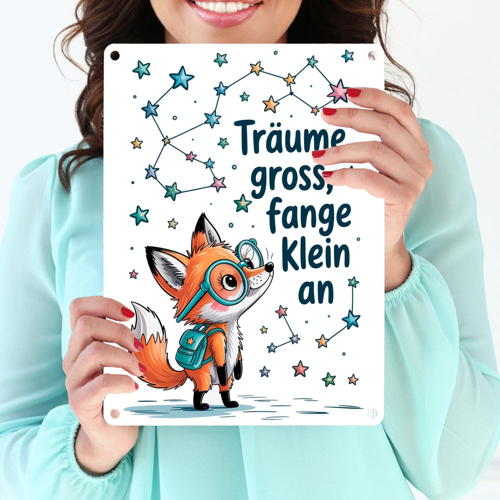 Fuchs mit Rucksack - Träume gross Metallschild in 15x20 cm