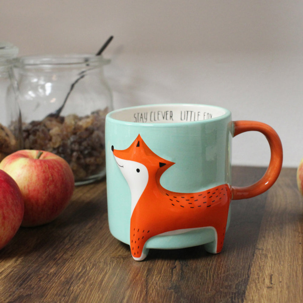 • Die Fuchs-Figur steht aus der Oberfläche der Tasse heraus.