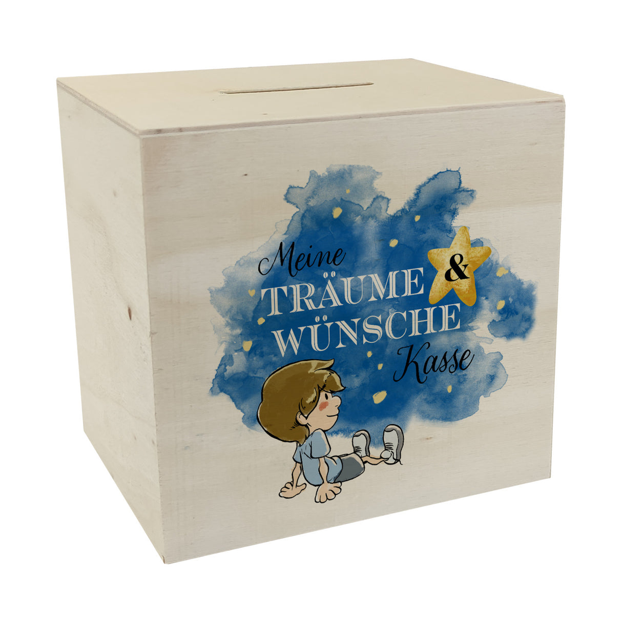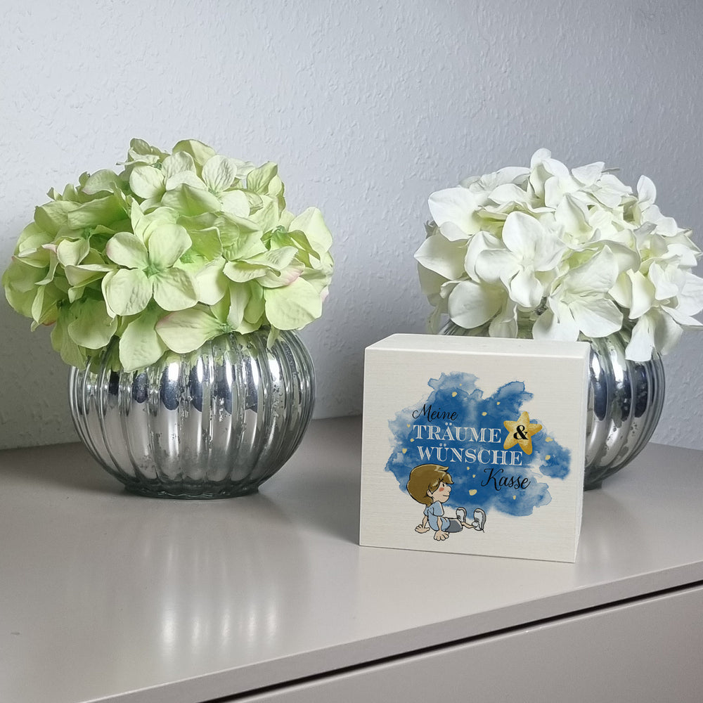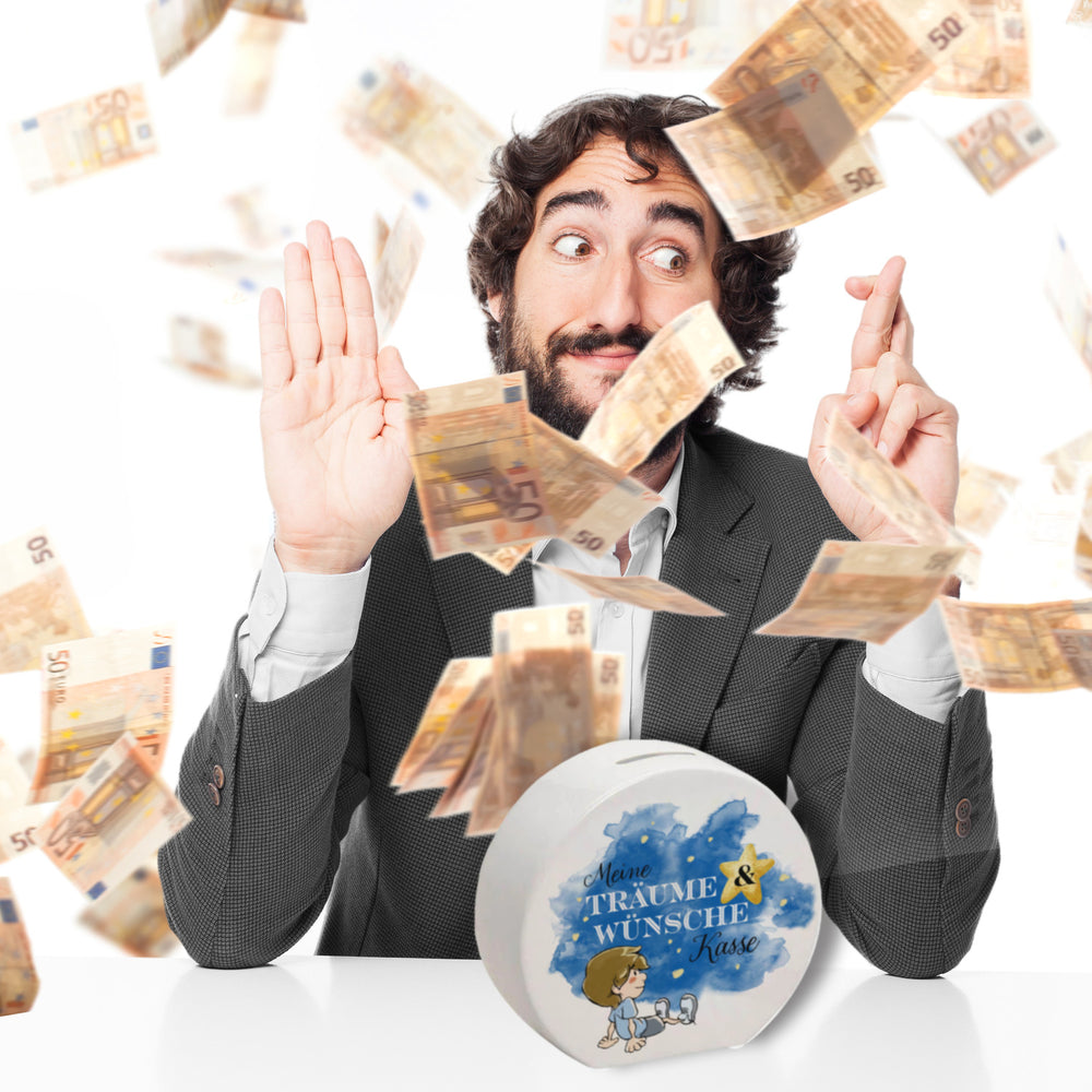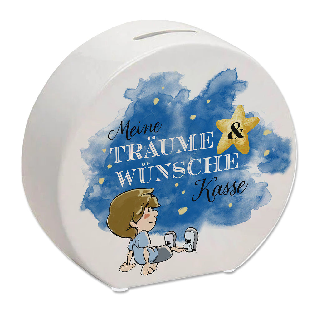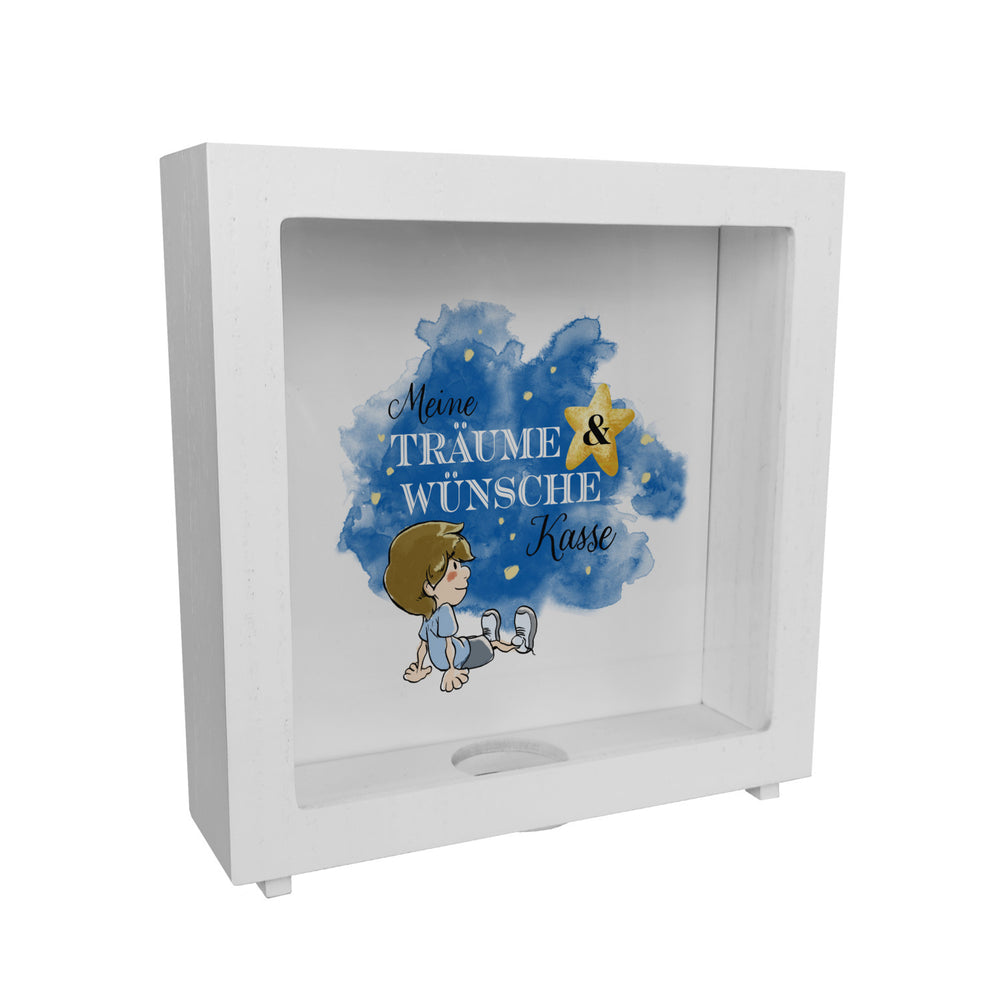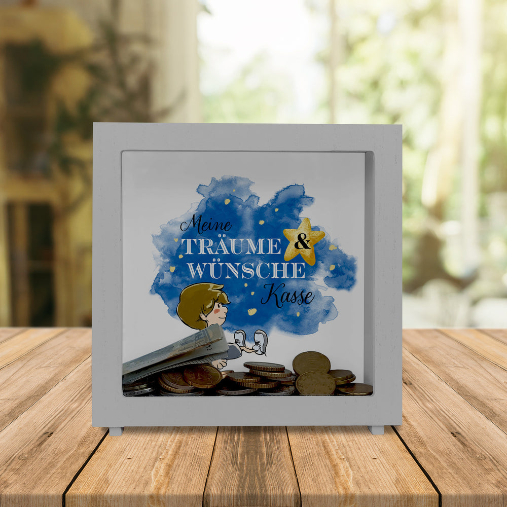 - 1x Spardose mit kleinem Jungen und Spruch - Meine Träume & Wünsche Kasse in der gewählten Ausführung