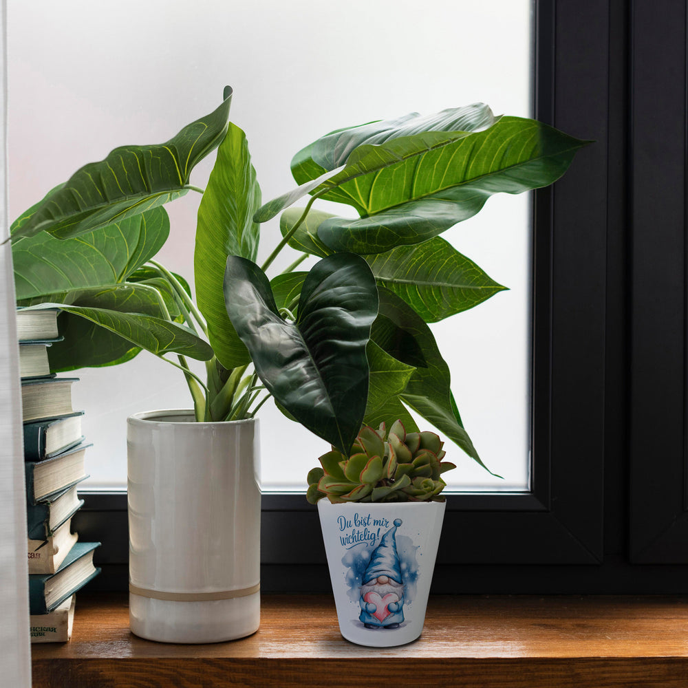 - Der Blumentopf zeigt eine entzückende blaue Wichtel-Figur mit spitzer Mütze und weißem Bart. Der Wichtel hält ein herzförmiges Objekt an seiner Brust, umrahmt von einem verspielten blauen Hintergrund mit Spritzern. Darüber steht in eleganten blauen Kursivbuchstaben der Spruch "Du bist mir wichtelig!", was eine liebevolle Botschaft übermittelt.