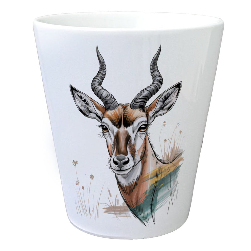 Der Blumentopf zeigt eine kunstvolle Illustration einer anmutigen Antilope auf einem nahtlosen weißen Hintergrund. Mit ihren großen, sanften braunen Augen und elegant geschwungenen samtigen Hörnern verleiht sie jedem Raum einen Hauch von Wildnis. Dezente Hinweise: Material: Keramik / Höhe: ca. 10 cm, Durchmesser oben: ca. 9cm / Mit Bodenloch zur Vermeidung von Staunässe.