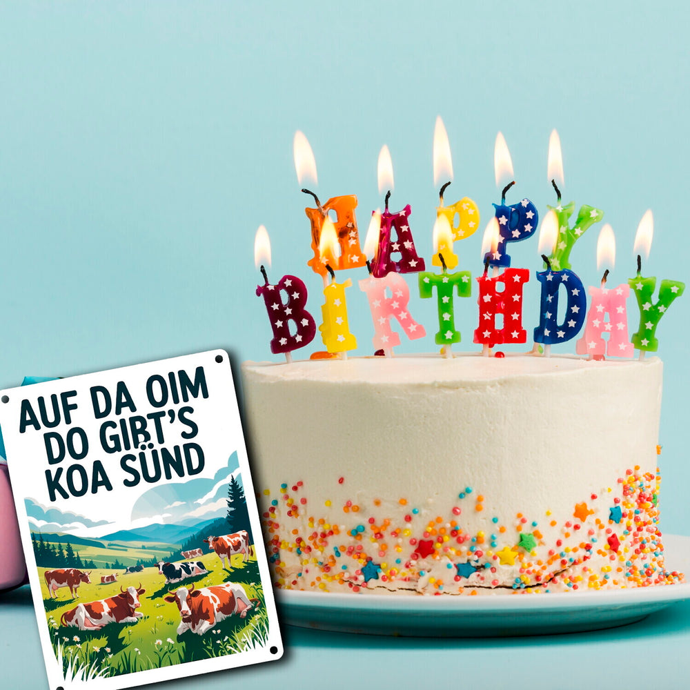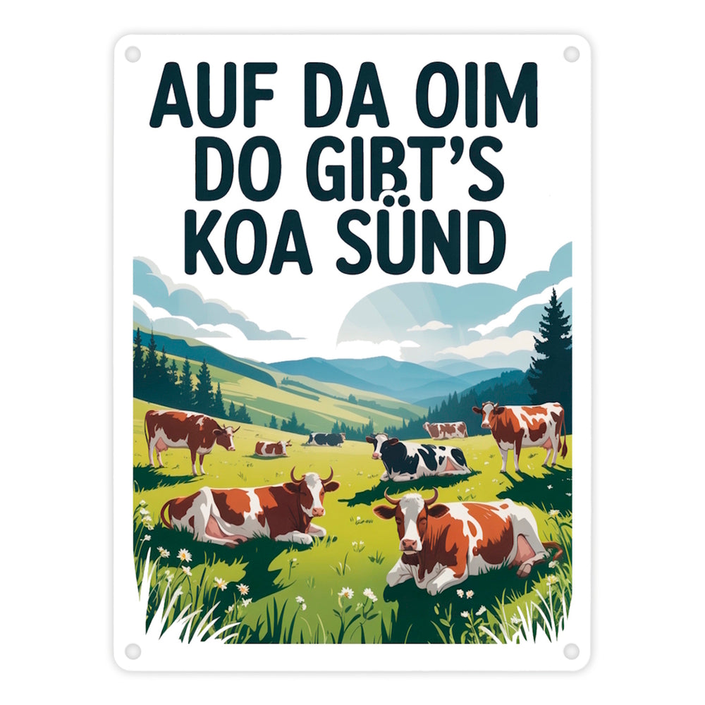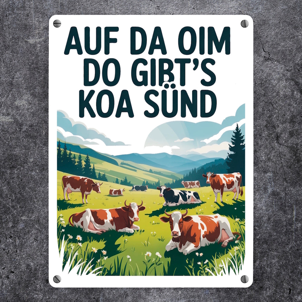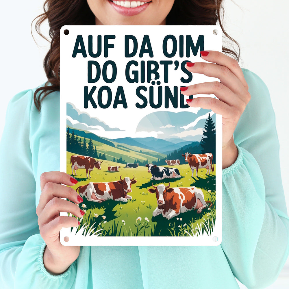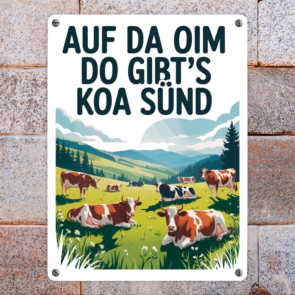 - Dieses Metallschild zeigt eine idyllische Berglandschaft mit glücklichen Kühen auf einer grünen Almwiese. Der Himmel ist blau und wolkenverhangen. Im Vordergrund steht eine prächtige Kuh mit großen Hörnern. Der witzige Text "Auf da Oim, do gibt's koa Sünd" ziert das Schild in fetten, großgeschriebenen Buchstaben.