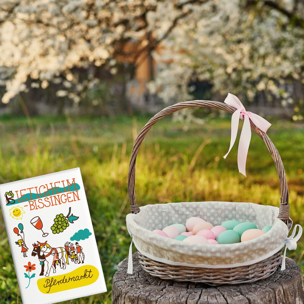 - Der Bietigheim-Bissingen Wimmelbild Souvenir Magnet beeindruckt mit einer lebendigen und farbenfrohen Darstellung der Stadt. Ein humorvoller regionaler Spruch und ein einladendes Banner fesseln den Blick. Eine fröhliche Sonne, Weintrauben und ein Mädchen mit Ballons runden das dynamische Design ab, das städtischen Charme und Wein vereint.