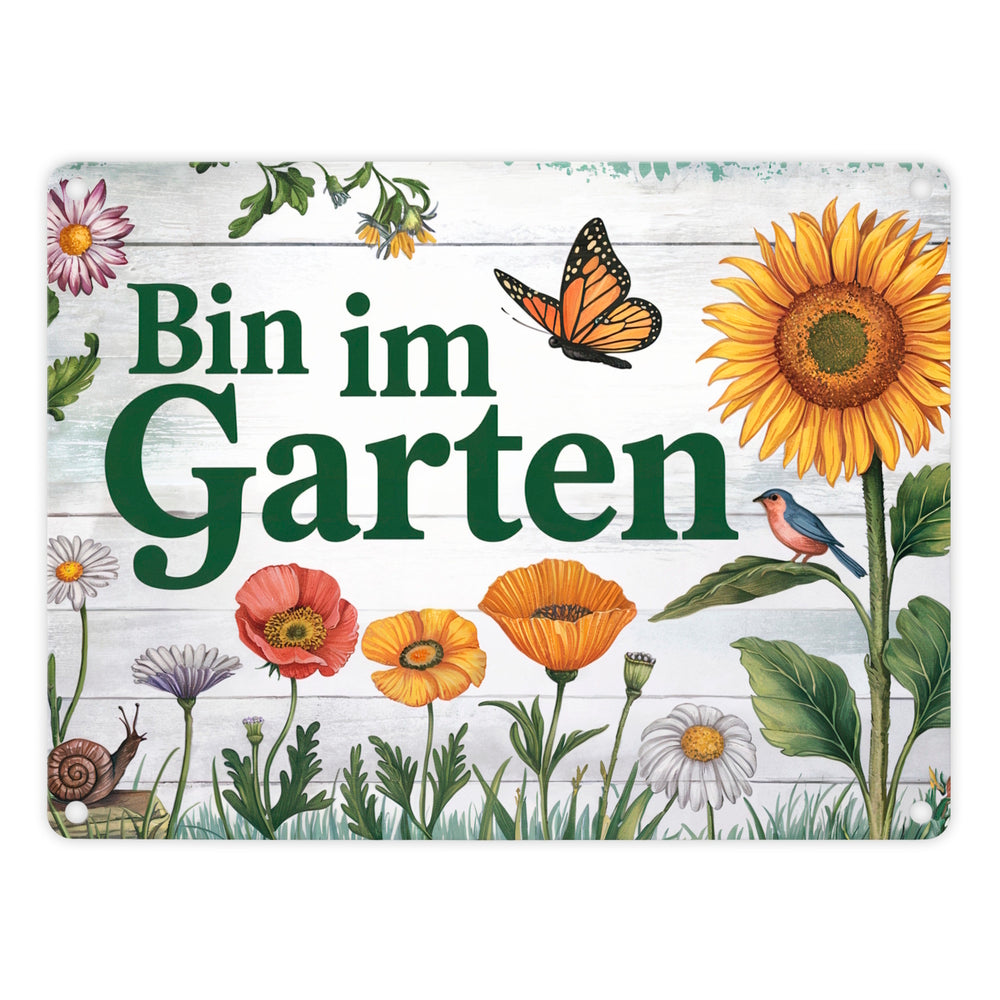 - Das "Bin im Garten" Metallschild ist ein charmantes Dekostück für jeden Garten. Es zeigt einen Schmetterling über einer lebhaften Blumenszenerie mit Sonnenblume, Mohnblumen und Gänseblümchen. Der Hintergrund ist rustikal verwittert, für einen nostalgischen Vintage-Look. Ein niedlicher Vogel und eine Schnecke verleihen dem Schild einen Hauch von Humor.