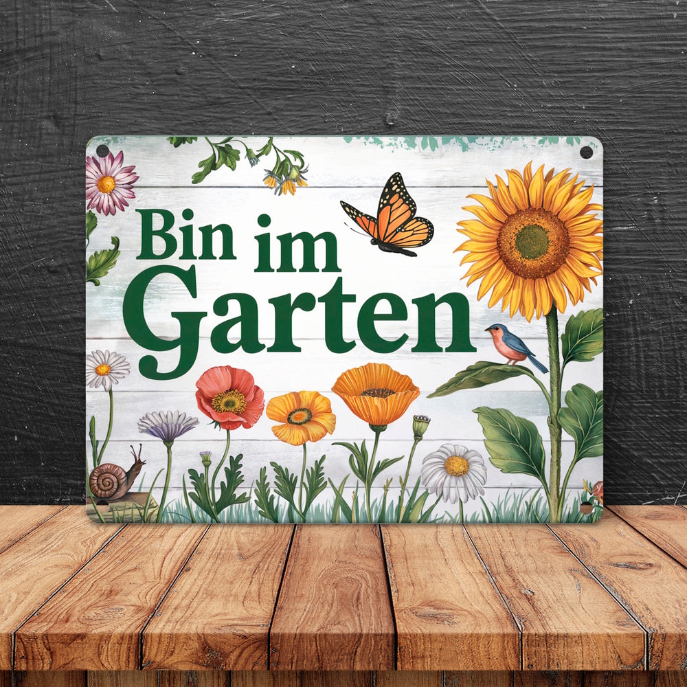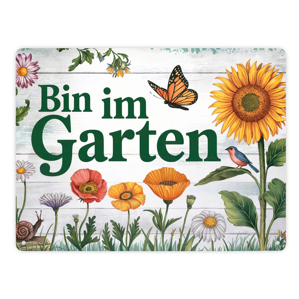 - 1x Bin im Garten Metallschild in 15x20 cm mit Schmetterling und Blumen in der gewählten Größe