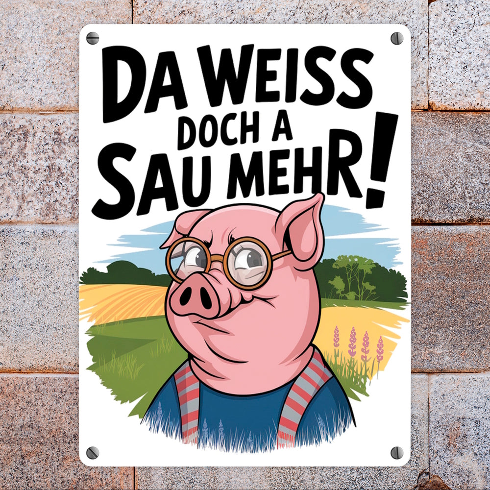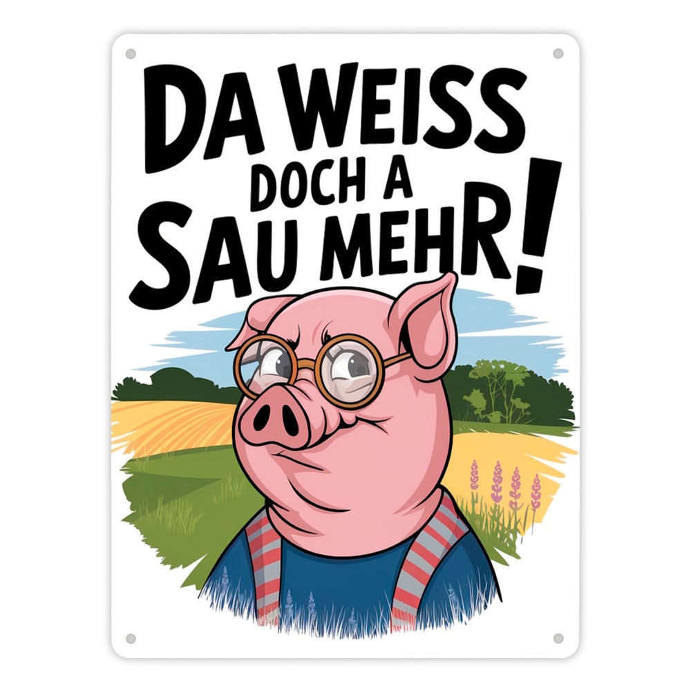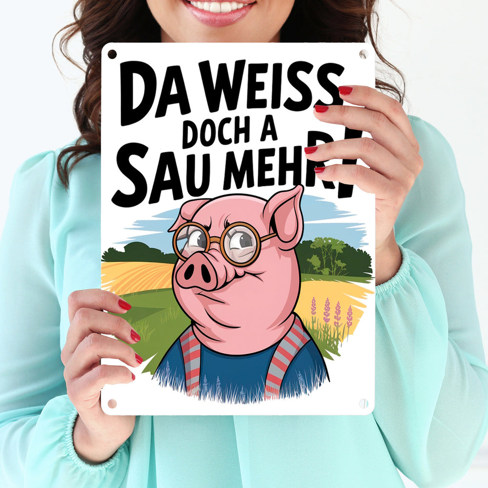 - Dieses Metallschild vereint Humor und Stil mit einer cleveren Cartoon-Sau im Fokus. Die Sau trägt eine Brille und ein blaues Hemd mit roten Streifen und steht vor einer idyllischen Landschaft. Ein fetter Spruch krönt das Design: "Da weiß doch a Sau mehr!". Perfekt für Fans von witzigem, ländlichem Charme!