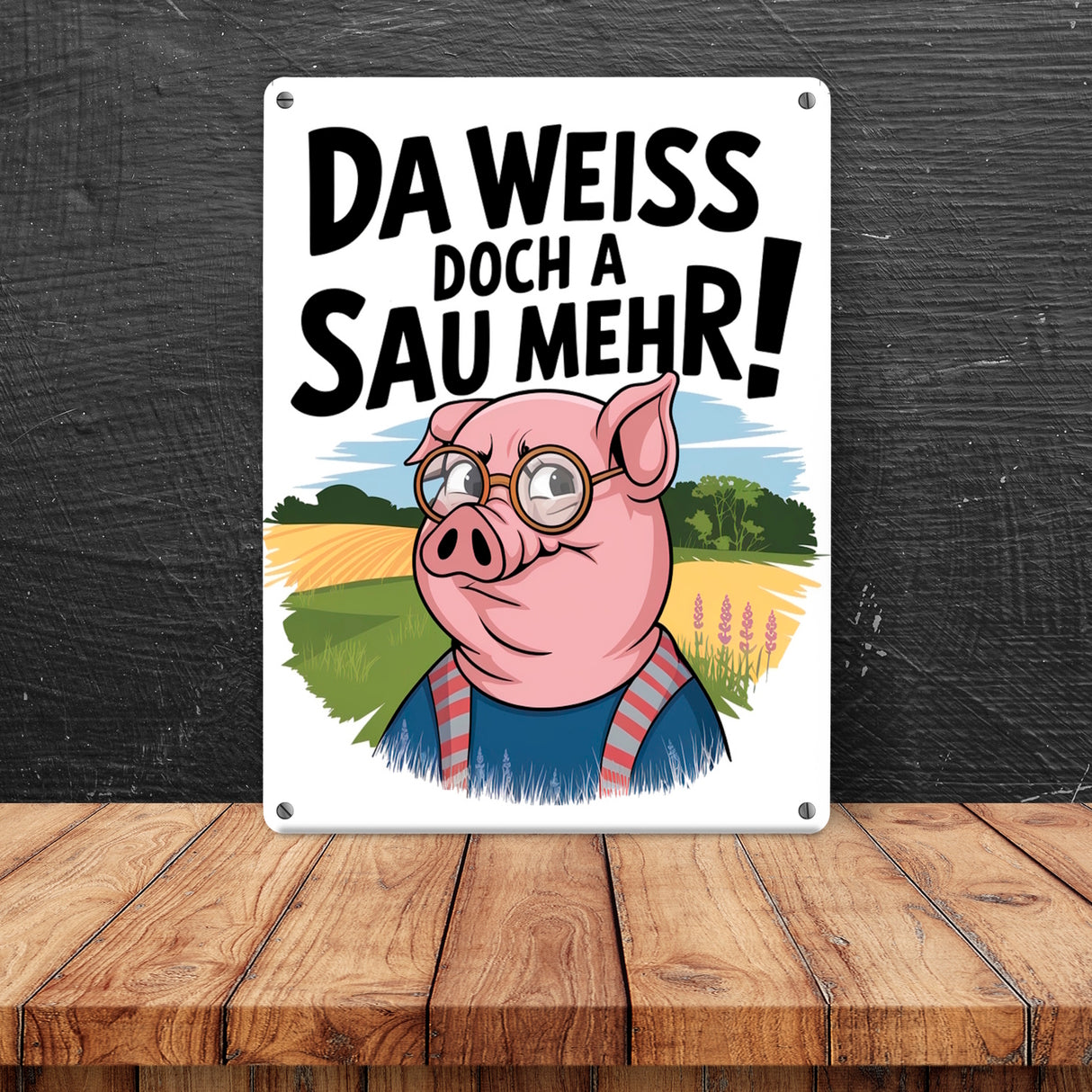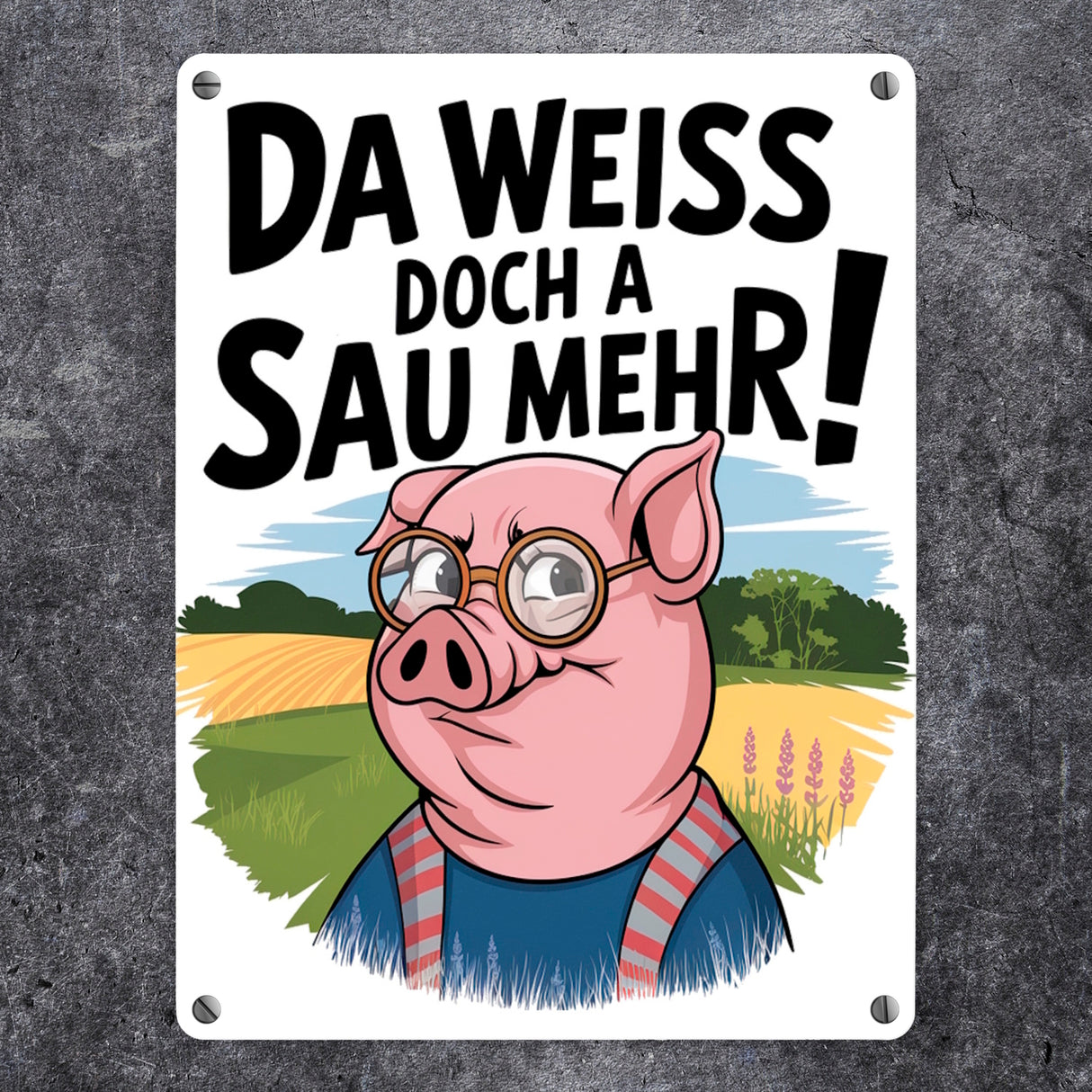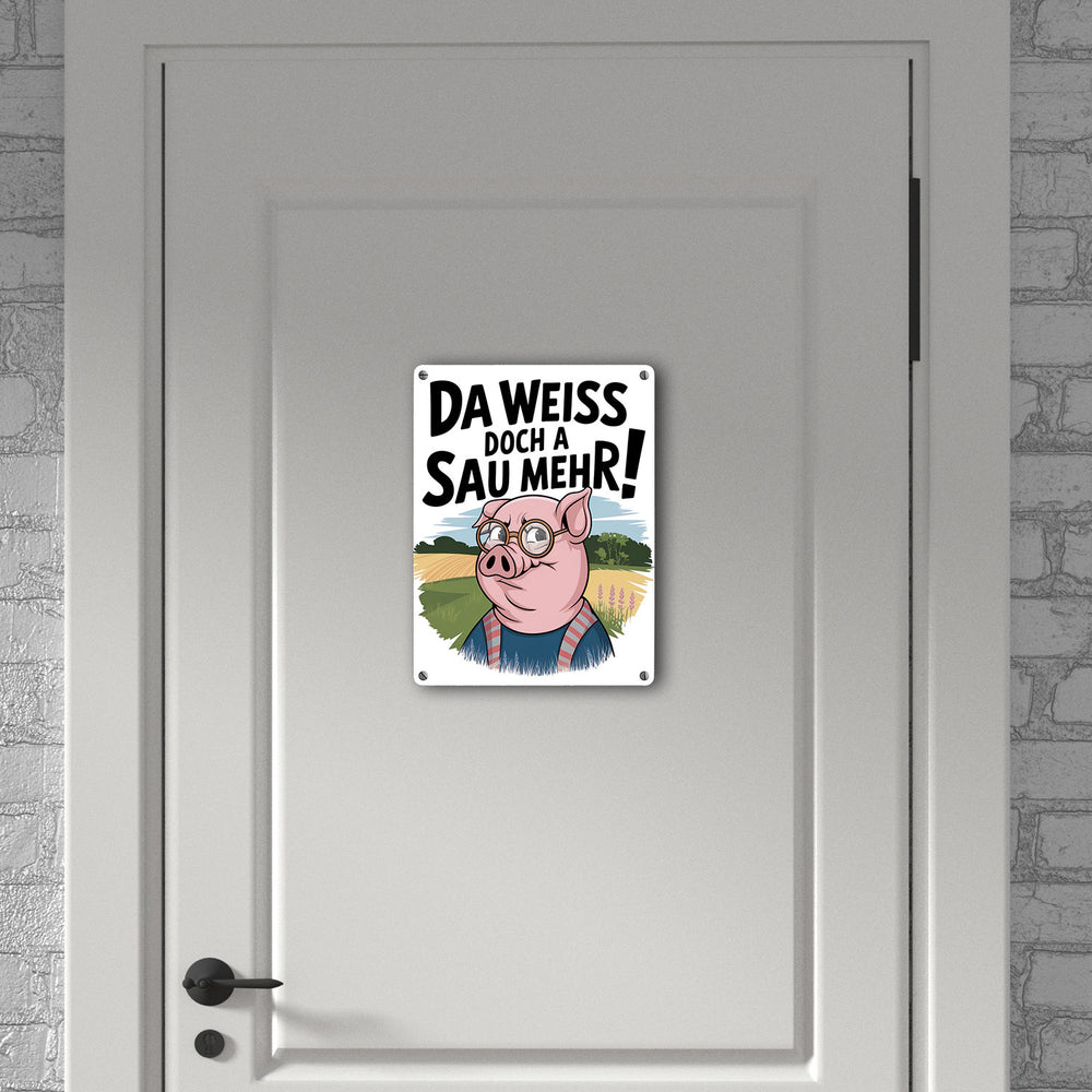 - Dieses Metallschild vereint Humor und Stil mit einer cleveren Cartoon-Sau im Fokus. Die Sau trägt eine Brille und ein blaues Hemd mit roten Streifen und steht vor einer idyllischen Landschaft. Ein fetter Spruch krönt das Design: "Da weiß doch a Sau mehr!". Perfekt für Fans von witzigem, ländlichem Charme!