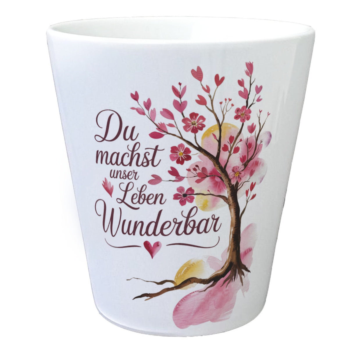- Der Blumentopf zeigt ein charmantes Baum-Motiv mit blühenden Blumen und Herzblättern. Auf weißem Hintergrund steht der Spruch "Du machst unser Leben wunderbar" in eleganter Aquarell-Pastelloptik. Der rosa blühende Baum mit weitausladenden Ästen wird von farbenfrohen Aquarellspritzern umrahmt und verbreitet pure Lebensfreude.