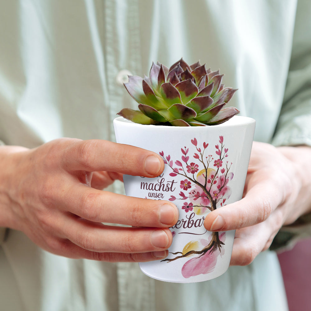 Der Blumentopf zeigt ein charmantes Baum-Motiv mit blühenden Blumen und Herzblättern. Auf weißem Hintergrund steht der Spruch "Du machst unser Leben wunderbar" in eleganter Aquarell-Pastelloptik. Der rosa blühende Baum mit weitausladenden Ästen wi Hinweise: Material: Keramik / Höhe: ca. 10 cm, Durchmesser oben: ca. 9cm / Mit Bodenloch zur Vermeidung von Staunässe.