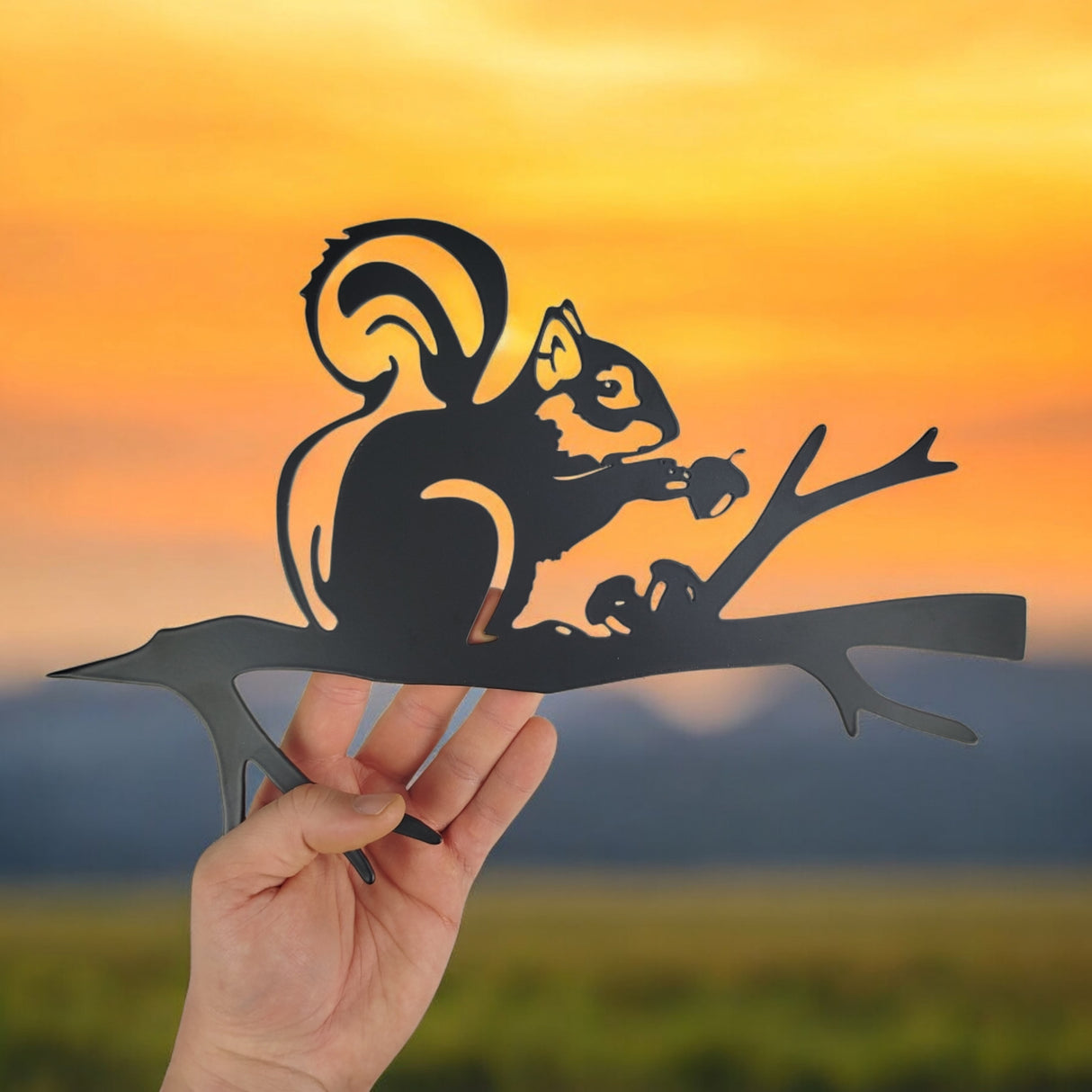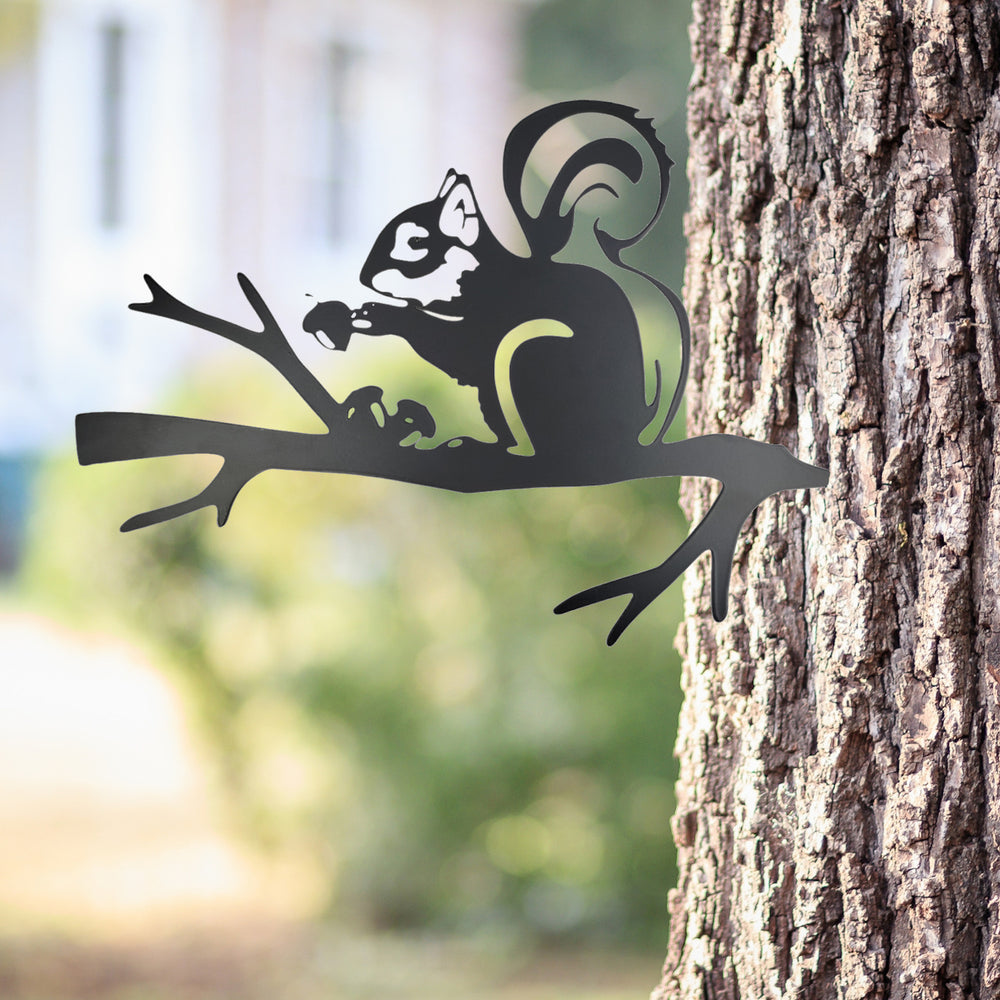 - Der Gartenstecker bringt ein Eichhörnchen mit Nuss in Ihrem Garten zum Leben! Gefertigt aus robustem Metall und in elegantem Schwarz gehalten, ist er nicht nur ein dekoratives Highlight, sondern auch einfach zu befestigen. Dank der Spitze auf der linken Seite kann er in Bäume oder andere Oberflächen eingeschlagen werden.