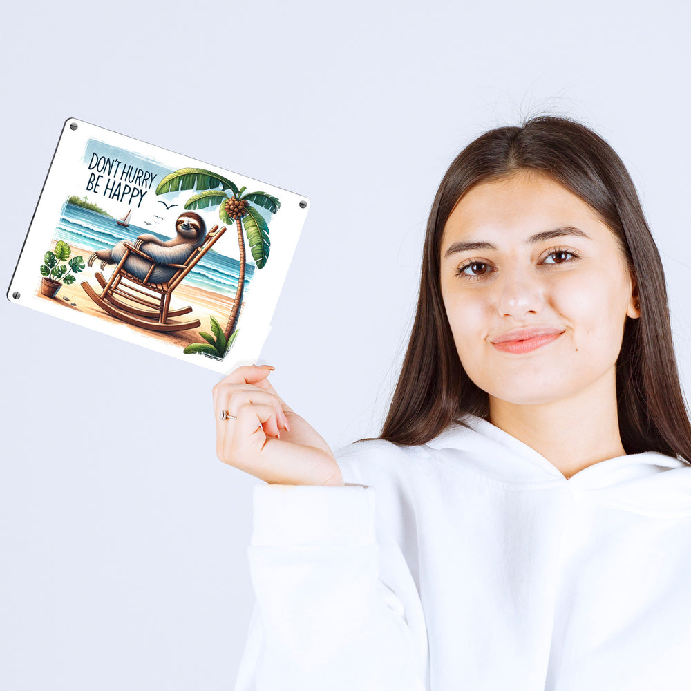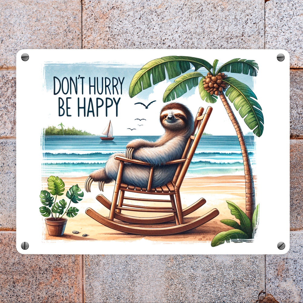 Faultier am Strand Metallschild in 15x20 cm mit Spruch Don't hurry - be happy