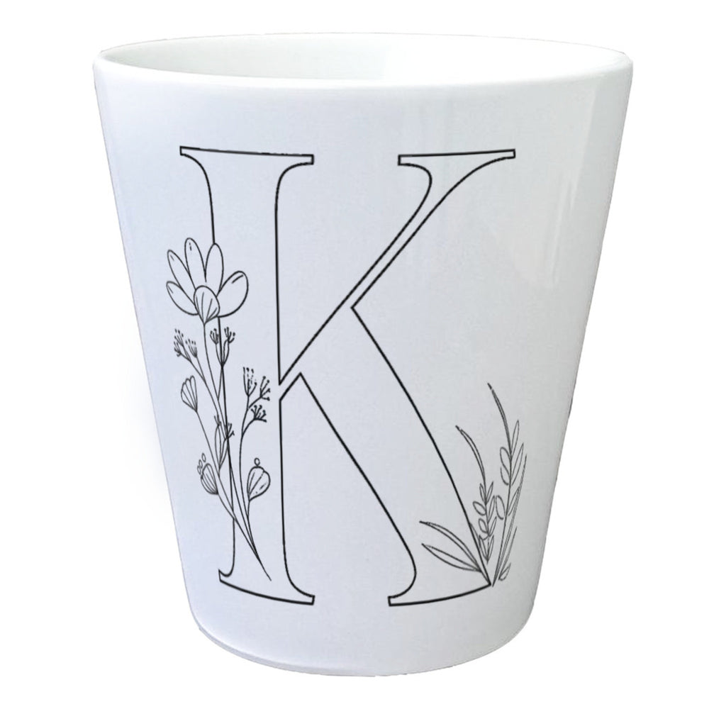 Der Floral Buchstabe K Blumentopf zum Ausmalen präsentiert ein kunstvolles Design. Der Buchstabe K ist mit zarten Blumen und einer aquarellartigen Textur verziert. Auf der rechten Seite ranken sich Blätter und Gräser um den Buchstaben und heben sich vor e Hinweise: Material: Keramik / Höhe: ca. 10 cm, Durchmesser oben: ca. 9cm / Mit Bodenloch zur Vermeidung von Staunässe.