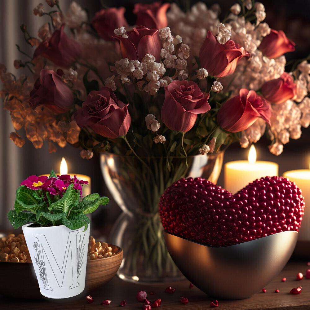 Der Blumentopf mit dem Buchstaben 'M' ist eine künstlerische Leinwand für jeden Kunstliebhaber. Das feine Linienmuster zeigt den Buchstaben 'M', dekoriert mit aquarellartigen Blumen und zarten Blättern. Der weiße Hintergrund betont das kunstvolle Design, Hinweise: Material: Keramik / Höhe: ca. 10 cm, Durchmesser oben: ca. 9cm / Mit Bodenloch zur Vermeidung von Staunässe.